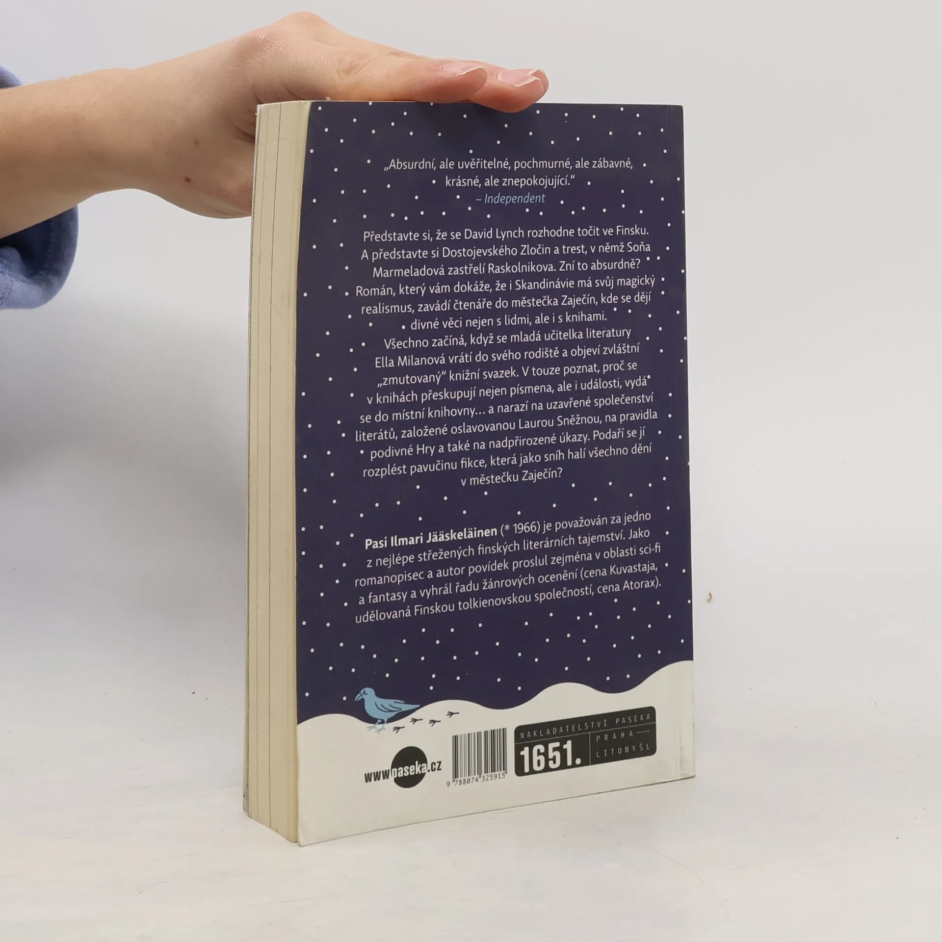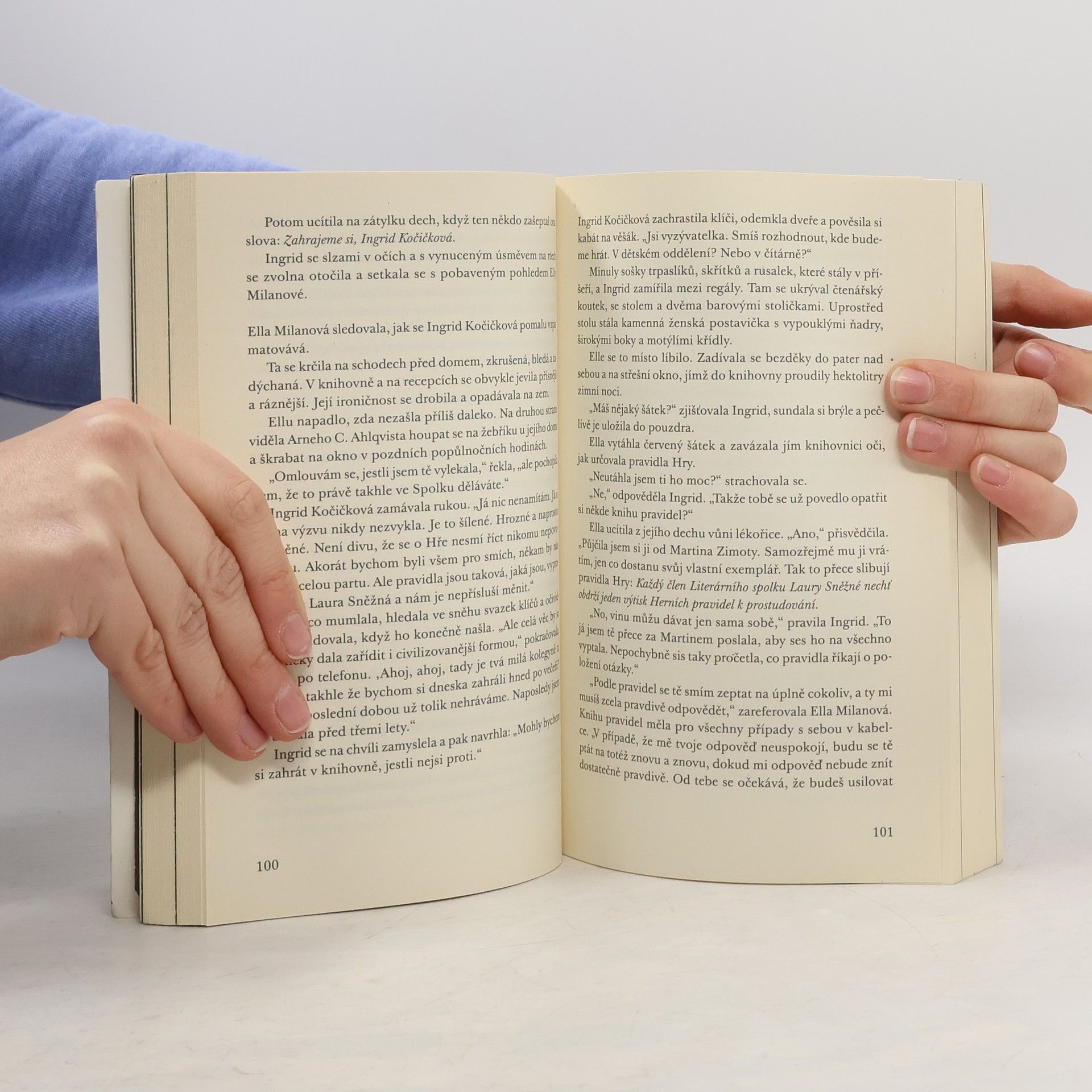 Představte si Lynchův Twin Peaks zasazený do Finska. A představte si Dostojevského Zločin a trest, v němž Soňa Marmeladová zastřelí Raskolnikova. Zní to absurdně? Román, který vám dokáže, že i Skandinávie má svůj magický realismus, zavádí čtenáře do městečka Zaječín, kde se dějí divné věci nejen s lidmi, ale i s knihami. Všechno začíná, když se mladá učitelka literatury Ella Milanová vrátí do svého rodiště a objeví tam zvláštní knižní svazek, který jí vyrazí dech. V místní knihovně se vydá po stopě záhadných událostí... a brzy narazí na uzavřené společenství literátů, založené oslavovanou Laurou Sněžnou, na pravidla podivné Hry a také na nadpřirozené úkazy. Podaří se jí odhalit, co se ve skutečnosti stalo s desátým členem literárního spolku, a rozplést pavučinu všeprostupující fikce?