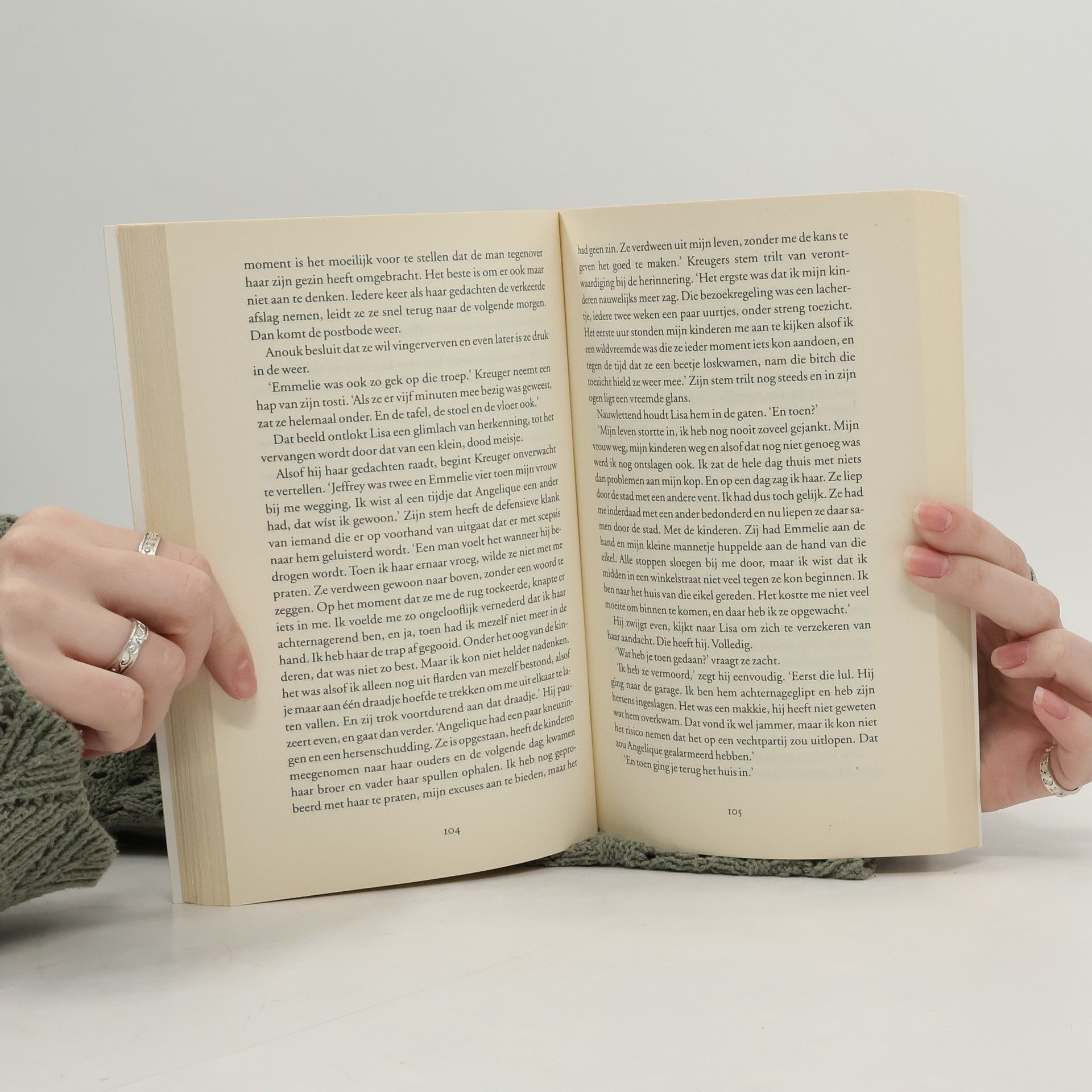 Als Lisa in haar achtertuin de was ophangt staat er ineens een ontsnapte tbs'er voor haar neus. Vluchten is geen optie omdat ze het leven van haar zesjarige dochter Anouk niet in gevaar wil brengen. Er volgt een angstaanjagende en zenuwslopende week waarin moeder en dochter gegijzeld worden in hun eigen huis. Lisa zint op een ontsnappingspoging maar heeft weinig bewegingsvrijheid. Het enige waar ze op kan rekenen is haar inlevingsvermogen, fantasie en mensenkennis. Maar is dat genoeg om het er levend vanaf te brengen? Senta is journalist en is met haar auto verdwaald in de mist. Als ze besluit aan te bellen bij een dijkhuisje, wordt er niet opengedaan. Ze loopt om het huis heen en ziet tot haar schrik dat daarbinnen een vrouw met een mes wordt bedreigd. Ze vlucht, maar terwijl ze op zoek gaat naar hulp overkomt haar iets vreselijks...
