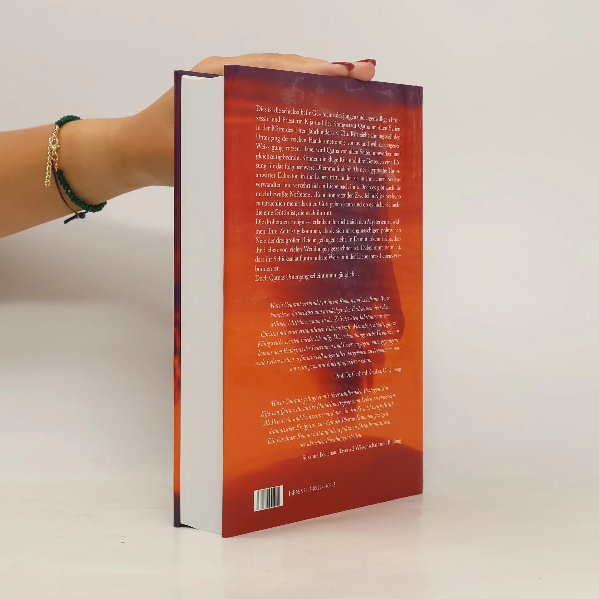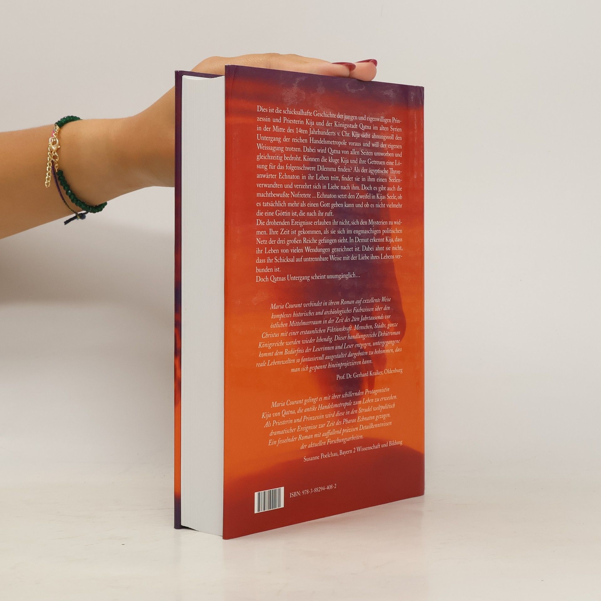 Der Roman „Qatna“ erzählt die Geschichte der Prinzessin Kija im alten Syrien des 14. Jh.s v. Chr., die den Untergang ihrer Stadt voraussieht und sich in den ägyptischen Thronanwärter Echnaton verliebt. Die Autorin Maria Courant nutzt historische Quellen und archäologische Funde, um die dramatische Handlung zu gestalten.