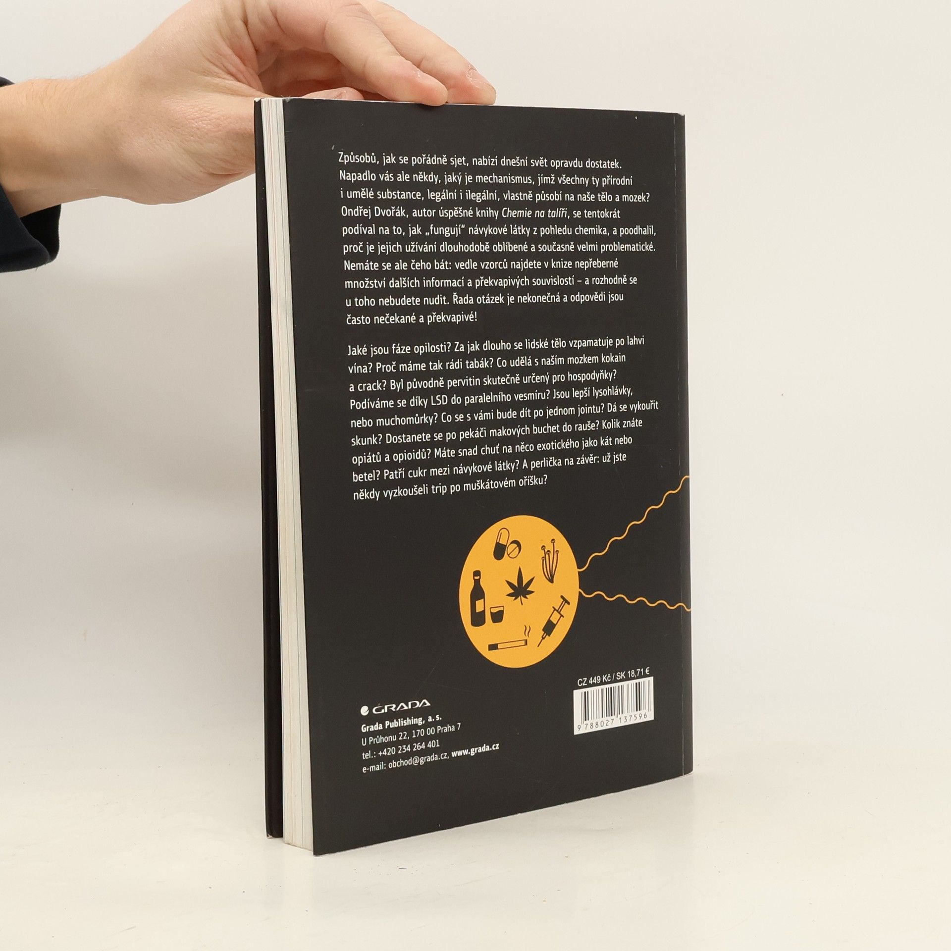 Způsobů, jak se pořádně sjet, nabízí dnešní svět opravdu dostatek. Napadlo vás ale někdy, jaký je mechanismus, jímž všechny ty přírodní i umělé substance, legální i ilegální, vlastně působí na naše tělo a mozek? Ondřej Dvořák, autor úspěšné knihy Chemie na talíři, se tentokrát podíval na to, jak „fungují“ návykové látky z pohledu chemika, a poodhalil, proč je jejich užívání dlouhodobě oblíbené a současně velmi problematické. Řada otázek je nekonečná a odpovědi jsou často nečekané a překvapivé!Jaké jsou fáze opilosti? Za jak dlouho se lidské tělo vzpamatuje po lahvi vína? Proč máme tak rádi tabák? Co udělá s naším mozkem kokain a crack? Byl původně pervitin skutečně určený pro hospodyňky? Podíváme se díky LSD do paralelního vesmíru? Jsou lepší lysohlávky, nebo muchomůrky? Co se s vámi bude dít po jednom jointu? Dá se vykouřit skunk? Dostanete se po pekáči makových buchet do rauše? Kolik znáte opiátů a opioidů? Jaký koktejl léků si namícháte na víkend? Máte snad chuť na něco exotického jako kát nebo betel? Patří cukr mezi návykové látky? A perlička na závěr: už jste někdy vyzkoušeli trip po muškátovém oříšku?