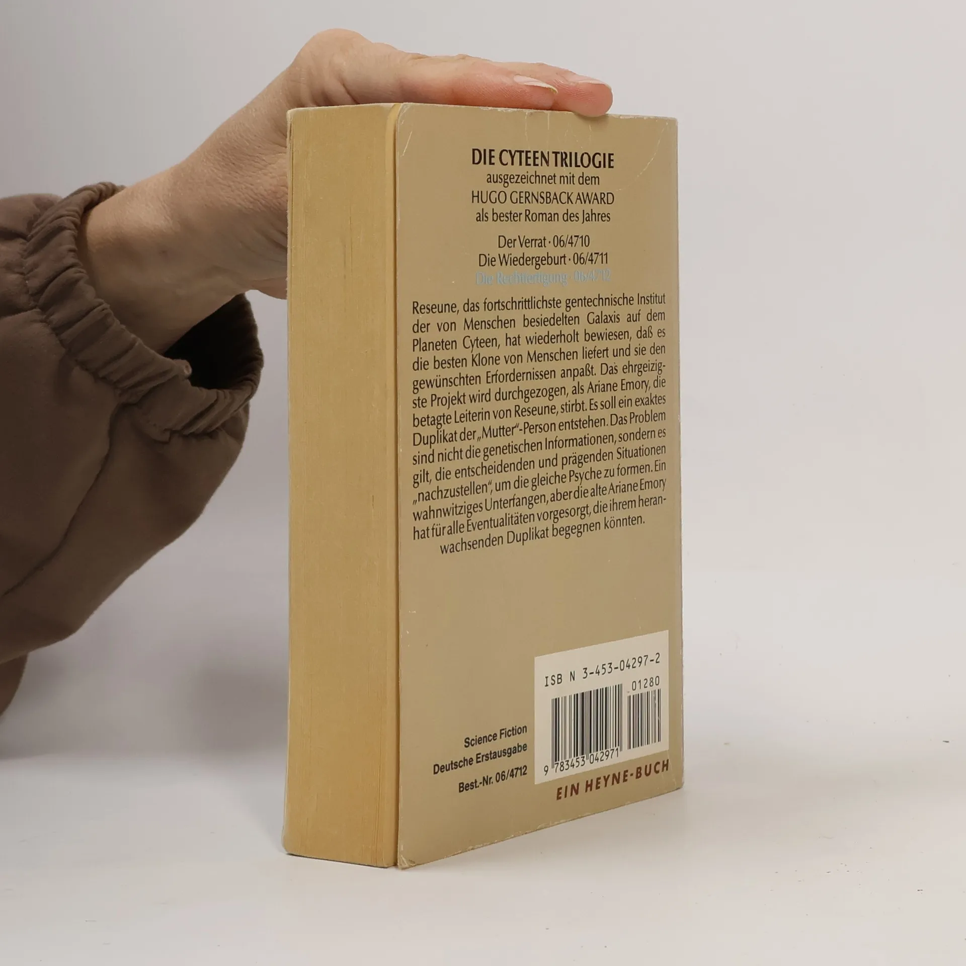 DIE CYTEEN TRILOGIE ausgezeichnet mit dem HUGO GERNSBACKAWARD als bester Roman des Jahres Der Verrat 06/4710 Die Wiedergeburt. 06/4711 Die Rechtfertigung. 06/4712 Reseune, das fortschrittlichste gentechnische Institut der von Menschen besiedelten Galaxis auf dem Planeten Cyteen, hat wiederholt bewiesen, dass es die besten Klone von Menschen liefert und sie den gewünschten Erfordernissen anpasst. Das ehrgeizigste Projekt wird durchgezogen, als Ariane Emory, die betagte Leiterin von Reseune, stirbt. Es soll ein exaktes Duplikat der »Mutter«-Person entstehen. Das Problem sind nicht die genetischen Informationen, sondern es gilt, die entscheidenden und prägenden Situationen »nachzustellen« um die gleiche Psyche zu formen. Ein wahnwitziges Unterfangen, aber die alte Ariane Emory hat für alle Eventualitäten vorgesorgt, die ihrem heranwachsenden Duplikat begegnen könnten.