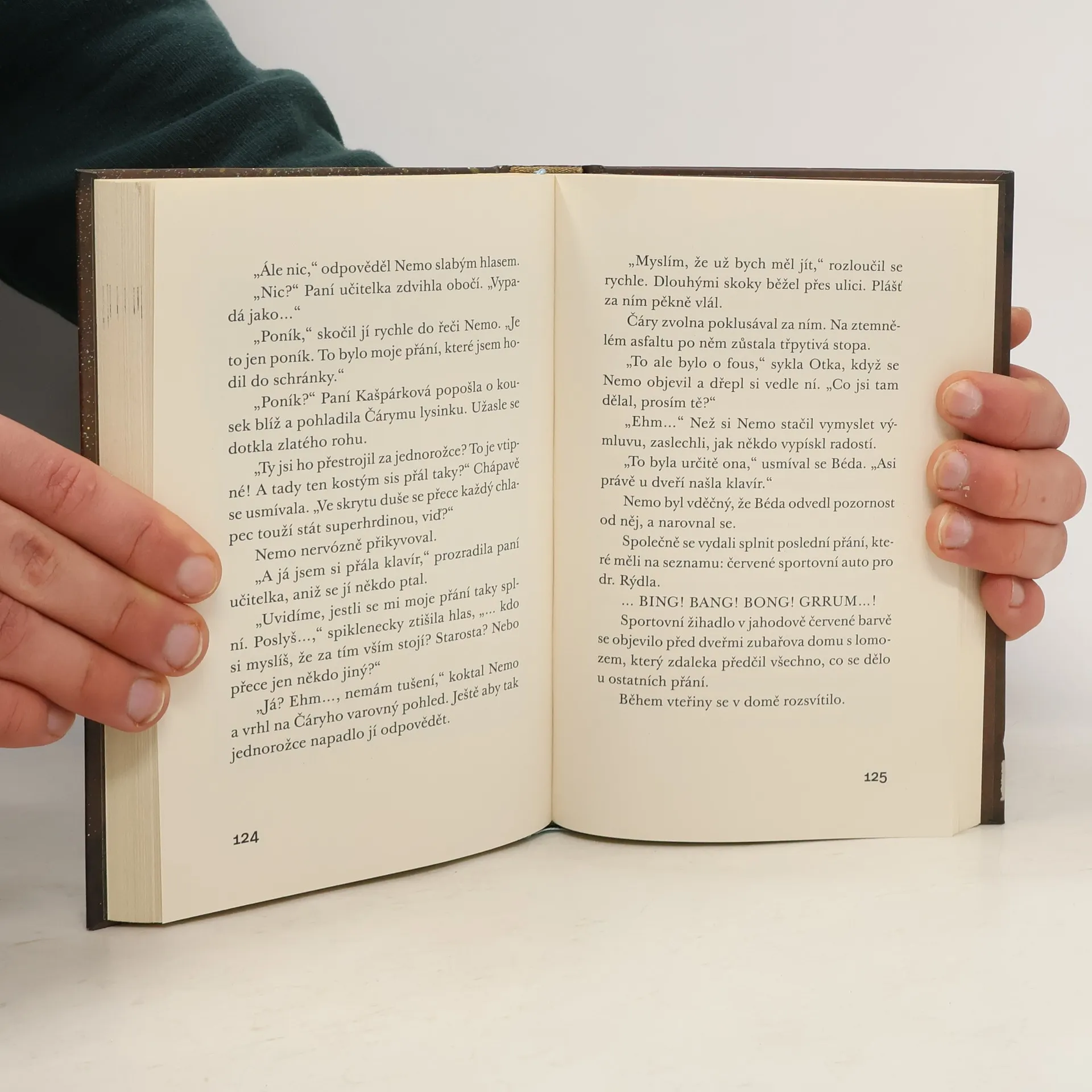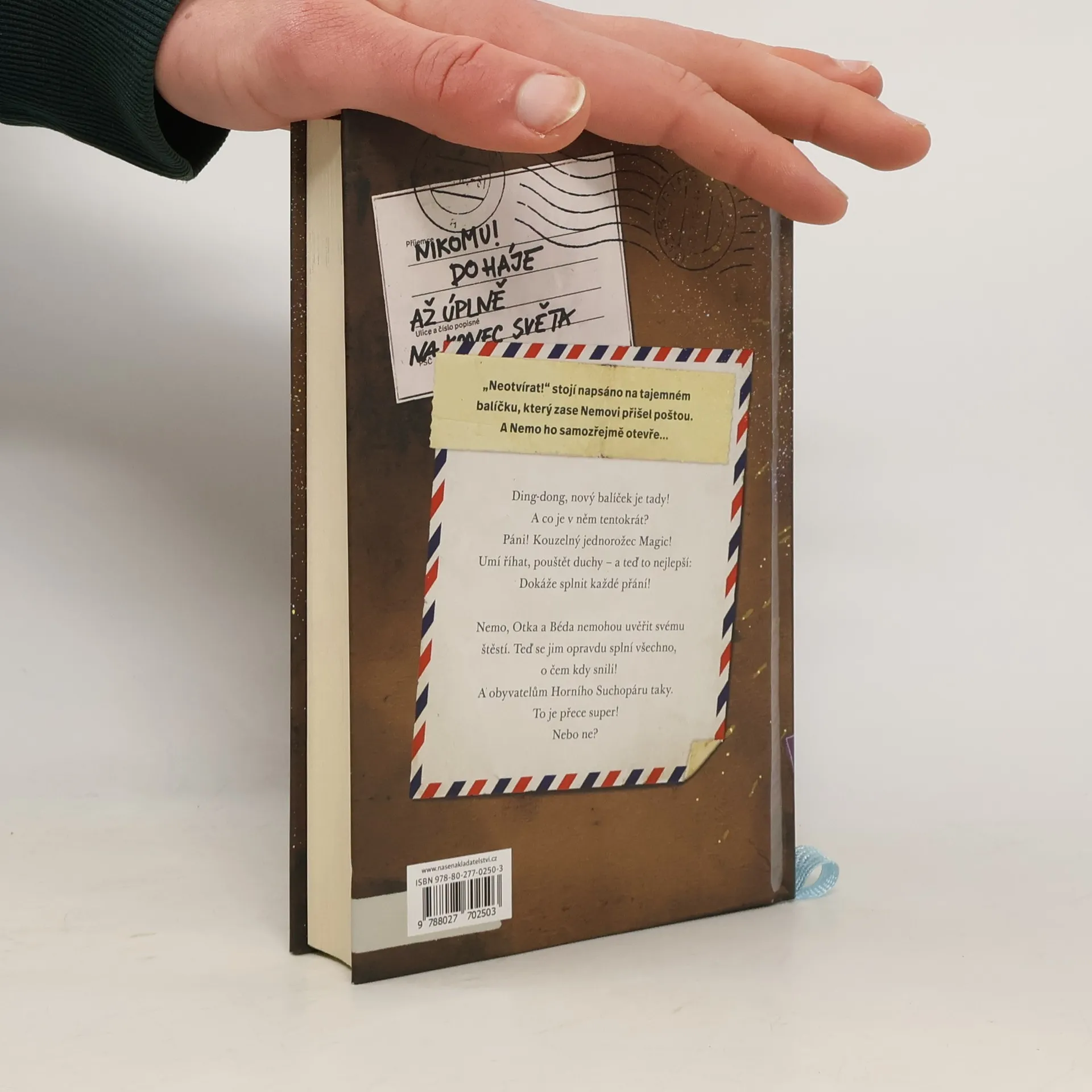 Ding-dong, nový balíček je tady! A co je v něm tentokrát? Páni! Kouzelný jednorožec Magic! Umí říhat, pouštět duchy – a teď to nejlepší: Dokáže splnit každé přání! Nemo, Otka a Béda nemohou uvěřit svému štěstí. Teď se jim opravdu splní všechno, o čem kdy snili! A obyvatelům Horního Suchopáru taky. To je přece super! Nebo ne? Pátý příběh z oblíbené série dobrodružství pro děti přináší spoustu překvapení i spoustu otázek: Jak si naši tři hrdinové Nemo, Otka a Béda poradí s tvrdohlavým jednorožcem? Podaří se jim ho přivést tam, kam patří, a Hornímu Suchopáru vrátit klid? Kdo bude nový starosta? A co všechna splněná přání? Poutavé vyprávění o dětském přátelství ve světě dospělých by nebylo úplné bez kouzelných obrázků Fréderica Betranda. I rodiče se při čtení na dobrou noc možná trochu zasní...