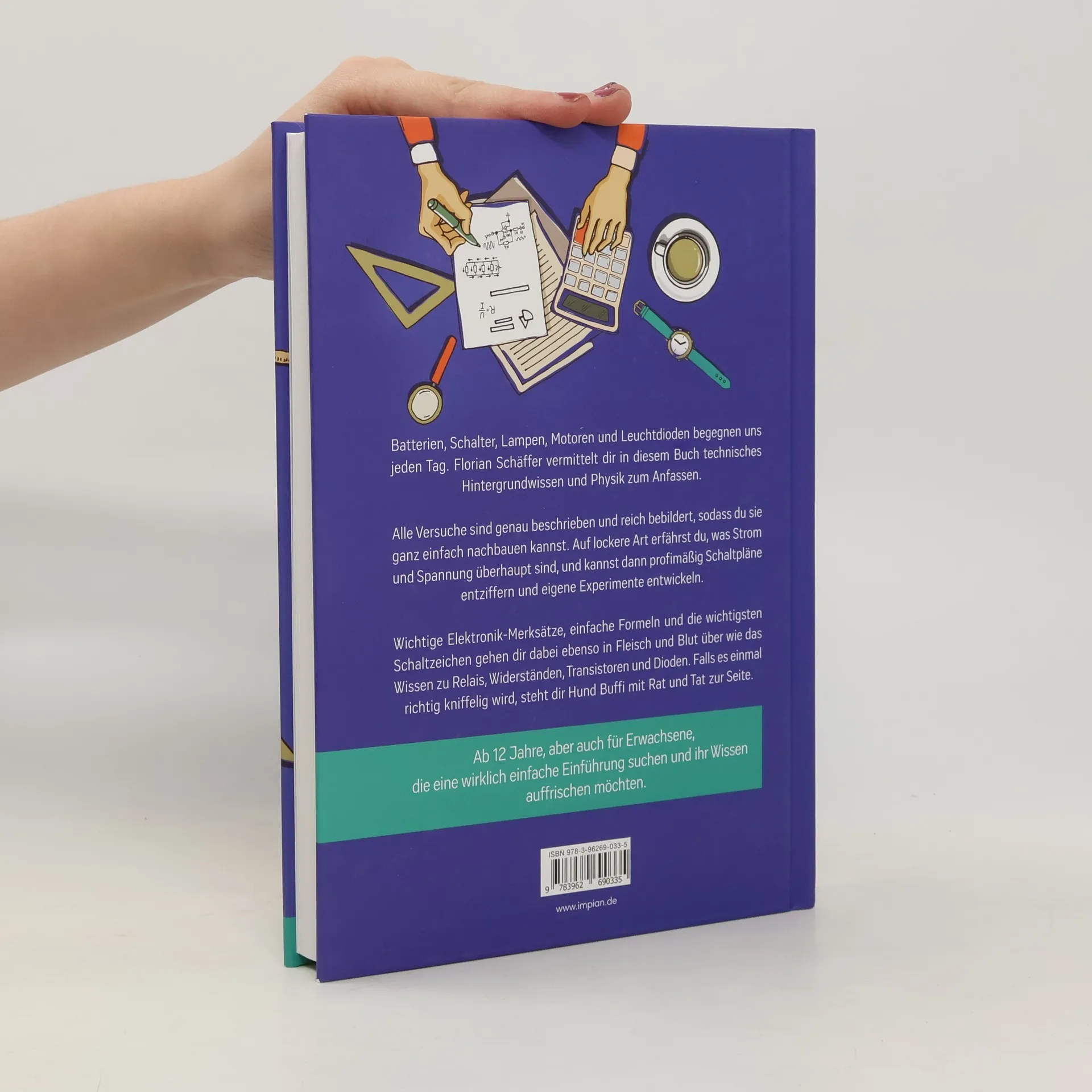 In diesem Buch von Florian Schäffer lernst du durch zahlreiche Experimente und anschauliche Erklärungen die Grundlagen der Elektronik. Du baust Projekte wie Zitronenbatterien und Lügendetektoren nach und verstehst Strom und Spannung. Wichtige Merksätze und Schaltzeichen werden ebenfalls vermittelt, unterstützt von Hund Buffi.