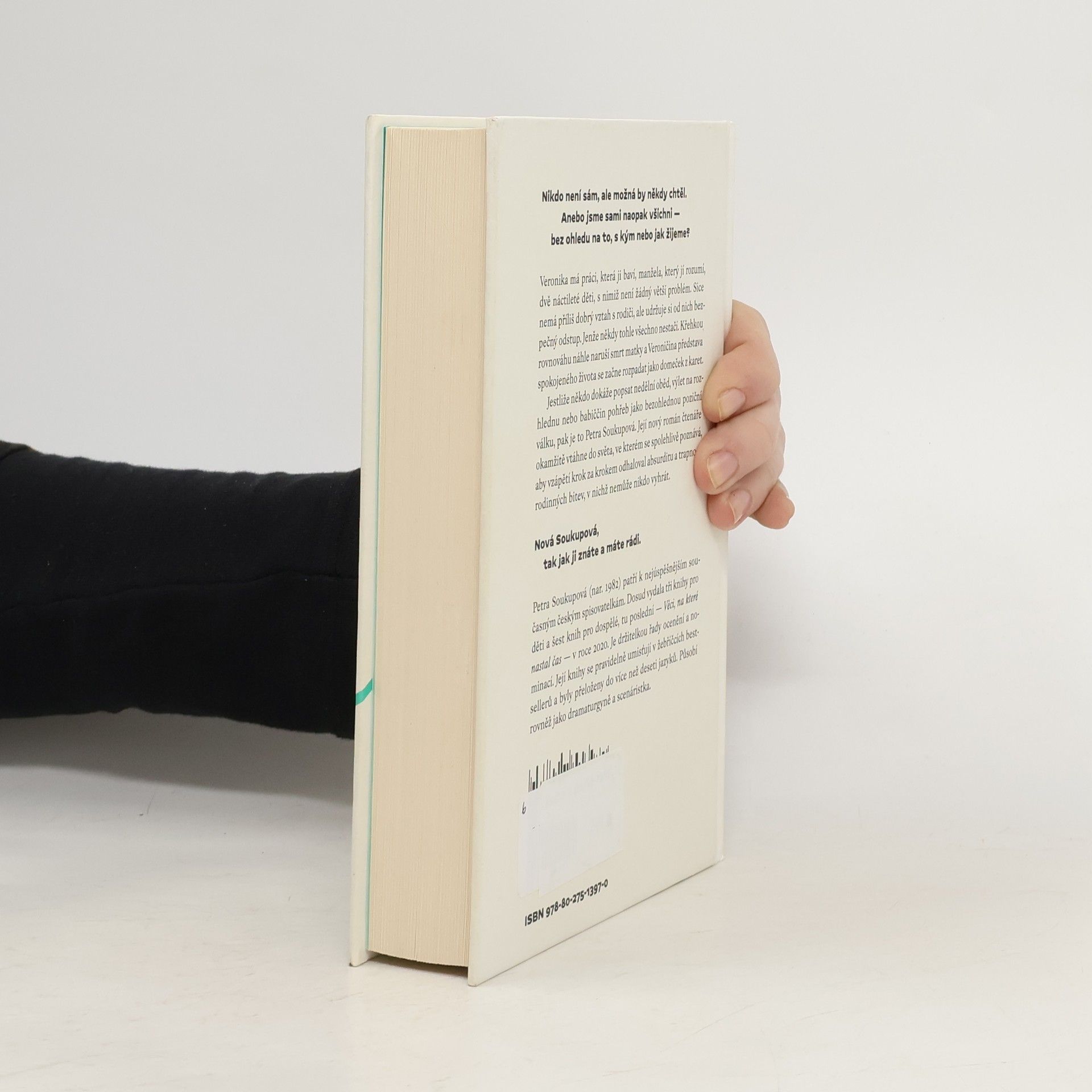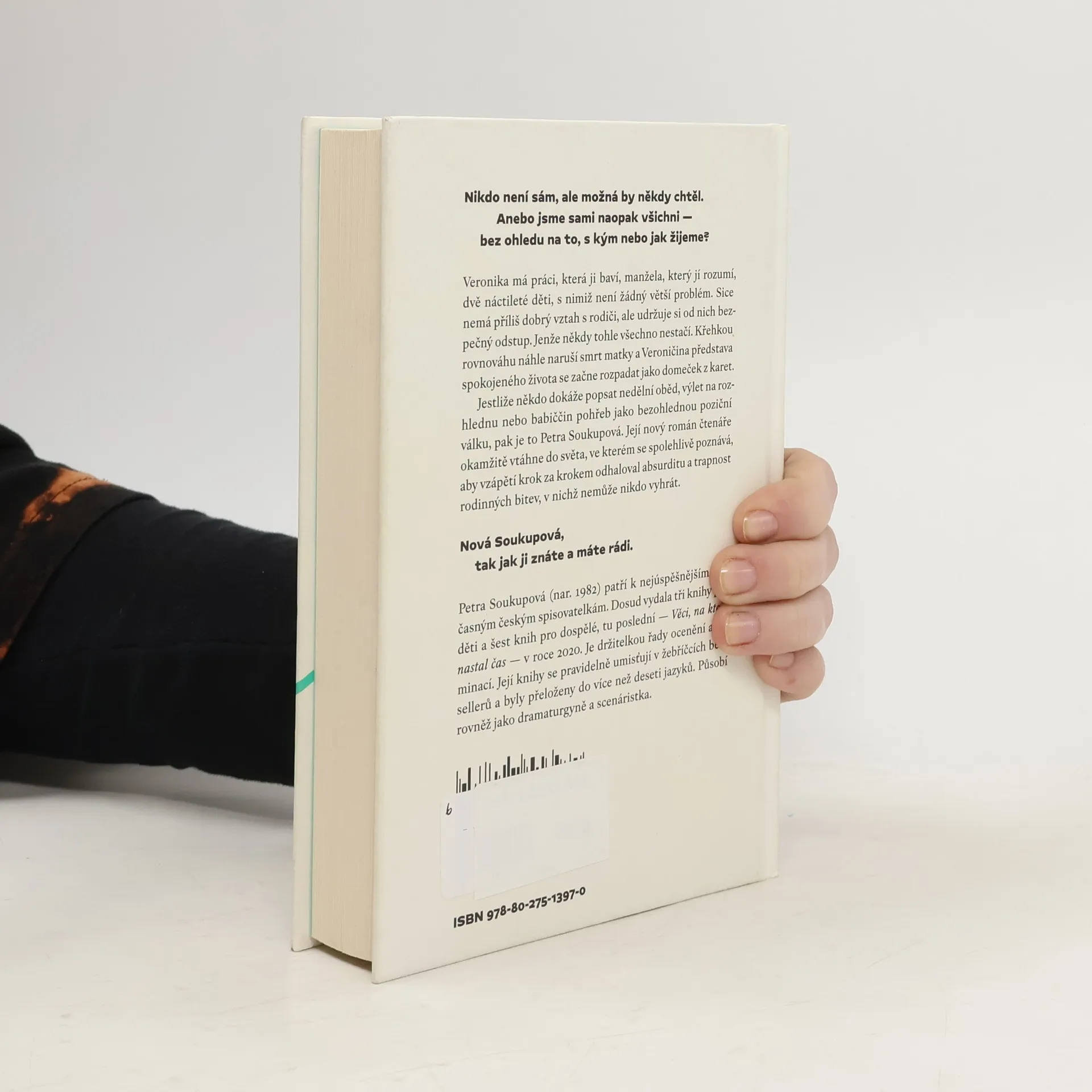 Nikdo není sám, ale možná by někdy chtěl. Anebo jsme sami naopak všichni — bez ohledu na to, s kým nebo jak žijeme?Veronika má práci, která ji baví, manžela, který jí rozumí, dvě náctileté děti, s nimiž není žádný větší problém. Sice nemá příliš dobrý vztah s rodiči, ale udržuje si od nich bezpečný odstup. Jenže někdy tohle všechno nestačí. Křehkou rovnováhu náhle naruší smrt matky a Veroničina představa spokojeného života se začne rozpadat jako domeček z karet.Jestliže někdo dokáže popsat nedělní oběd, výlet na rozhlednu nebo babiččin pohřeb jako bezohlednou poziční válku, pak je to Petra Soukupová. Její nový román čtenáře okamžitě vtáhne do světa, ve kterém se spolehlivě poznává, aby vzápětí krok za krokem odhaloval absurditu a trapnost rodinných bitev, v nichž nemůže nikdo vyhrát.Nová Soukupová, tak jak ji znáte a máte rádi.