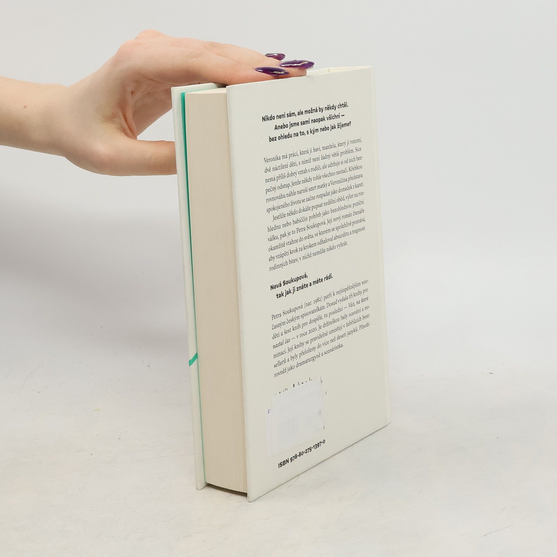 Nikdo není sám, ale možná by někdy chtěl. Anebo jsme sami naopak všichni — bez ohledu na to, s kým nebo jak žijeme?Veronika má práci, která ji baví, manžela, který jí rozumí, dvě náctileté děti, s nimiž není žádný větší problém. Sice nemá příliš dobrý vztah s rodiči, ale udržuje si od nich bezpečný odstup. Jenže někdy tohle všechno nestačí. Křehkou rovnováhu náhle naruší smrt matky a Veroničina představa spokojeného života se začne rozpadat jako domeček z karet.Jestliže někdo dokáže popsat nedělní oběd, výlet na rozhlednu nebo babiččin pohřeb jako bezohlednou poziční válku, pak je to Petra Soukupová. Její nový román čtenáře okamžitě vtáhne do světa, ve kterém se spolehlivě poznává, aby vzápětí krok za krokem odhaloval absurditu a trapnost rodinných bitev, v nichž nemůže nikdo vyhrát.Nová Soukupová, tak jak ji znáte a máte rádi.