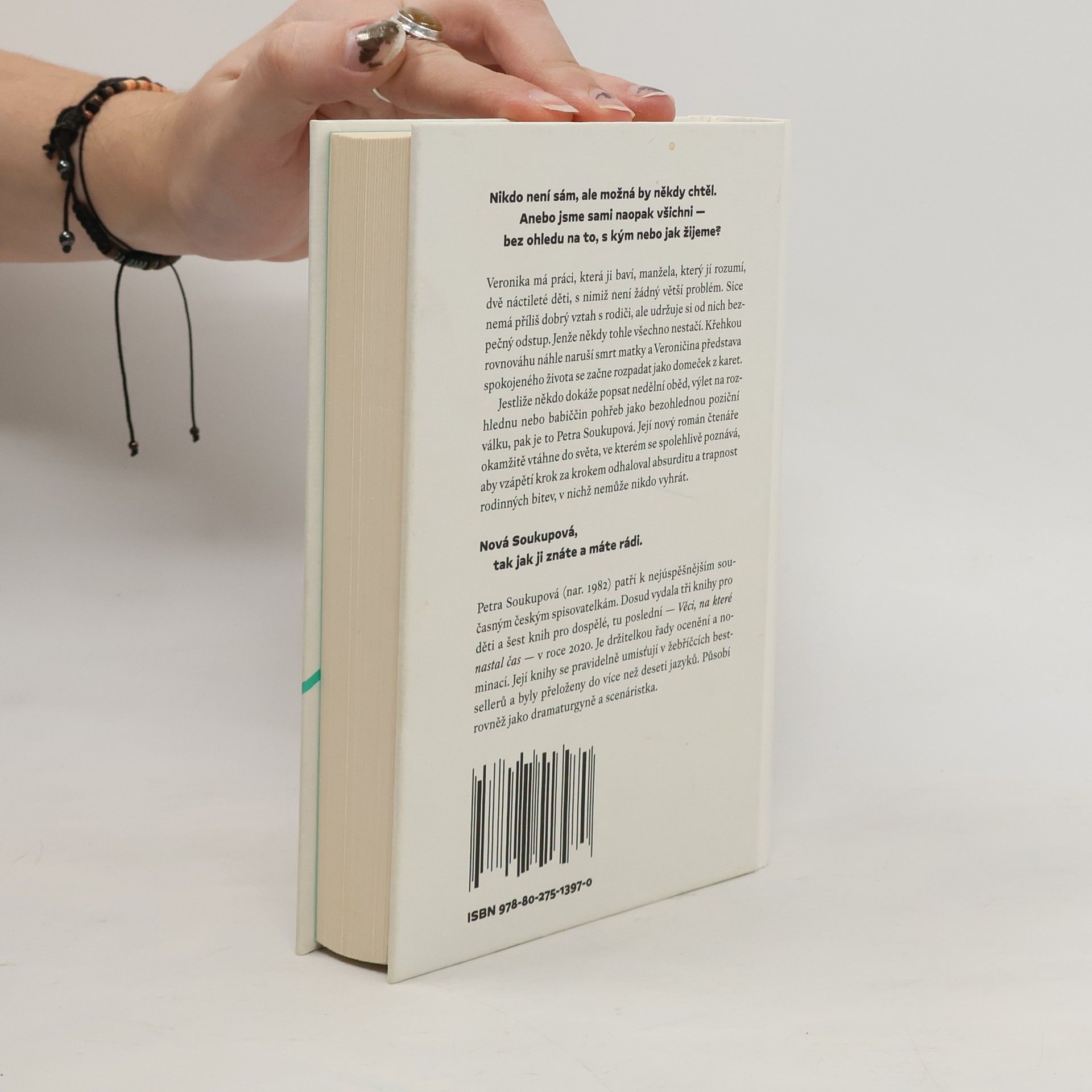 Nikdo není sám, ale možná by někdy chtěl. Anebo jsme sami naopak všichni — bez ohledu na to, s kým nebo jak žijeme?Veronika má práci, která ji baví, manžela, který jí rozumí, dvě náctileté děti, s nimiž není žádný větší problém. Sice nemá příliš dobrý vztah s rodiči, ale udržuje si od nich bezpečný odstup. Jenže někdy tohle všechno nestačí. Křehkou rovnováhu náhle naruší smrt matky a Veroničina představa spokojeného života se začne rozpadat jako domeček z karet.Jestliže někdo dokáže popsat nedělní oběd, výlet na rozhlednu nebo babiččin pohřeb jako bezohlednou poziční válku, pak je to Petra Soukupová. Její nový román čtenáře okamžitě vtáhne do světa, ve kterém se spolehlivě poznává, aby vzápětí krok za krokem odhaloval absurditu a trapnost rodinných bitev, v nichž nemůže nikdo vyhrát.Nová Soukupová, tak jak ji znáte a máte rádi.