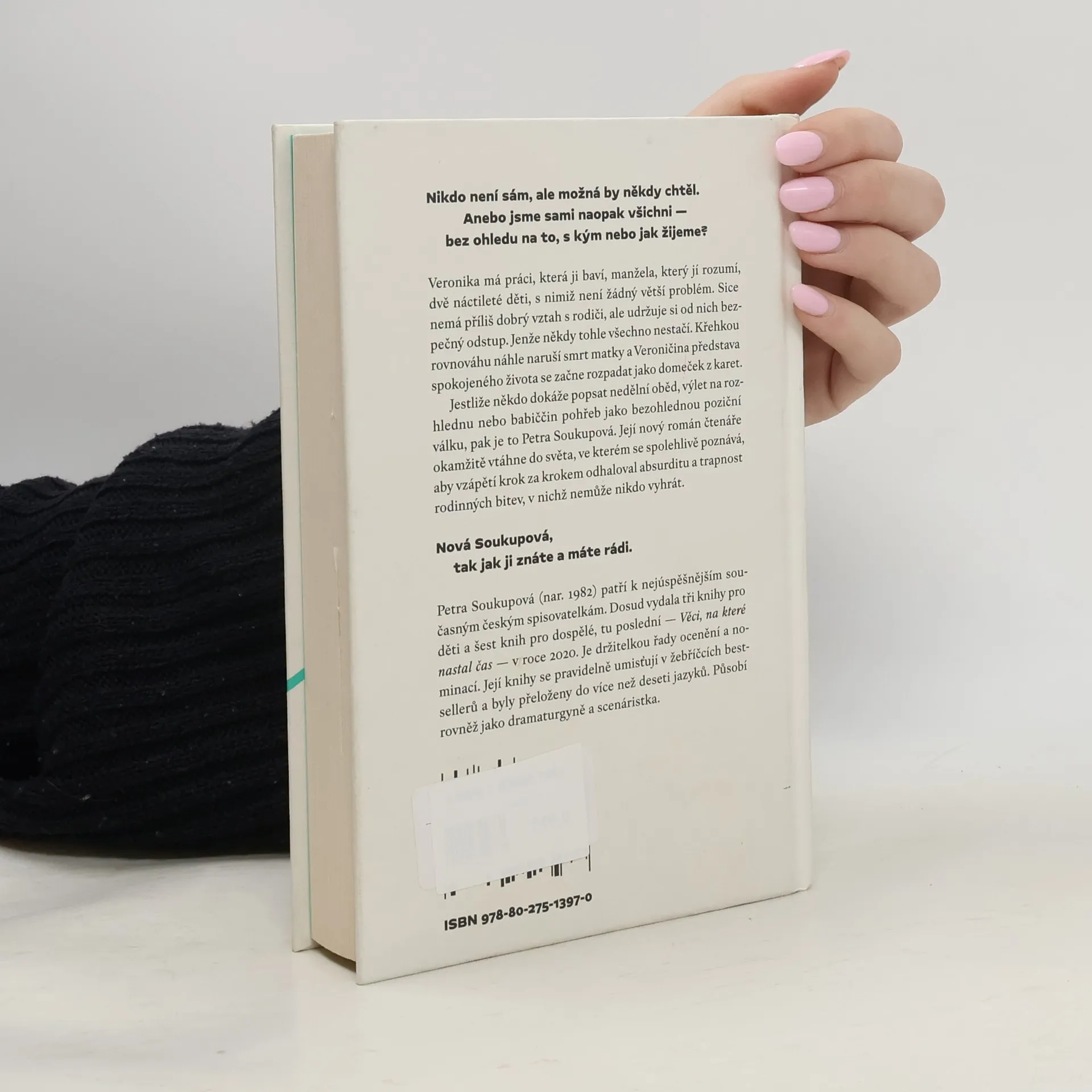 Nikdo není sám, ale možná by někdy chtěl. Anebo jsme sami naopak všichni — bez ohledu na to, s kým nebo jak žijeme?Veronika má práci, která ji baví, manžela, který jí rozumí, dvě náctileté děti, s nimiž není žádný větší problém. Sice nemá příliš dobrý vztah s rodiči, ale udržuje si od nich bezpečný odstup. Jenže někdy tohle všechno nestačí. Křehkou rovnováhu náhle naruší smrt matky a Veroničina představa spokojeného života se začne rozpadat jako domeček z karet.Jestliže někdo dokáže popsat nedělní oběd, výlet na rozhlednu nebo babiččin pohřeb jako bezohlednou poziční válku, pak je to Petra Soukupová. Její nový román čtenáře okamžitě vtáhne do světa, ve kterém se spolehlivě poznává, aby vzápětí krok za krokem odhaloval absurditu a trapnost rodinných bitev, v nichž nemůže nikdo vyhrát.Nová Soukupová, tak jak ji znáte a máte rádi.