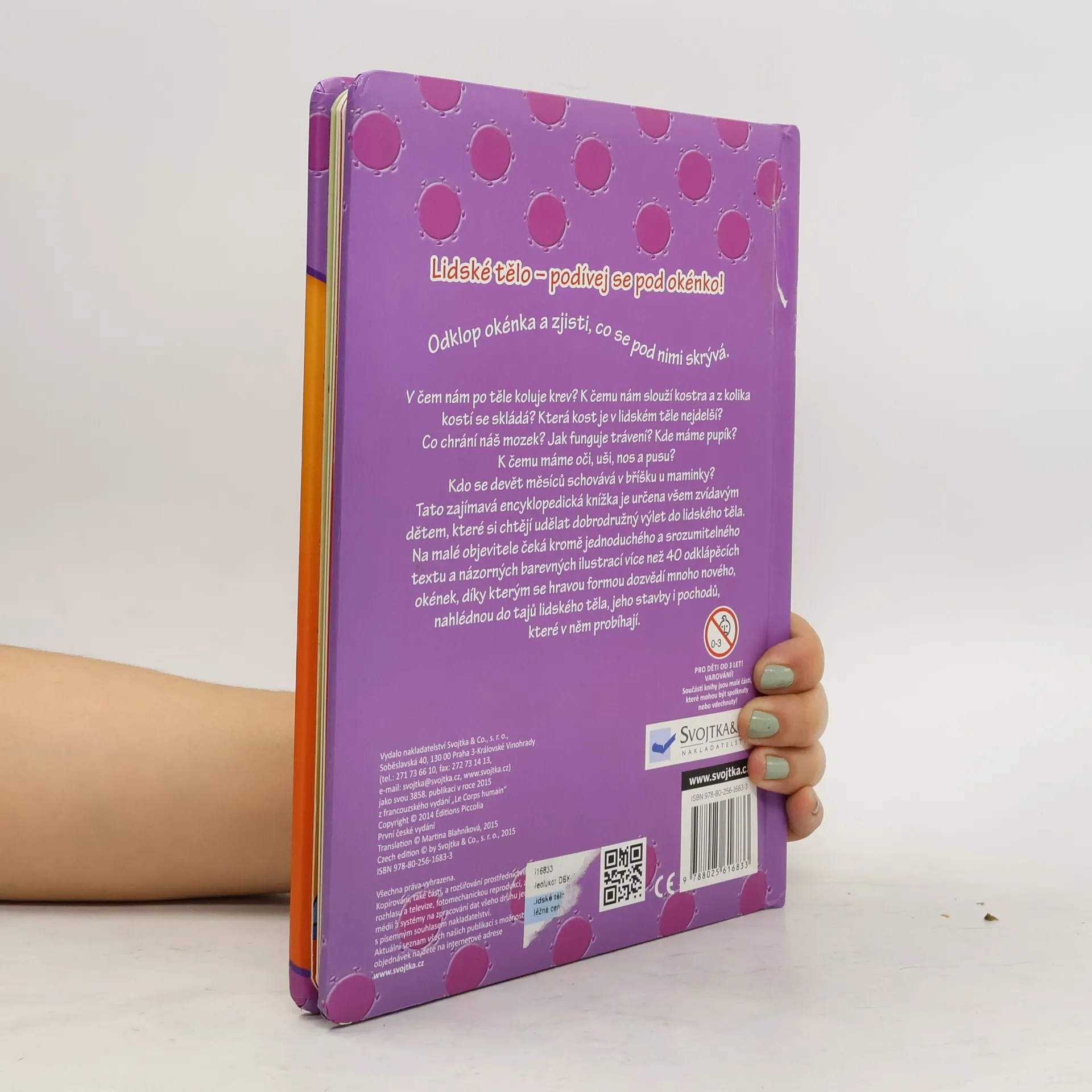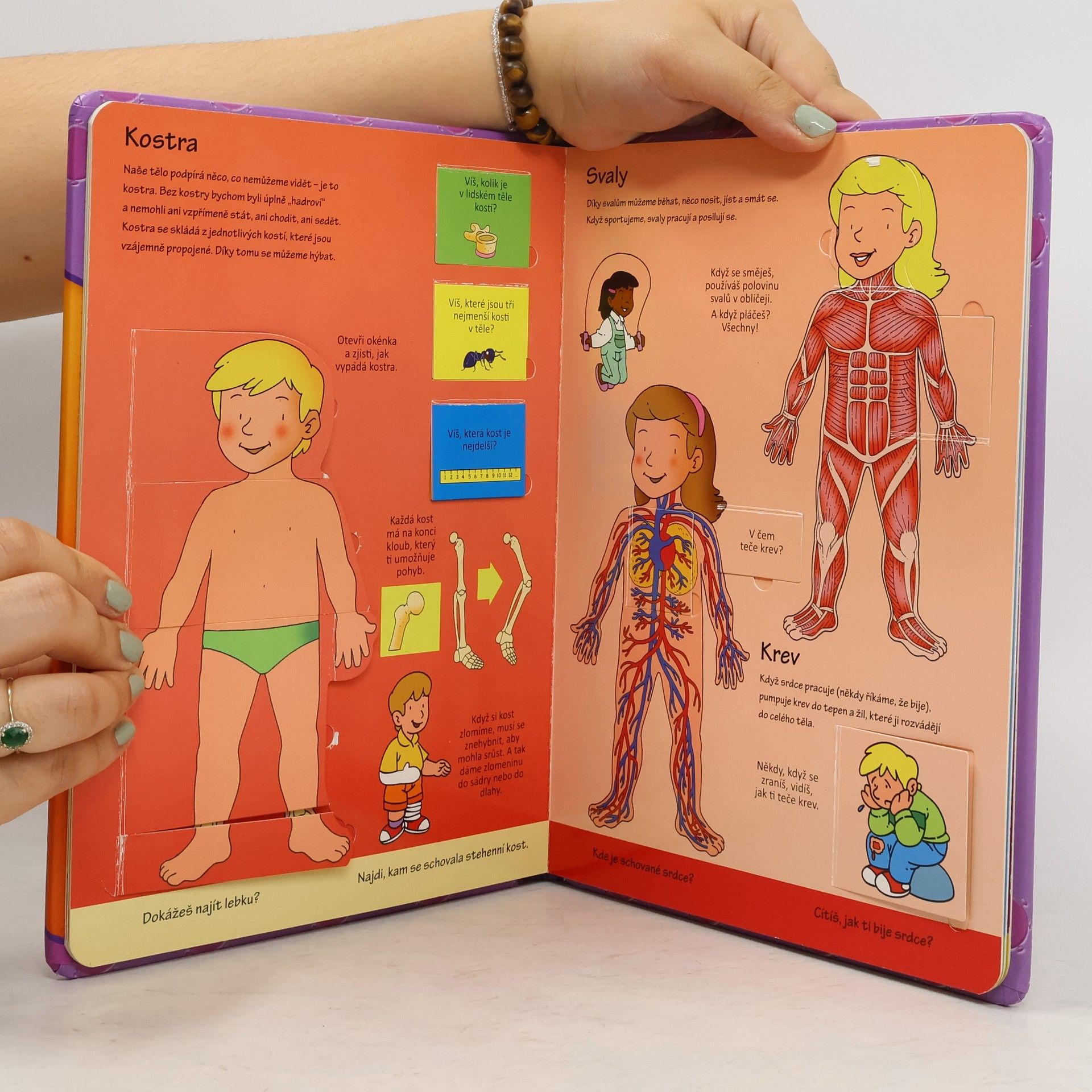 V čem nám po těle koluje krev? K čemu nám slouží kostra a z kolika kostí se skládá? Která kost je v lidském těle nejdelší? Co chrání náš mozek? Jak funguje trávení? Kdo se devět měsíců schovává v bříšku u maminky? Tato zajímavá encyklopedická knížka je určena všem zvídavým dětem, které si chtějí udělat dobrodružný výlet do lidského těla. Na malé objevitele čeká kromě jednoduchého a srozumitelného textu a názorných barevných ilustrací více než 40 odklápěcích okének, díky kterým se hravou formou dozvědí mnoho nového a nahlédnou do tajů lidského těla, jeho stavby i pochodů, které v něm probíhají.