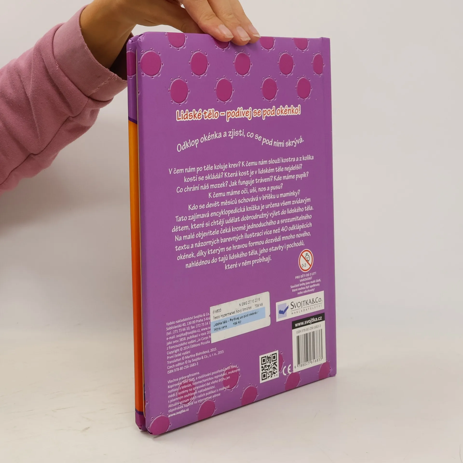 V čem nám po těle koluje krev? K čemu nám slouží kostra a z kolika kostí se skládá? Která kost je v lidském těle nejdelší? Co chrání náš mozek? Jak funguje trávení? Kdo se devět měsíců schovává v bříšku u maminky? Tato zajímavá encyklopedická knížka je určena všem zvídavým dětem, které si chtějí udělat dobrodružný výlet do lidského těla. Na malé objevitele čeká kromě jednoduchého a srozumitelného textu a názorných barevných ilustrací více než 40 odklápěcích okének, díky kterým se hravou formou dozvědí mnoho nového a nahlédnou do tajů lidského těla, jeho stavby i pochodů, které v něm probíhají.