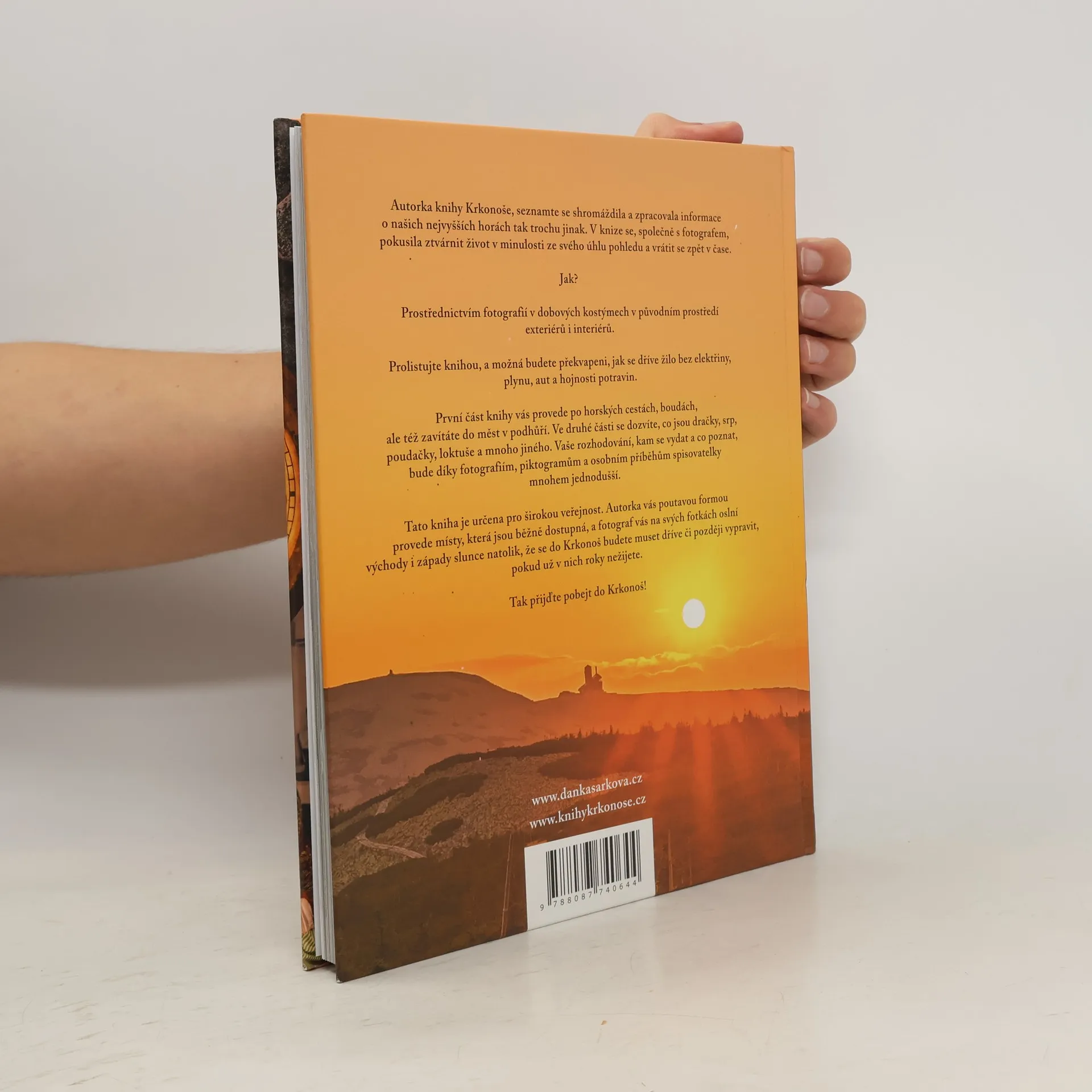 Autorka knihy Krkonoše, seznamte se! shromáždila a zpracovala informace o našich nejvyšších horách tak trochu jinak. V knize se, společně s fotografem, pokusila ztvárnit život v minulosti ze svého úhlu pohledu a vrátit se zpět v čase.Jak?Prostřednictvím fotografií v dobových kostýmech v původním prostředí exteriérů i interiérů.Prolistujte knihou, a možná budete překvapeni, jak se dříve žilo bez elektřiny, plynu, aut a hojnosti potravin.První část knihy vás provede po horských cestách, boudách, ale též zavítáte do měst v podhůří. Ve druhé části se dozvíte, co jsou dračky, srp, poudačky, loktuše a mnoho jiného. Vaše rozhodování, kam se vydat a co poznat, bude díky fotografiím, piktogramům a osobním příběhům autorky mnohem jednodušší.Tato kniha je určena pro širokou veřejnost. Autorka vás poutavou formou provede do míst, která jsou běžně dostupná, a fotograf vás na svých fotkách oslní východy i západy slunce natolik, že se do Krkonoš budete muset dříve či později vypravit, pokud už v nich roky nežijete.Tak přijďte pobejt do Krkonoš!