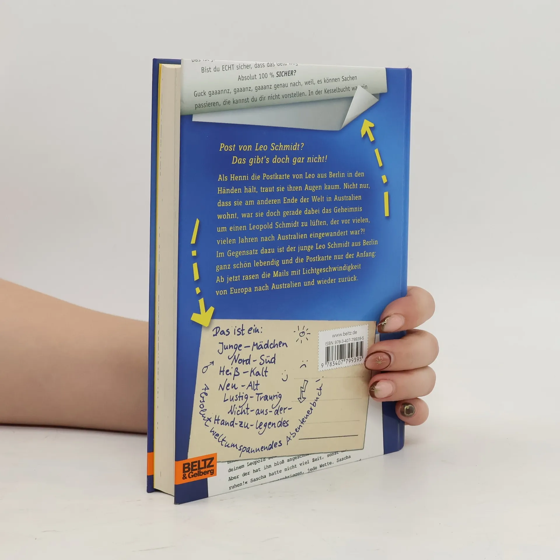 Henni in Australien und Leo in Berlin werden Freunde über E-Mails. Als Henni eine Postkarte von Leo erhält, beginnt ihr gemeinsames Abenteuer, das Geheimnis um den alten Leopold Schmidt zu lüften. Sie tauschen Alltagserlebnisse, Cartoons und Zeichnungen aus und erkennen, dass Nähe oft überraschend entsteht.