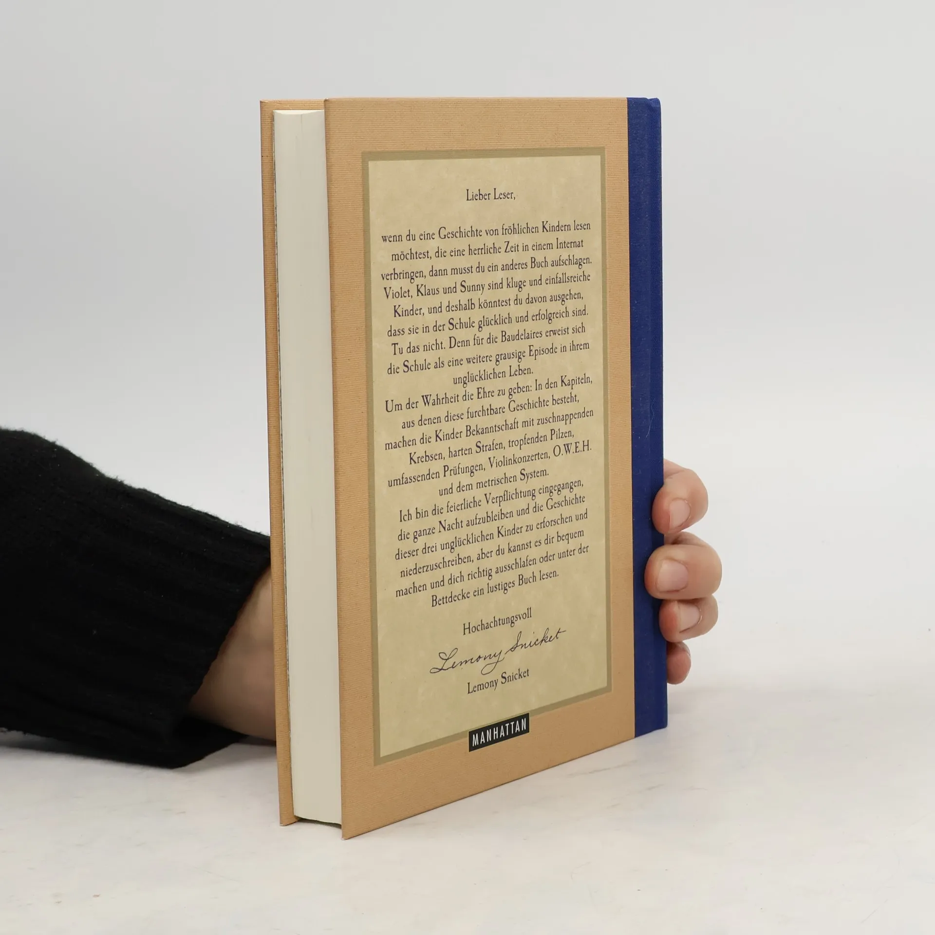 Das Unglück nimmt seinen Lauf - der scheußliche Graf Olaf ist den drei Baudelaire-Waisen weiterhin dicht auf den Fersen, um ihnen ihr Erbe abzujagen. Erst spürt er sie in der Sägemühle Glück & Partner auf, wo Violet, Klaus und Sunny wie die Sklaven schuften müssen. Dann kommen die armen Kinder in ein grauenhaftes Internat, in dem sie nicht nur vom zynischen stellvertretenden Direktor Nero schikaniert, sondern auch von Graf Olaf drangsaliert werden, der sich als Sportlehrer Dschingis in die Schule eingeschlichen hat. Und schließlich werden sie von Mr und Mrs Elend adoptiert, zwei ahnungslosen Erwachsenen, die weder willens noch in der Lage sind, die drei Waisenkinder vor Graf Olaf, diesmal in der Rolle eines Auktionators im Nadelstreifenanzug, zu schützen. Wir fragen Sie: Wer will das lesen? Wer will davon erfahren, wie drei unschuldige, wohlerzogene und charmante Kinder vergeblich vor den teuflischen Intrigen eines widerlichen, geldgierigen und skrupellosen Bösewichtes zu entkommen versuchen? Gleich drei Bände voller betrüblicher Ereignisse auf einmal: Wenn das keine Zumutung ist. Aber sagen Sie später nicht, wir hätten Sie nicht gewarnt!
