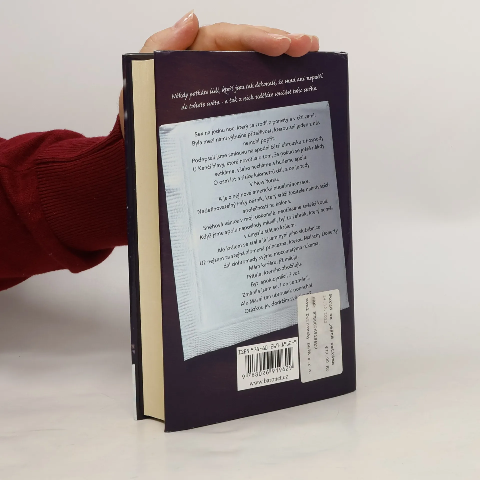 Sex na jednu noc, který se zrodil z pomsty a v cizí zemi. Byla mezi námi výbušná přitažlivost, kterou ani jeden z nás nemohl popřít. Podepsali jsme smlouvu na spodní části ubrousku hospody U Kančí hlavy, která hovořila o tom, že pokud se ještě někdy setkáme, všeho necháme a budeme spolu. O osm let a tisíce kilometrů dál, a on je tady. V New Yorku. A je z něj nová americká hudební senzace. Nedefinovatelný irský básník, který sráží ředitele nahrávacích společností na kolena. Sněhová vánice v mojí dokonalé, neotřesené sněhové kouli. Když jsme spolu naposledy mluvili, byl to žebrák, který neměl v úmyslu stát se králem. Ale králem se stal a já jsem nyní jeho služebnice. Už nejsem ta stejná zlomená princezna, kterou Malachy Doherty dal dohromady svýma mozolnatýma rukama. Mám kariéru, jíž miluju. Přítele, kterého zbožňuju. Byt, spolubydlící, život. Změnila jsem se. I on se změnil. Ale Mal si ten ubrousek ponechal. Otázkou je, dodržím své slovo?