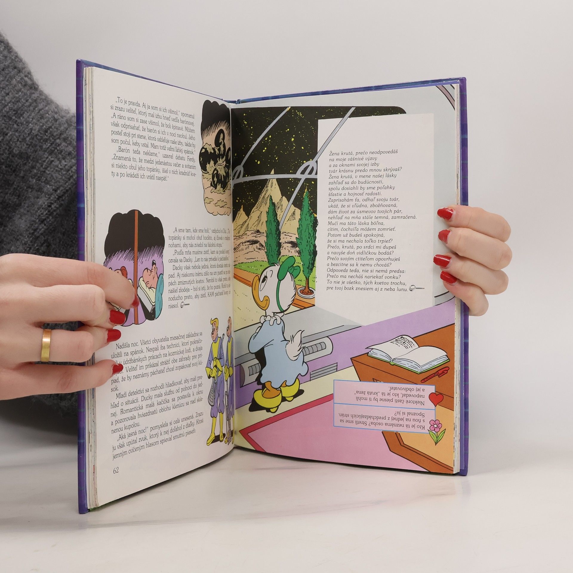 Túto zvláštnu knihu možno čítať dvojakým spôsobom. Kto sa chce len pobaviť, nájde tu tri trošku zábavné a trošku záhadné detektívne príbehy, v ktorých vystupujú známe kreslené postavičky gunár Franc, babička Kačička či Gyro. No pre každého, kto sa chce na dobrodružstvách zúčastniť spolu s komisárom Hunterom a so žiakmi z jeho detektívnej školy, je to aj príručka metód pátrania. Takže do toho! Pozorne skúmajte každú podozrivú okolnosť! Kto odhalí páchateľa ešte pred koncom?