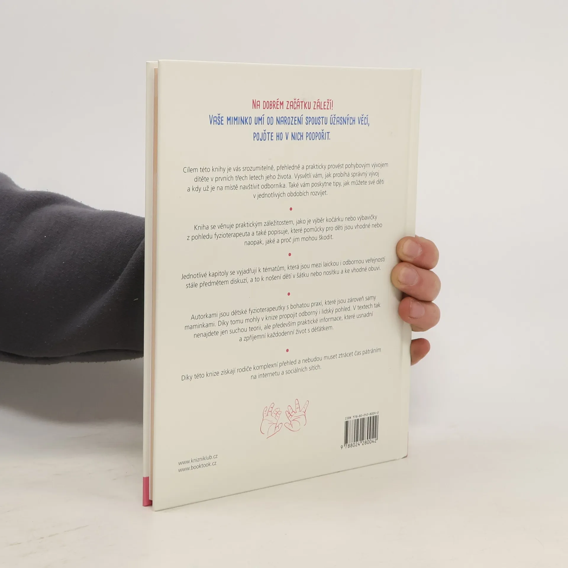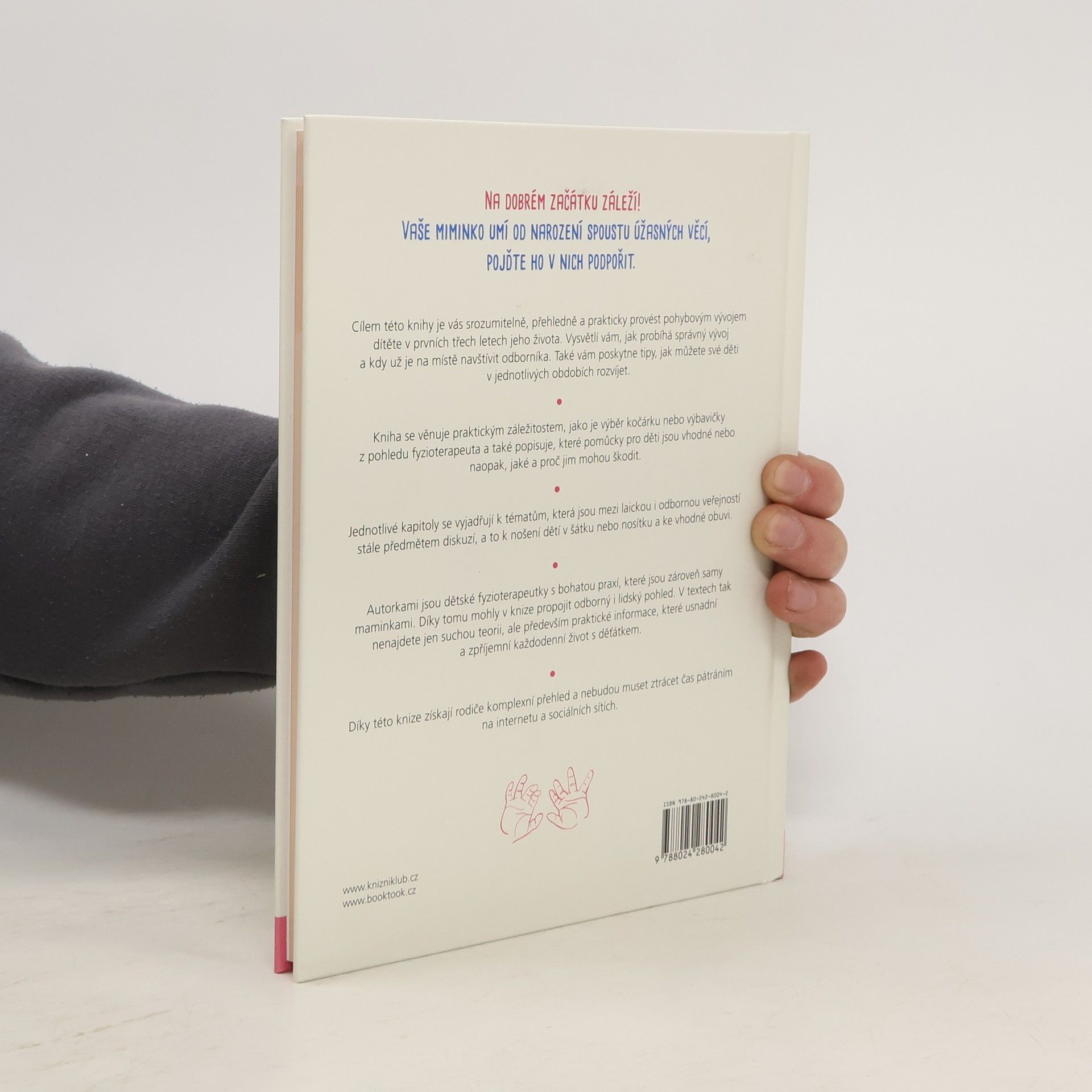 Na dobrém začátku záleží! Cílem této knihy, sepsané dvěma fyzioterapeutkami a zároveň maminkami malých dětí, je srozumitelně, přehledně a prakticky provést rodiče pohybovým vývojem jejich děťátka v prvních třech letech života. Vysvětluje, co je dobré sledovat a proč, kdy už je vhodné navštívit odborníka, i to, jak mohou rodiče své děti v jednotlivých obdobích rozvíjet. Publikace zároveň usnadňuje orientaci v často nepřeberném množství dětských pomůcek, které dnešní trh nabízí, včetně pomoci s výběrem správného kočárku či nosítka a později i vhodné obuvi.