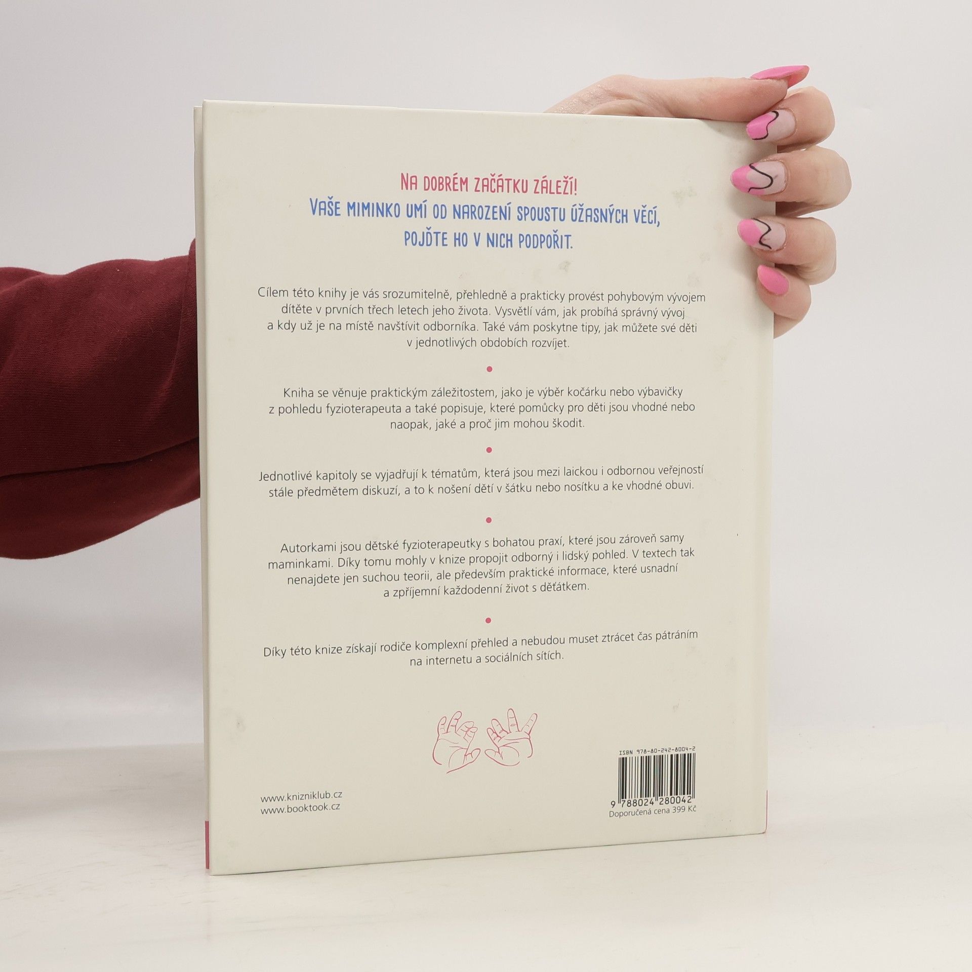 Na dobrém začátku záleží! Cílem této knihy, sepsané dvěma fyzioterapeutkami a zároveň maminkami malých dětí, je srozumitelně, přehledně a prakticky provést rodiče pohybovým vývojem jejich děťátka v prvních třech letech života. Vysvětluje, co je dobré sledovat a proč, kdy už je vhodné navštívit odborníka, i to, jak mohou rodiče své děti v jednotlivých obdobích rozvíjet. Publikace zároveň usnadňuje orientaci v často nepřeberném množství dětských pomůcek, které dnešní trh nabízí, včetně pomoci s výběrem správného kočárku či nosítka a později i vhodné obuvi.