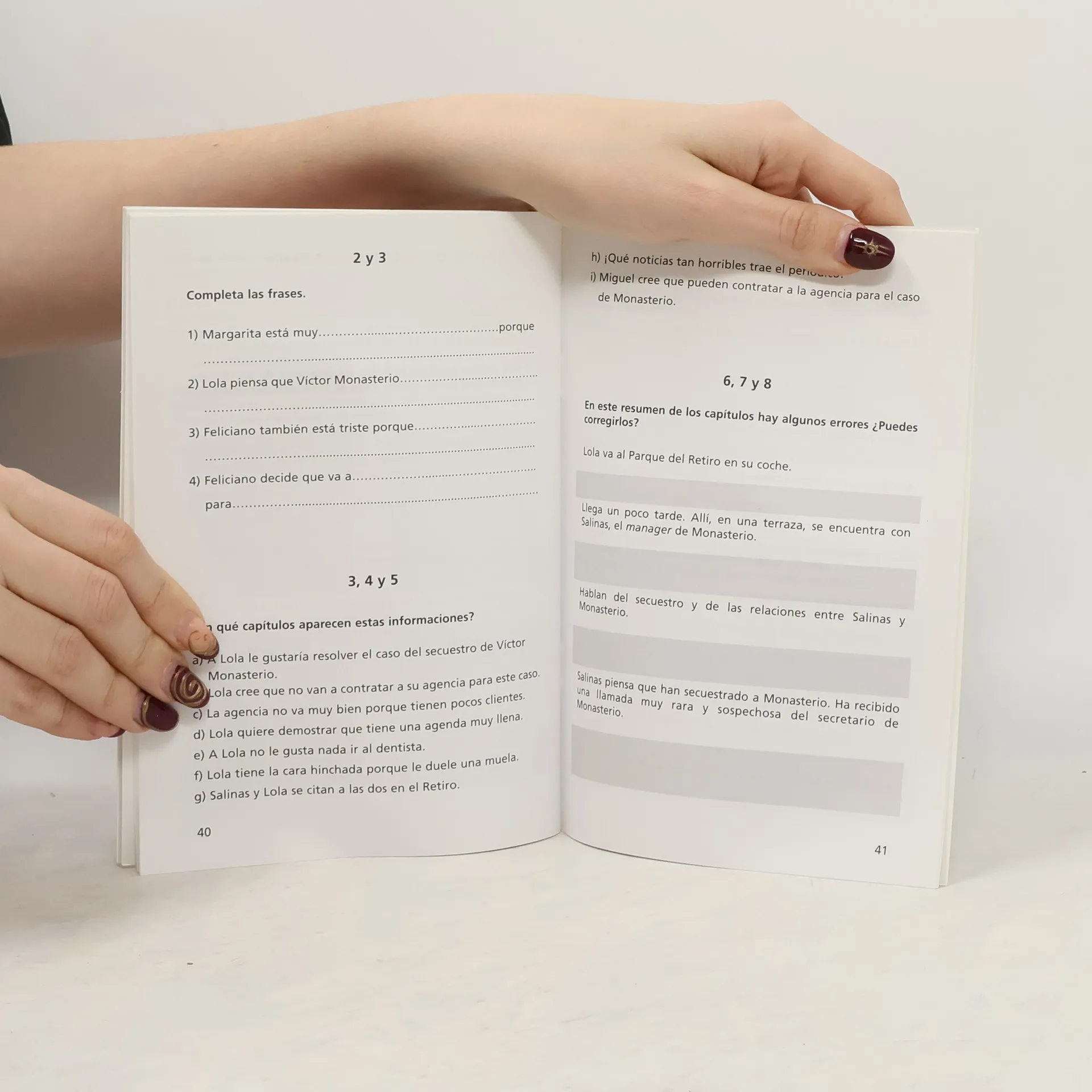 Lola Lago, jefa de una agencia de detectives en Madrid, sufre de un dolor de muela pero debe trabajar en un caso importante: el secuestro de la estrella Victor Monasterio. La historia está diseñada para estudiantes de español como lengua extranjera, con notas explicativas y ejercicios.