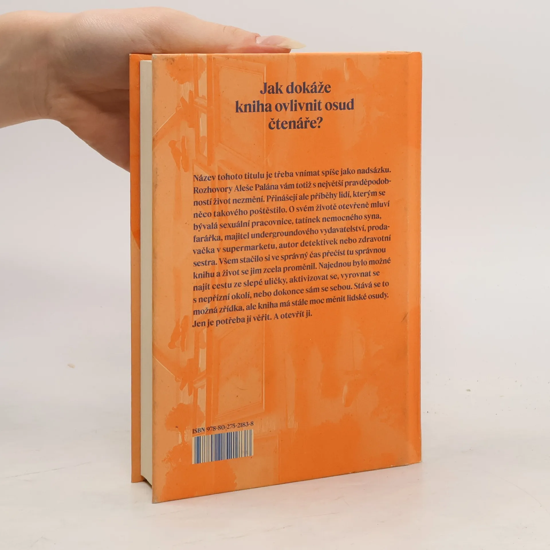 Jak literární dílo dokáže ovlivnit osud čtenáře? Název této knihy je třeba vnímat spíše jako nadsázku. Rozhovory Aleše Palána vám totiž s největší pravděpodobností život nezmění. Přinášejí ale příběhy lidí, kterým se něco takového poštěstilo. O svém životě otevřeněmluví bývalá sexuální pracovnice, tatínek nemocného syna, farářka, majitel undergroundového vydavatelství, prodavačka v supermarketu, autor detektivek nebo zdravotní sestra. Všem stačilo si ve správný čas přečíst tu správnou knihu a život se jim zcela proměnil. Najednou bylo možné najít cestu ze slepé uličky, aktivizovat se, vyrovnat se s nepřízní okolí, nebo dokonce sám se sebou. Stává se to možná zřídka, ale kniha má stále moc měnit lidské osudy. Jen je potřeba jí věřit. A otevřít ji.