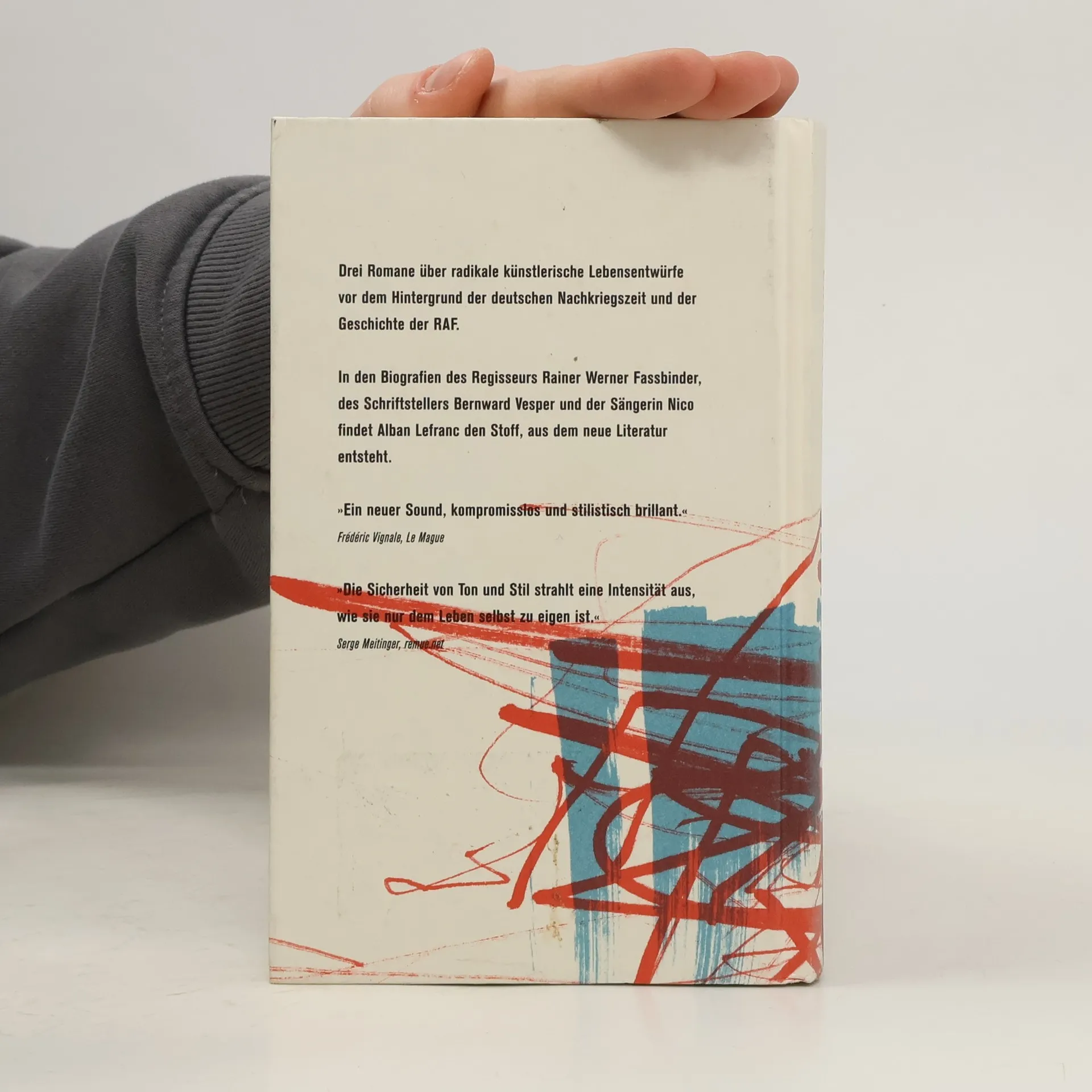 Alban Lefranc kombiniert dokumentarisches, biografisches und fiktives Material in drei Kurzromanen, die das Leben von Fassbinder, Vesper und Nico beleuchten. Diese Werke bieten einen neuen Blick auf die deutsche Nachkriegszeit und die RAF, geprägt von radikalen künstlerischen Lebensentwürfen und einem kompromisslosen Stil.