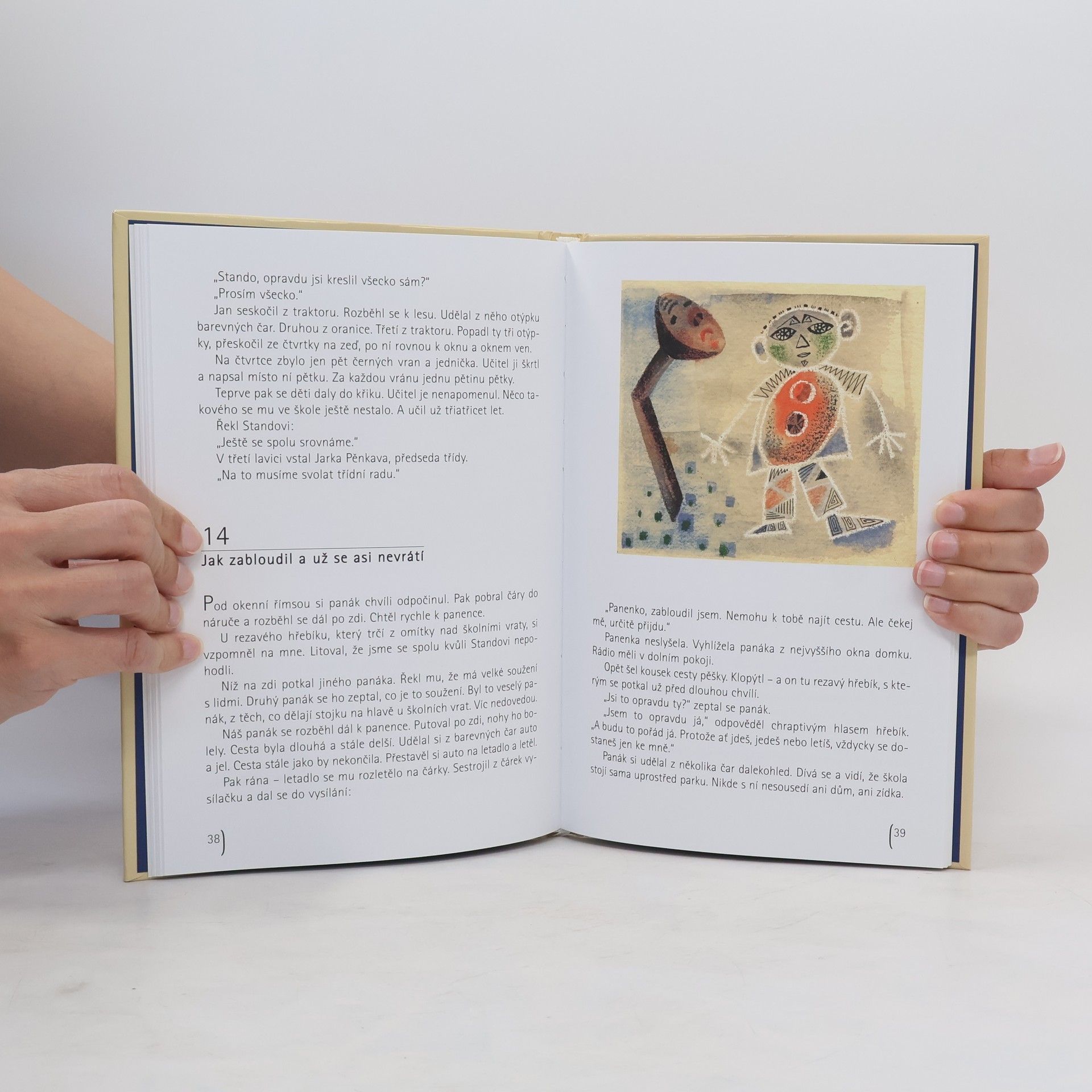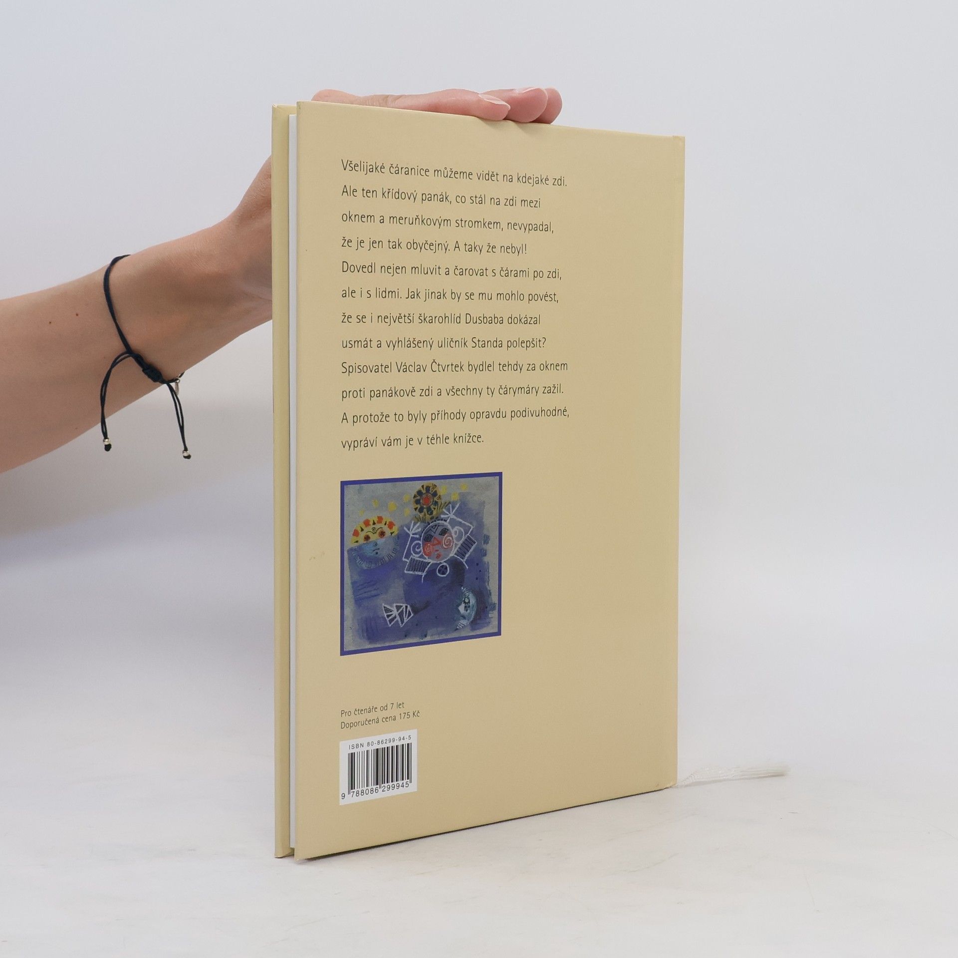 Autorovy příhody s křídovým panákem. Křídový panák nakreslený na zdi mezi oknem a meruňkovým stromem nebyl jen tak obyčejná malůvka na zdi. Dovedl mluvit a taky čarovat s čárkami z barevných kříd. Jedině pomocí kouzel se mohl starý škarohlíd Dusbaba usmát a Standa Trnka, známý lump, polepšit. Autor knížky mu s tím vším pomáhal a nakonec musel také napravit svou vlastní chybu a vrátit panákovi jeho hodnou panenku