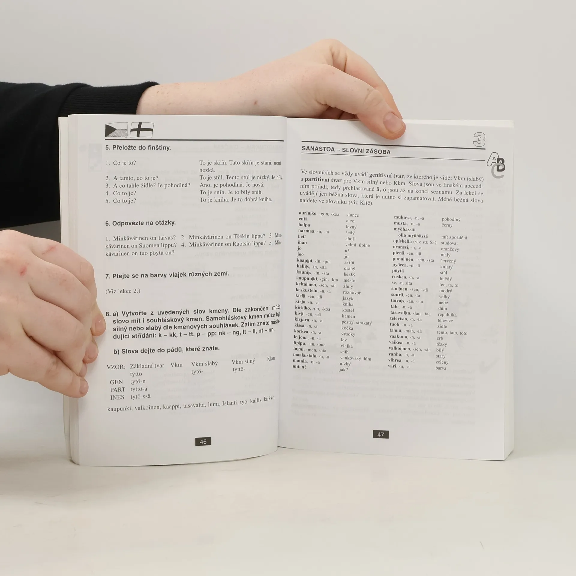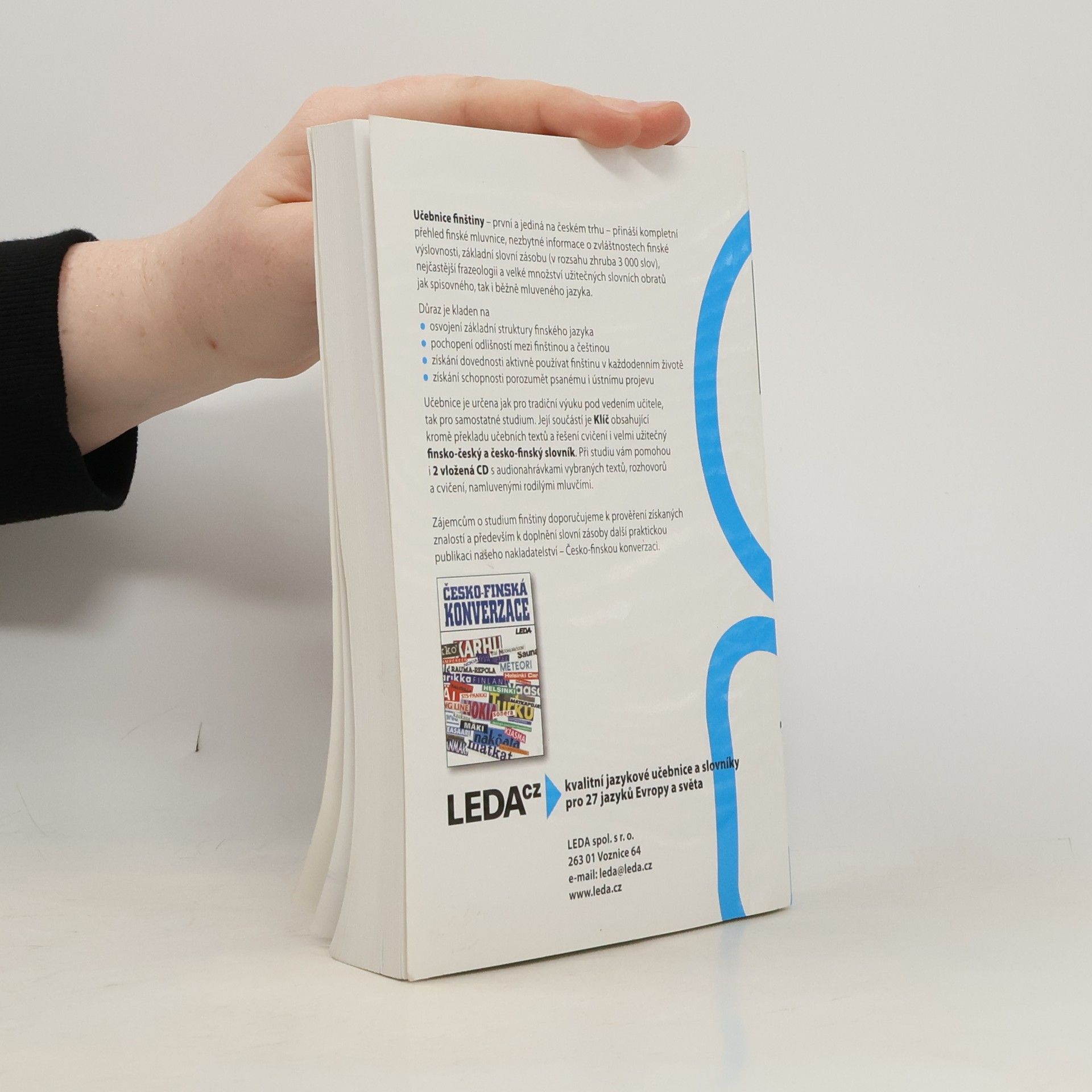 První učebnice finského jazyka pro Čechy nabízí v 31 lekcích úplné základy současné finštiny. Je určena především pro tradiční výuku pod vedením učitele, který může dále doplňovat a rozvádět i to, co – ve snaze pojmout do knihy co nejvíce – mohlo být jen naznačeno nebo zmíněno okrajově. Svým uspořádáním je však tato učebnice vhodná i pro samouky. Součástí učebnice jsou praktický klíč, který kromě překladů učebních textů a rozhovorů z jednotlivých lekcí učebnice a kromě řešení ke cvičením obsahuje i velmi užitečný finsko-český slovník obsahující zhruba 3000 hesel a česko-finský slovník o rozsahu zhruba 1000 hesel, a 2 audio CD.