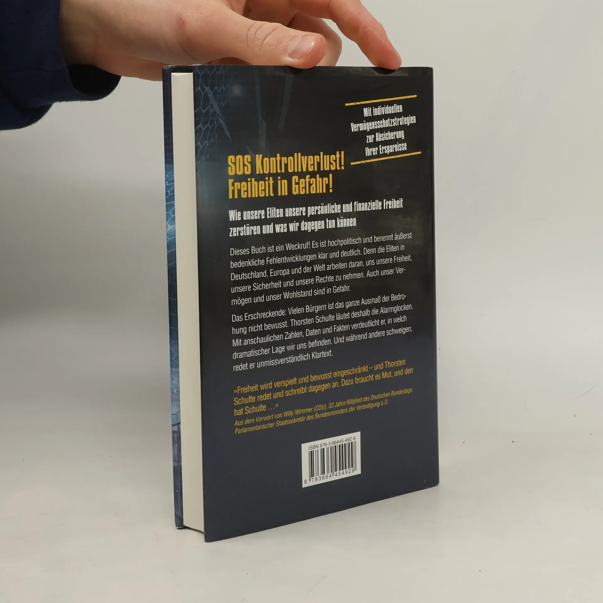 SOS Kontrollverlust! Freiheit in Gefahr! Dieses Buch ist ein Weckruf und thematisiert besorgniserregende Entwicklungen, die unsere persönliche und finanzielle Freiheit bedrohen. Die Eliten in Deutschland, Europa und der Welt arbeiten daran, uns unsere Rechte und unser Vermögen zu entziehen. Viele Bürger sind sich der gesamten Bedrohung nicht bewusst, weshalb Thorsten Schulte die Alarmglocken läutet. Mit klaren Zahlen und Fakten verdeutlicht er die dramatische Lage, während andere schweigen. Er zeigt auf, wie Bundeskanzlerin Angela Merkel gegen Recht und Gesetz verstößt und Brüsseler Technokraten zunehmend Macht an sich reißen, was die Entmündigung der Bürger zur Folge hat. Wenn die Herrschaft des Rechts endet, wird es keine guten Zeiten geben. Es liegt an uns, unsere Freiheit und eine lebenswerte Zukunft zu verteidigen. Wir dürfen unsere Privatsphäre, Meinungsvielfalt, Rechtsstaatlichkeit und unser Bargeld nicht aufgeben. Denn einmal verloren, werden wir unsere Freiheit nie zurückbekommen. Angesichts der riskanten Politik der EZB, die in einem Kollaps der Finanzsysteme enden könnte, bietet das Buch zahlreiche umsetzbare Empfehlungen, um Ihr Vermögen zu schützen. „Lassen Sie uns alle eine Leuchtfackel für unsere Freiheit werden. Wir dürfen nicht kapitulieren!“ – Thorsten Schulte.