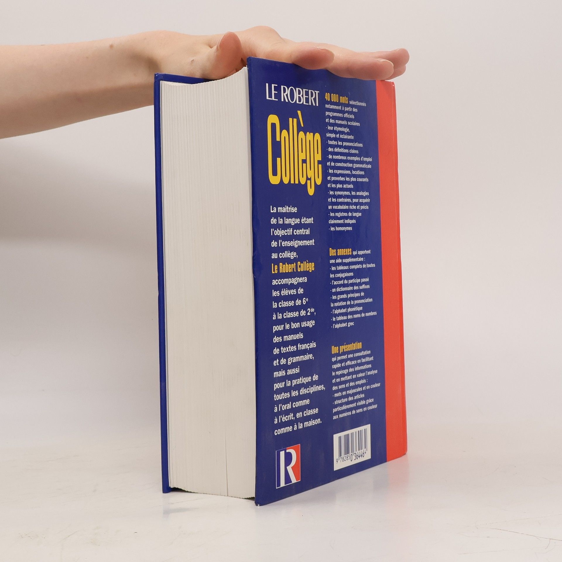 40 000 mots sélectionnés notamment à partir des programmes officiels et des manuels scolaires - leur étymologie, simple et éclairante - toutes les prononciations - des définitions claires - de nombreux exemples d'emploi et de construction grammaticale - les expressions, locutions et proverbes les plus courants et les plus actuels - les synonymes, les analogies et les contraires, pour acquérir un vocabulaire riche et précis - les registres de langue clairement indiqués - les homonymes Des annexes qui apportent une aide supplémentaire : - les tableaux complets de toutes les conjugaisons - l'accord du participe passé - un dictionnaire des suffixes - les grands principes de la notation de la prononciation - l'alphabet phonétique - le tableau des noms de nombres - l'alphabet grec Une présentation qui permet une consultation rapide et efficace en facilitant le repérage des informations et en mettant en valeur l'analyse des sens et des emplois : - mots en majuscules et en couleur - structure des articles particulièrement visible grâce aux numéros de sens en couleur La maîtrise de la langue étant l'objectif central de l'enseignement au collège, Le Robert Collège accompagnera l'élève de la classe de 6° à la classe de 2de pour le bon usage des manuels de textes français et de grammaire, mais aussi pour la pratique de toutes les disciplines, à l'oral comme à l'écrit, en classe comme à la maison.