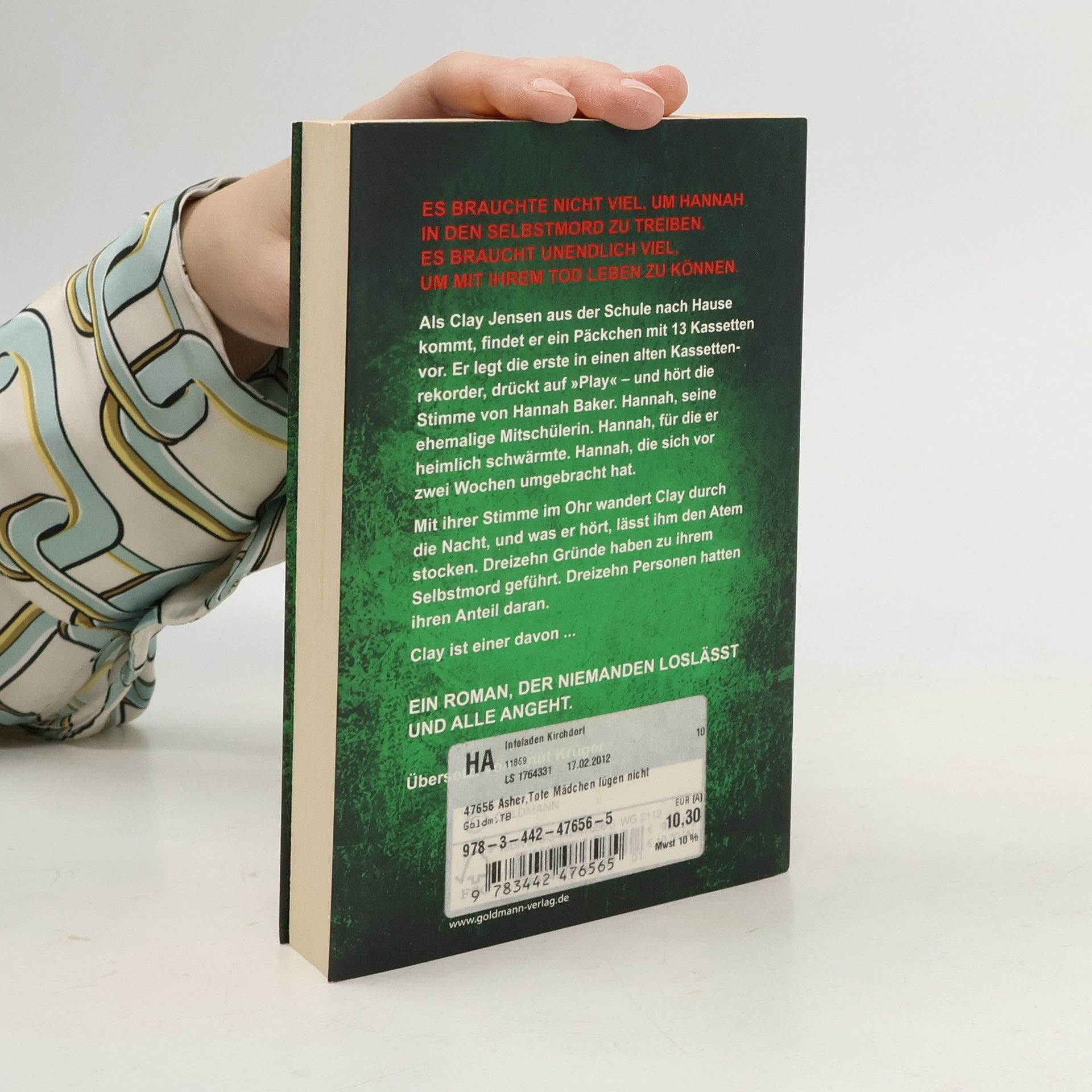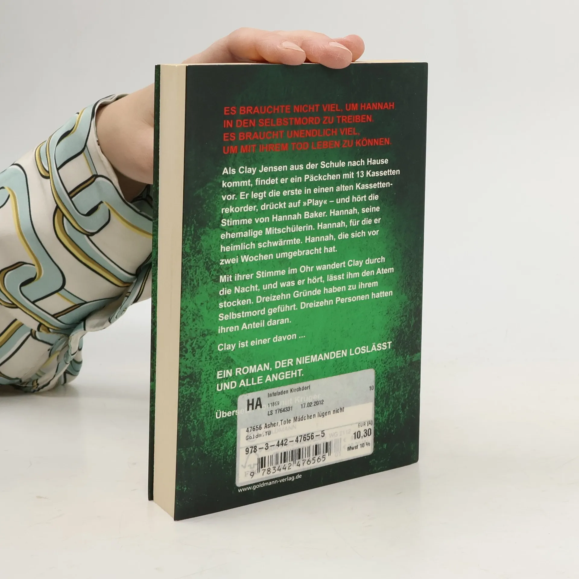 Es brauchte nicht viel, um die Schülerin Hannah in den Selbstmord zu treiben. Es braucht unendlich viel, um mit ihrem Tod leben zu können Als Clay Jensen aus der Schule nach Hause kommt, findet er ein Päckchen mit 13 Kassetten vor. Er legt die erste in einen alten Kassettenrekorder, drückt auf „Play“ – und hört die Stimme von Hannah Baker. Hannah, seine ehemalige Mitschülerin. Hannah, für die er heimlich schwärmte. Hannah, die sich vor zwei Wochen umgebracht hat. Mit ihrer Stimme im Ohr wandert Clay durch die Nacht, und was er hört, lässt ihm den Atem stocken. Dreizehn Gründe sind es, die zu ihrem Selbstmord geführt haben, dreizehn Personen, die daran ihren Anteil haben. Clay ist einer davon ...