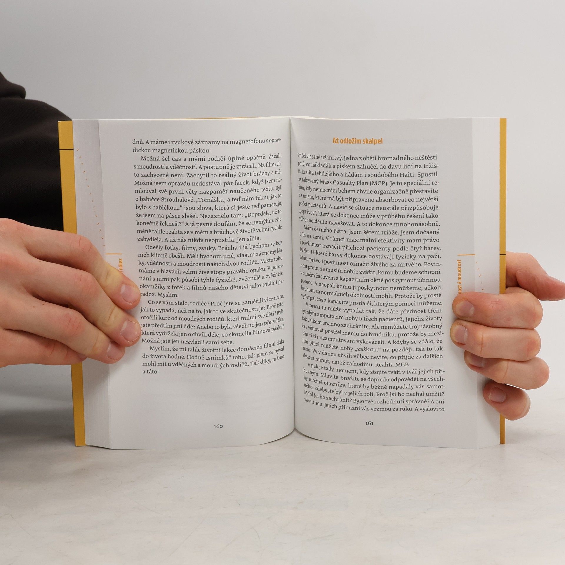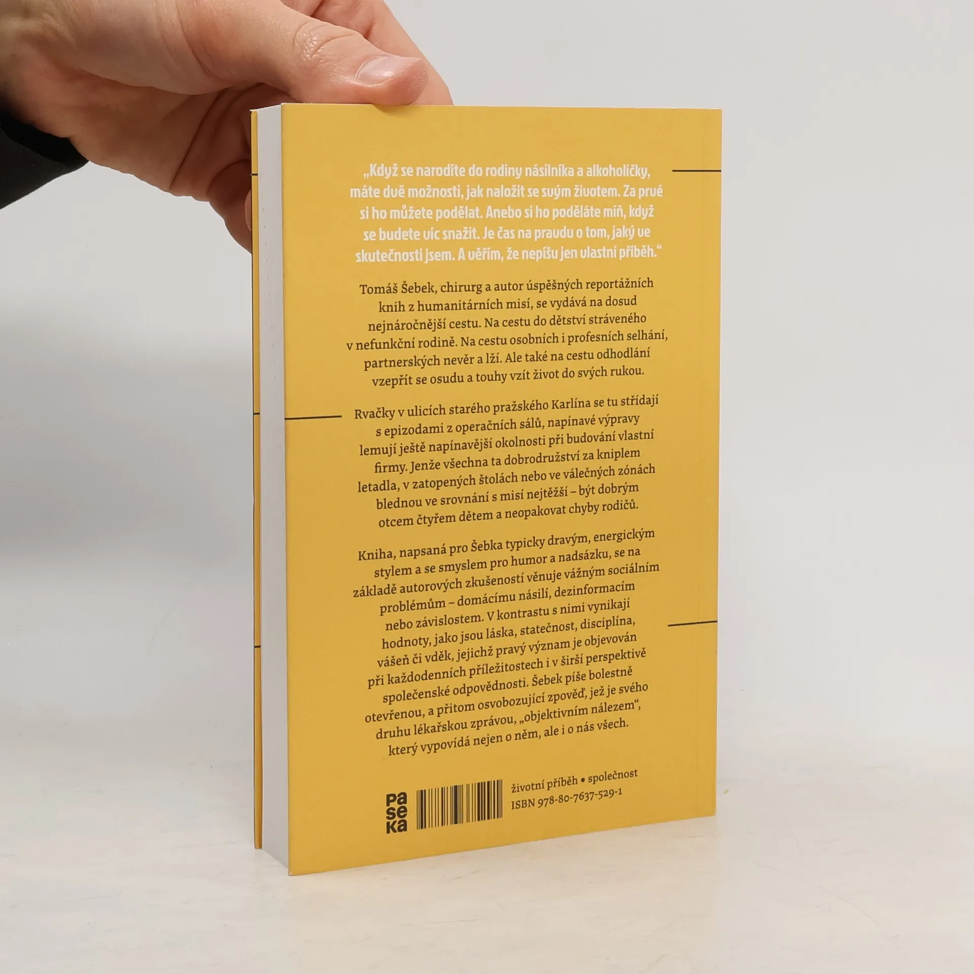Tomáš Šebek, chirurg a autor úspěšných reportážních knih z humanitárních misí, se vydává na dosud nejnáročnější cestu. Na cestu do dětství stráveného v nefunkční rodině. Na cestu osobních i profesních selhání, partnerských nevěr a lží. Ale také na cestu odhodlání vzepřít se osudu a touhy vzít život do svých rukou. Rvačky v ulicích starého pražského Karlína se tu střídají s epizodami z operačních sálů, napínavé výpravy lemují ještě napínavější okolnosti při budování vlastní firmy. Jenže všechna ta dobrodružství za kniplem letadla, v zatopených štolách nebo ve válečných zónách blednou ve srovnání s misí nejtěžší – být dobrým otcem čtyřem dětem a neopakovat chyby rodičů. Kniha, napsaná pro Šebka typicky dravým, energickým stylem a se smyslem pro humor a nadsázku, se na základě autorových zkušeností věnuje vážným sociálním problémům – domácímu násilí, dezinformacím nebo závislostem. V kontrastu s nimi vynikají hodnoty, jako jsou láska, statečnost, disciplína, vášeň či vděk, jejichž pravý význam je objevován při každodenních příležitostech i v širší perspektivě společenské odpovědnosti. Šebek píše bolestně otevřenou, a přitom osvobozující zpověď, jež je svého druhu lékařskou zprávou, „objektivním nálezem“, který vypovídá nejen o něm, ale i o nás všech.