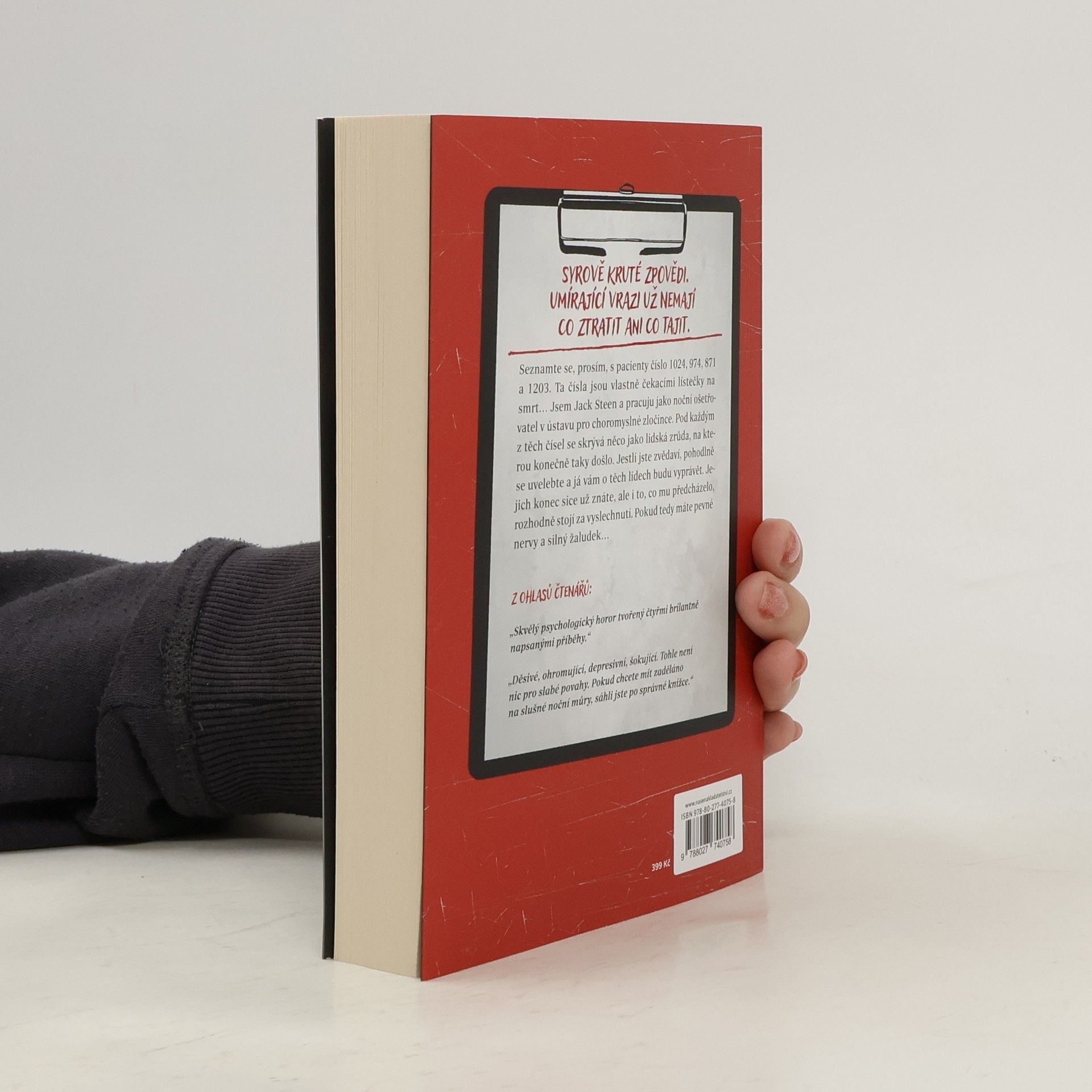 Přivážejí je živé. Odvážejí je mrtvé. Ale napřed mi musejí svěřit svoji zpověď. Jmenuji se Jack Steen. To jméno by pro vás nemělo nic znamenat. Pokud se nechystáte umřít. To se pak ze mě stává váš zasraný anděl strážný. Pracuji jako noční ošetřovatel v ústavu pro choromyslné zločince. Moje jméno je jediné pravé jméno, které v téhle knize najdete. Neřeknu vám, v jaké nemocnici pracuju. Neřeknu vám jména těch umírajících. Ale nebudu vám lhát. To, co si tu přečtete, je přesně to, co mi řekli. Jestli máte za ušima a jestli jste dost pomatení na to, abyste četli mezi řádky, dojde vám, kdo tenhle příběh vypráví. Možná se mi jen snaží zblbnout hlavu a sehrát se mnou svou poslední hru. A možná, že zblbnou hlavu i vám. V téhle knize najdete čtyři zpovědi: O člověku se zajímavými chutěmi. Další o Kenovi, který by udělal cokoliv, aby byla jeho Barbie šťastná. Pak je tu Chůvička, ale takovou byste u svých dětí nechtěli. A poslední je ta nejmilejší osoba, kterou jste kdy viděli, jenže čtení její zpovědi pro vás bude hodně tvrdé.