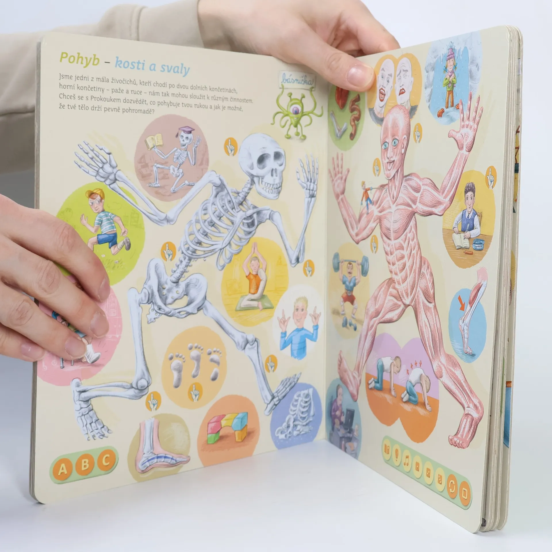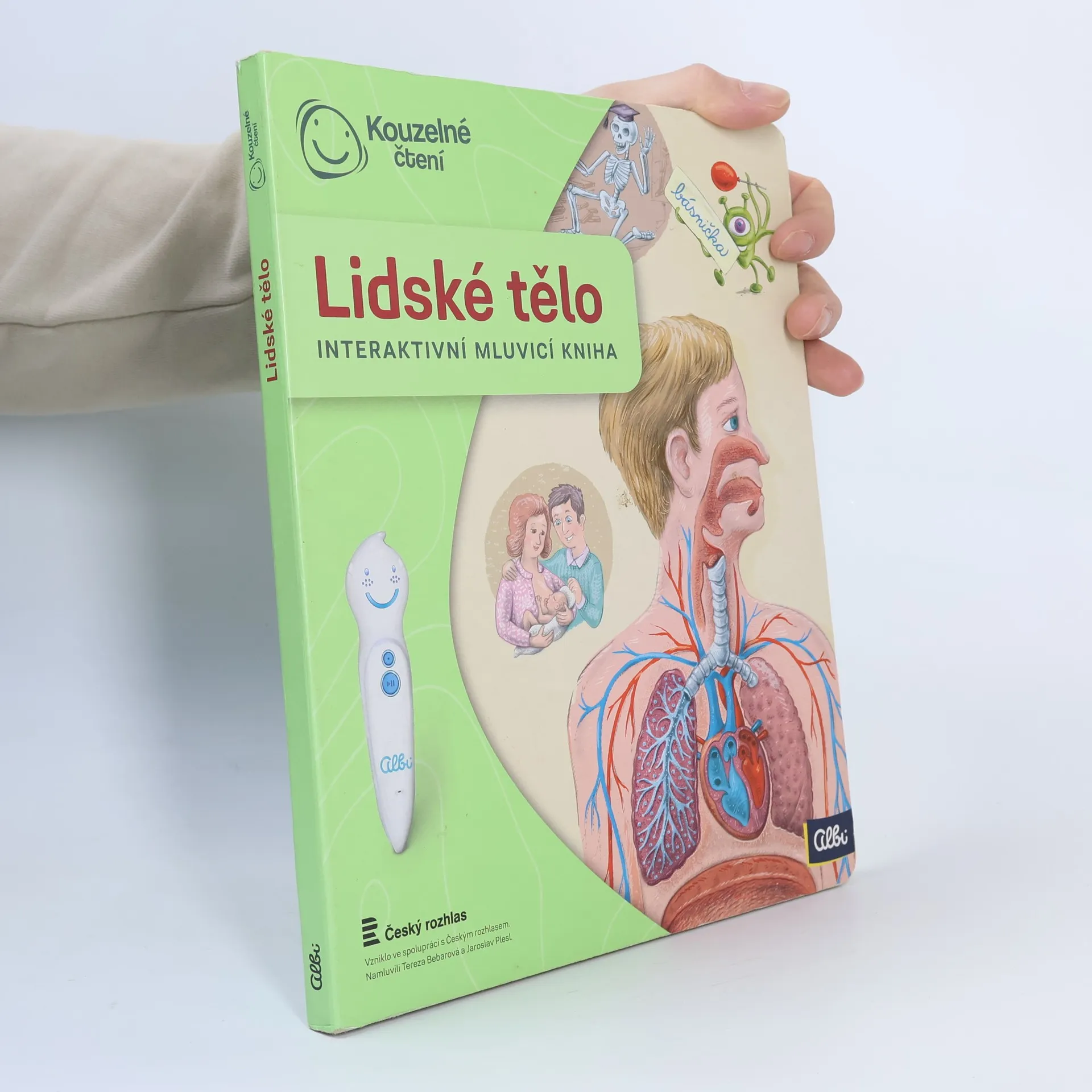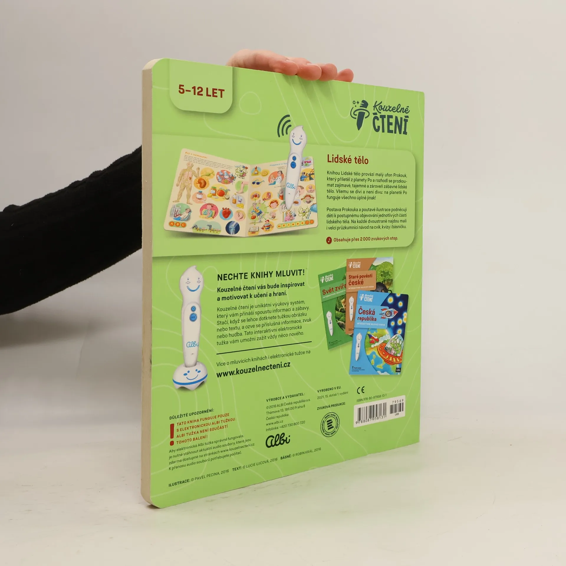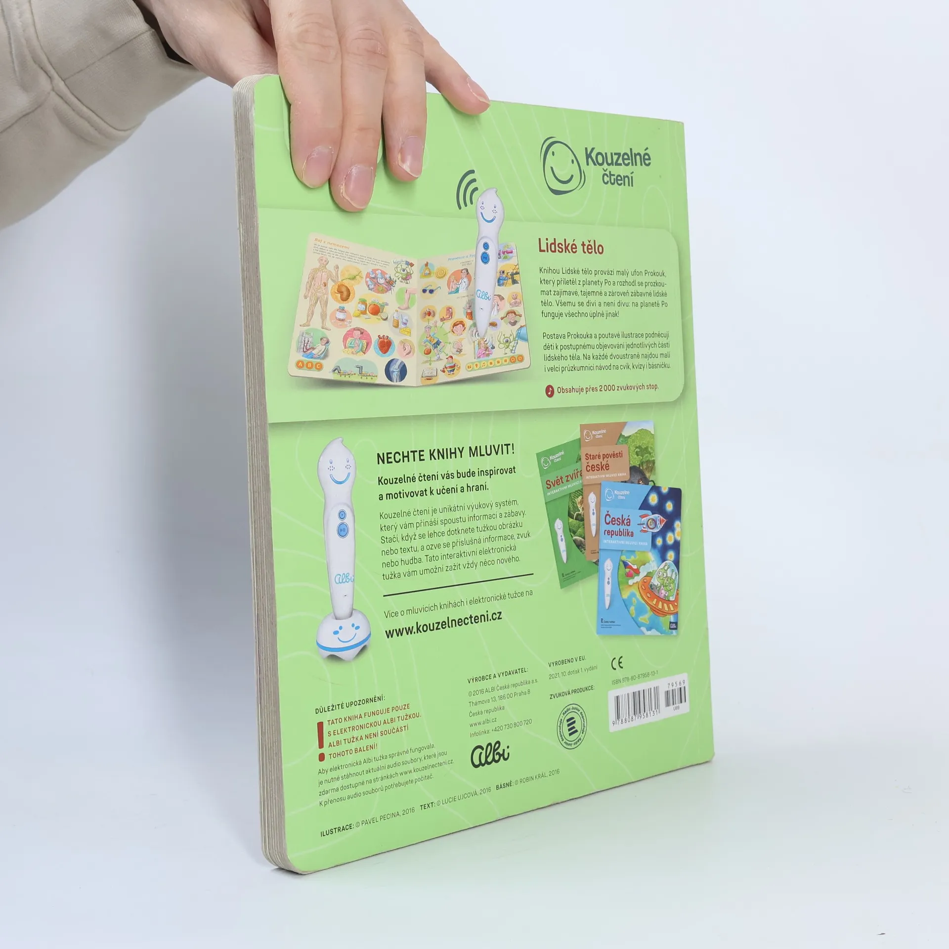 Interaktivní mluvící kniha z edice Kouzelné čtení, se kterou se děti již od 3 let dozvědí spoustu zajímavých a užitečných informací o našem těle. Knihou Lidské tělo provází malý ufon Prokouk, který přiletěl z planety Po, aby prozkoumal taje lidského těla. Všemu se diví a není divu: na planetě Po funguje všechno úplně jinak! Postava Prokouka a poutavé ilustrace podněcují děti k postupnému objevování jednotlivých částí a soustav lidského těla. Kniha je členěna do 8 kapitol a témata jsou např. Kosti a svaly, Mozek a nervy, Rozmnožování, Trávicí soustava, Srdce a plíce atd. Na každé dvoustraně najdou malí i velcí průzkumníci návod na cvik. Když si všechny cviky propojí, vznikne sestava, kterou si mohou zacvičit a krásně se přitom protáhnout. V knize Lidské tělo najdete také básničky, zábavné kvízy a speciální ikony, které děti vybízí, aby si získanou informaci zkusili doslava na vlastní kůži. Kniha obsahuje téměř 2000 zvuků a textů. Knihu ilustroval Pavel Pecina, básničky napsal Robin Král, texty Lucie Ujcová. Vzniklo ve spolupráci s Českým rozhlasem, knihu namluvili Tereza Bebarová a Jaroslav Plesl.