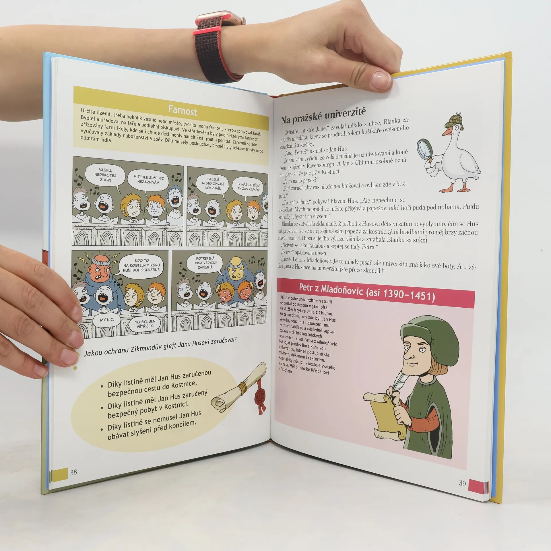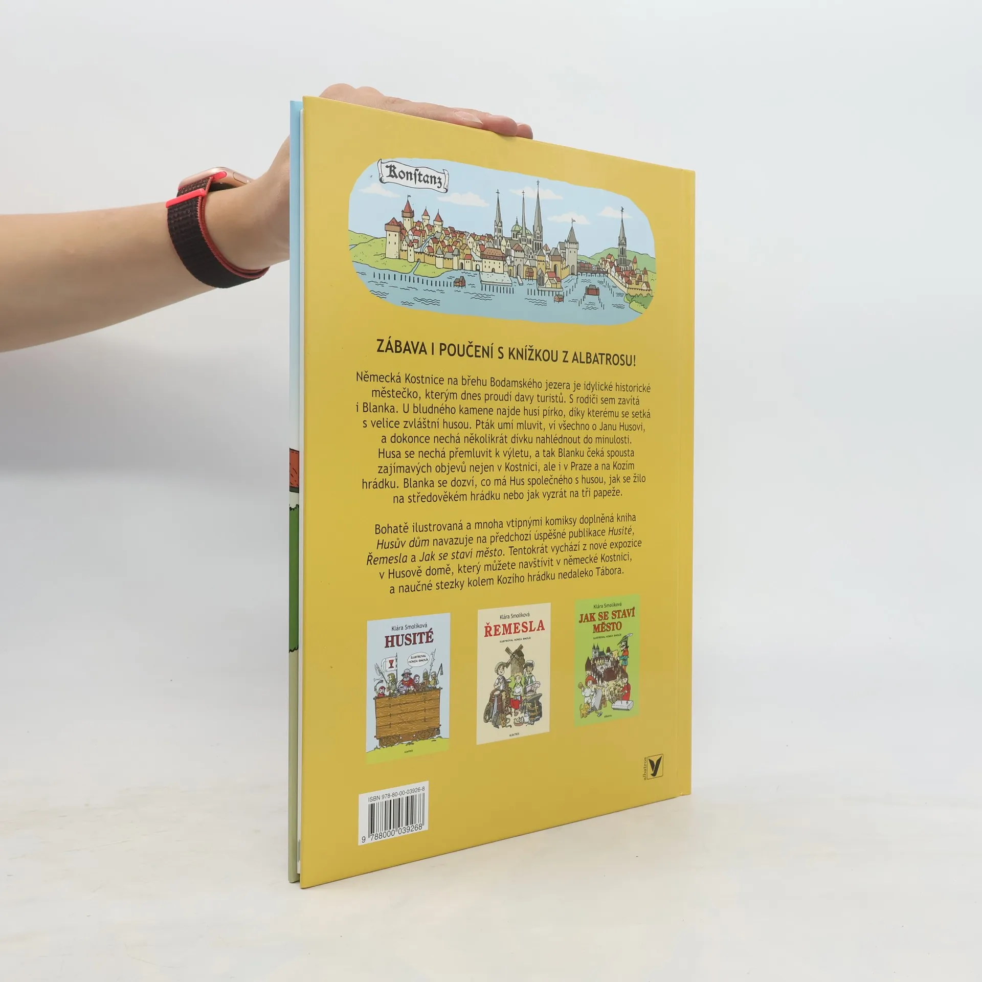 Kniha Husův dům navazuje na předchozí muzejní publikace Husité, Řemesla a Jak se staví město a vychází k 600. výročí upálení Mistra Jana Husa. Německá Kostnice na břehu Bodamského jezera je idylické středověké městečko, kterým dnes proudí davy turistů. S rodiči sem zavítá i Blanka, zvědavá holčička. Všechno ji zajímá. Když na rohu zahlédne husu, rozběhne se za ní. Jenže husa se před ní schovává a kličkuje kostnickými uličkami. A Blanka najednou zjistí, že husa je fuč a ona se ztratila. Německy nemluví, a tak se ani neumí zeptat na cestu. Zoufale se rozhlíží. Když vzhlédne, všimne si, že na hrázděném domě je vedle podobizny vousatého muže český nápis. Muž z kamenné desky na ni mrkne a zavolá: „Husy se v Kostnici raději schovají.“ Blanka překvapeně zamrká, ale to už na ni muž přátelsky kyne a představuje se: „Já jsem Jan Hus.“ Nabídne Blance, že ji provede domem, městem i svým životem. Ale má to háček. Hus může místo opustit jen v podobě husy. A tak se Blanka vydává vstříc záhadám středověkého světa s husou.