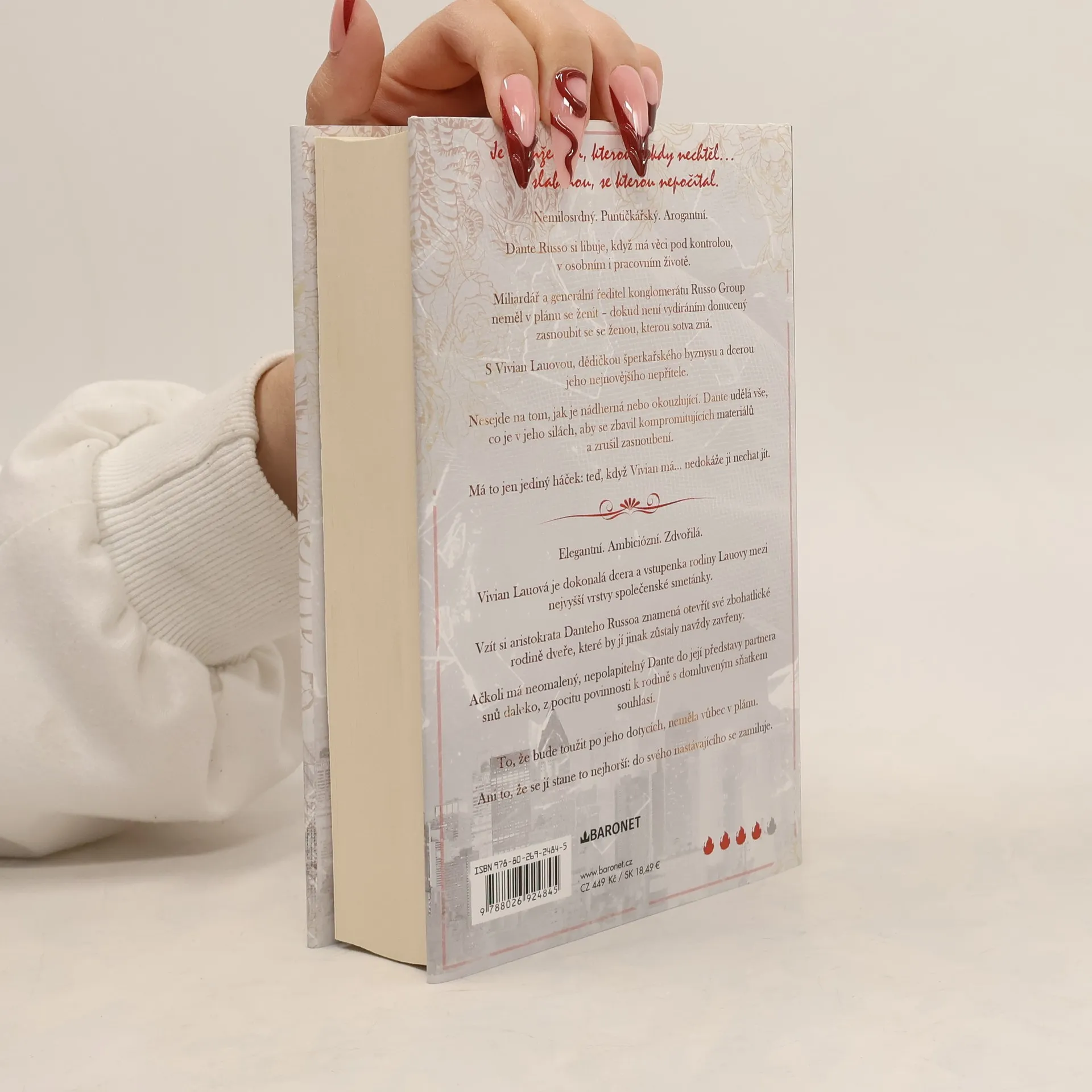Úvodní román z další eroticko-milostné série americké autorky. Bezohledný. Arogantní. A k zešílení sexy. Dante Russo se vyžívá v kontrole, jak v osobním, tak v profesním životě. Uhrančivý miliardář a generální ředitel v jednom se nikdy neplánoval oženit. Pak ho ale hrozba vydírání donutila zasnoubit se s Vivian Lau, dědičkou šperkařského impéria a dcerou jeho nejnovějšího nepřítele. Nezáleží na tom, jak je krásná nebo okouzlující. Dante hodlá udělat vše, co je v jeho silách, aby zasnoubení zrušil. Je tu ale jeden problém: teď, když ji má... nemůže už být bez ní. Nakladatelská anotace.