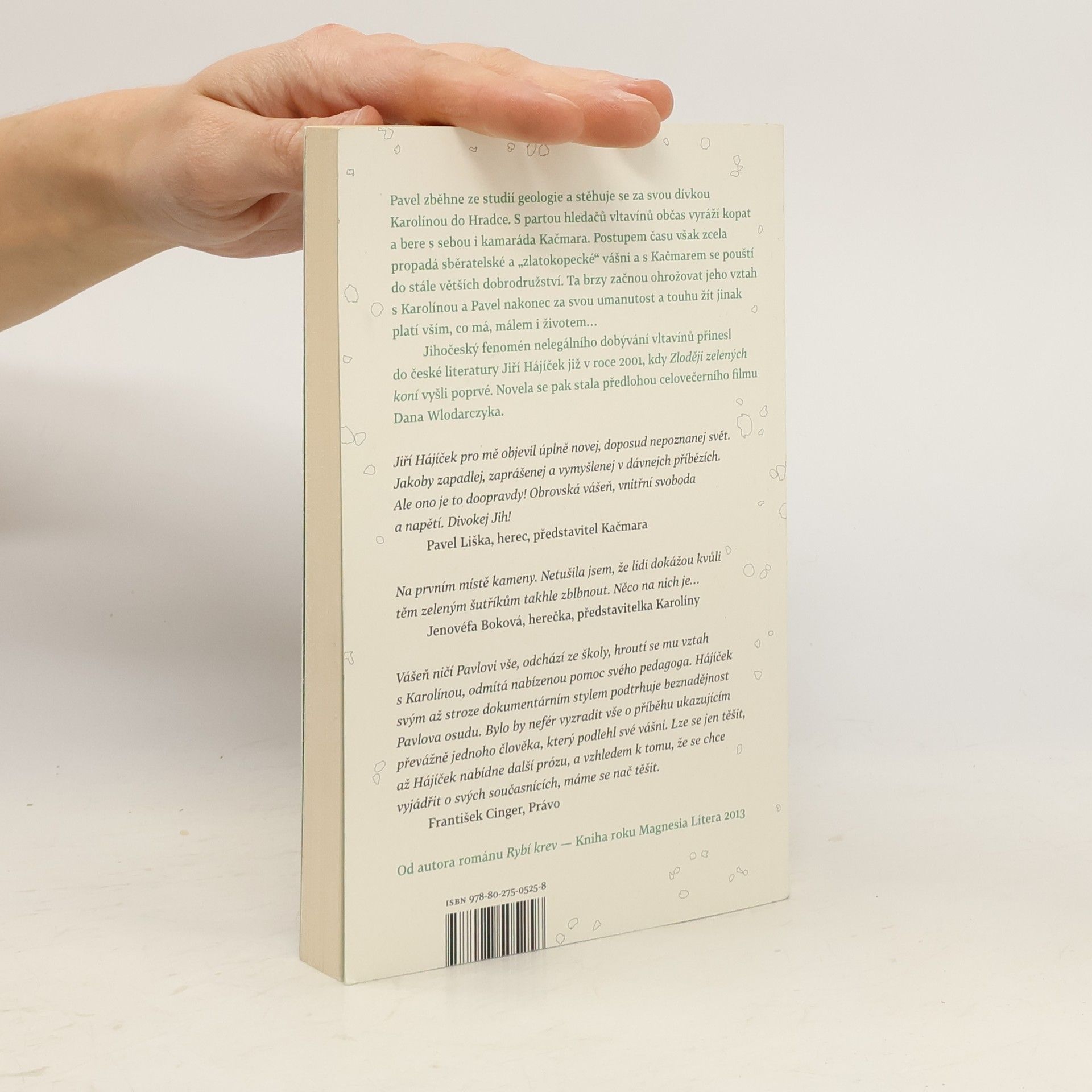 Když Pavel zběhne ze studií a stěhuje se do Hradce za Karolínou, v krabicích na korbě náklaďáku veze kromě knih o geologii i své oblíbené romány Jacka Londona. V jižních Čechách se setkává s partou nelegálních hledačů vltavínů a přivádí mezi ně i kamaráda Kačmara. Postupem času zcela propadá sběratelské a zlatokopecké vášni a s Kačmarem se pouští do stále větších dobrodružství, která ohrožují nejen vztah s Karolínou, ale i jeho přátelství, svobodu, a dokonce život. Jihočeský fenomén vltavínů a jejich nelegálního dobývání přinesl do české literatury Jiří Hájíček již v roce 2001, kdy novela Zloději zelených koní vyšla poprvé. Problém s divokou těžbou těchto polodrahokamů však přetrvává dodnes a výrazně poznamenal i místní krajinu. Hájíčkova novela je tak stále aktuální a stala se předlohou pro stejnojmenný celovečerní film (2016) režiséra Dana Wlodarczyka.