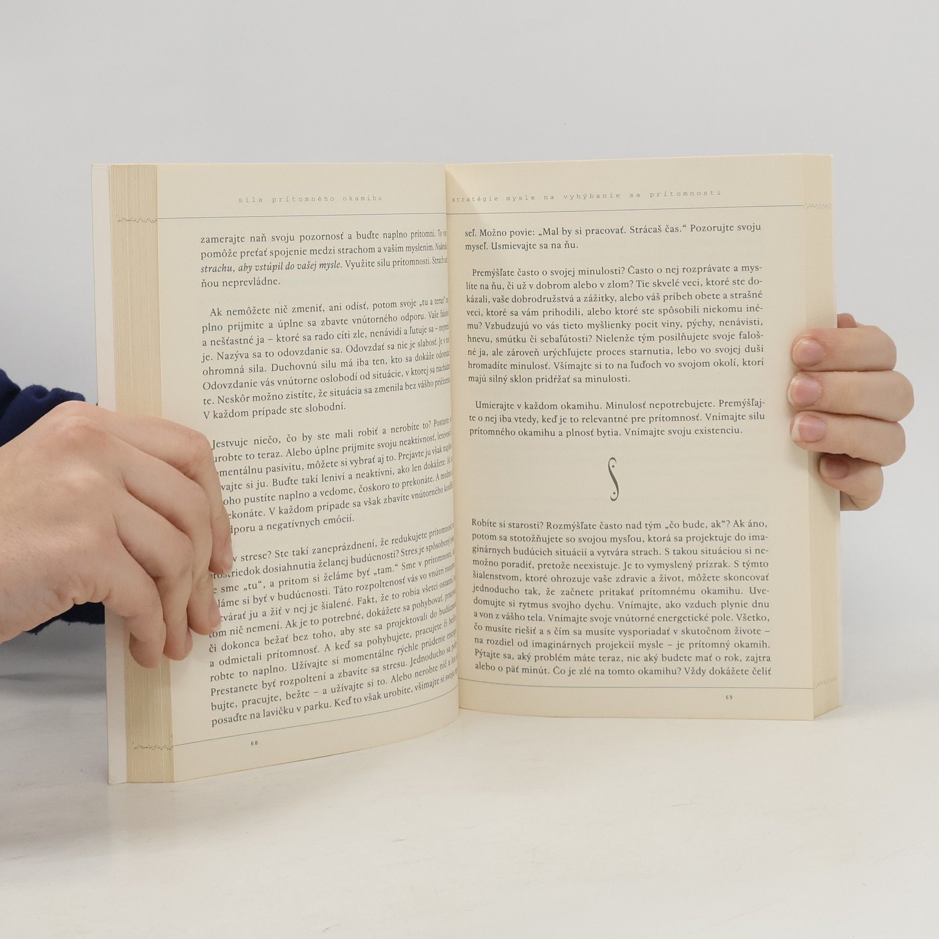 Sprievodca na ceste k duchovnému rastu. Kniha Sila prítomného okamihu je fenomén, o ktorom sa rozpráva už od jej prvého vydania. Dnes je svetovým bestsellerom, hoci ju autor nepísal s úmyslom nadchnúť davy, ale podeliť sa s ľuďmi o svoje poznanie. Patrí k vzácnym knihám, ktoré majú moc radikálne zmeniť život čitateľa k lepšiemu. Eckhart Tolle je súčasný duchovný učiteľ, ktorý sa neprikláňa k nijakému konkrétnemu náboženstvu alebo duchovnej tradícii. Píše s nadčasovou a nekomplikovanou jasnosťou starých duchovných majstrov a odovzdáva jednoduchý a pritom hlboký odkaz: Najpriamejšia cesta ku šťastiu a spokojnosti je schopnosť naplno žiť v prítomnosti. Jeho jasné posolstvo a presvedčivé slová objasňujú filozofiu, ktorej paralely nachádzame v budhizme. Tajomstvo spočíva v uvedomení si skutočnosti, že naše ego sa upína na minulosť (hoci sa už nedá zmeniť) a budúcnosť (hoci ju nemôžeme poznať). Pochopenie, že jediná skutočná realita je prítomný okamih, umožňuje zbaviť sa neplodného pripútania k predstavám a naplno prijať život.