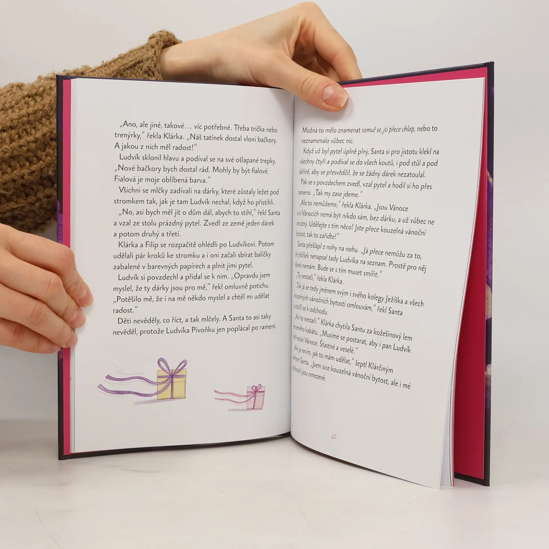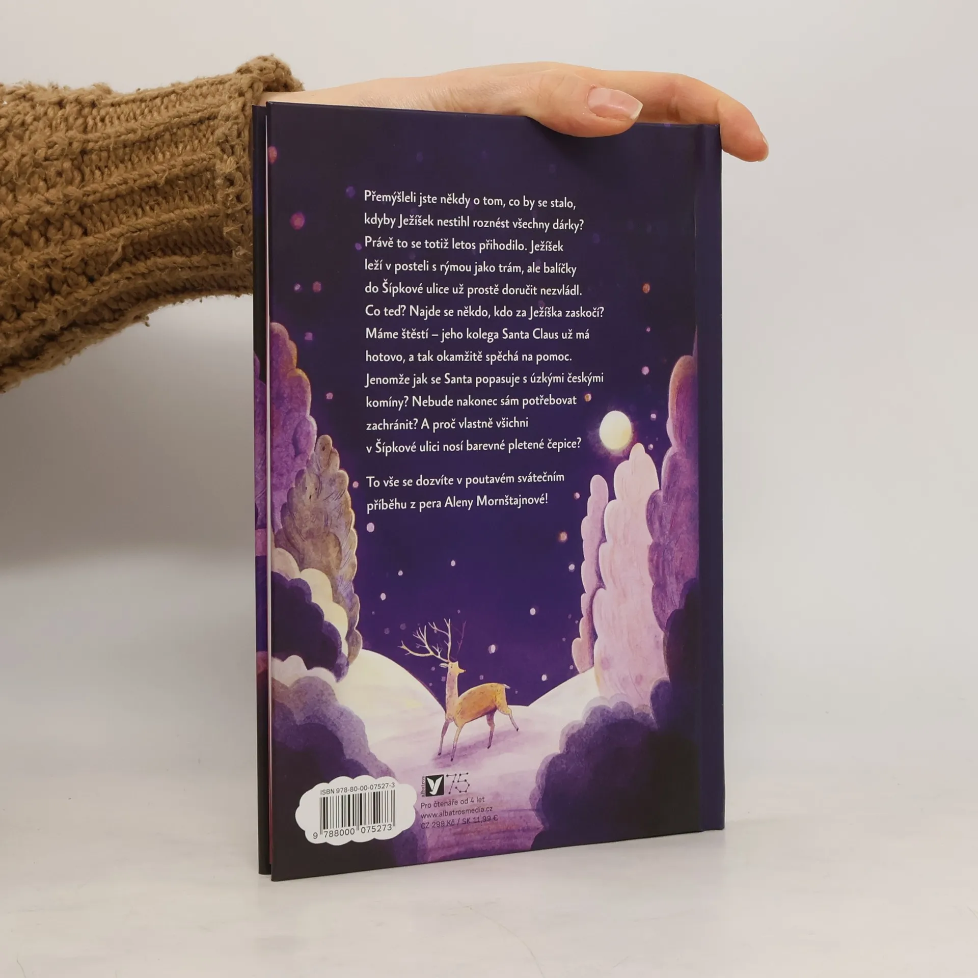 Laskavý pohádkový příběh plný humorných situací a hlavně vánoční atmosféry. Ježíšek leží v posteli s rýmou jako trám a balíčky do Šípkové ulice prostě doručit nezvládl. Ještěže už má jeho kolega Santa Claus hotovo a může přispěchat na pomoc. Jenomže jak se popasuje s úzkými českými komíny? Nebude nakonec sám potřebovat zachránit? Nakladatelská anotace. Kráceno.