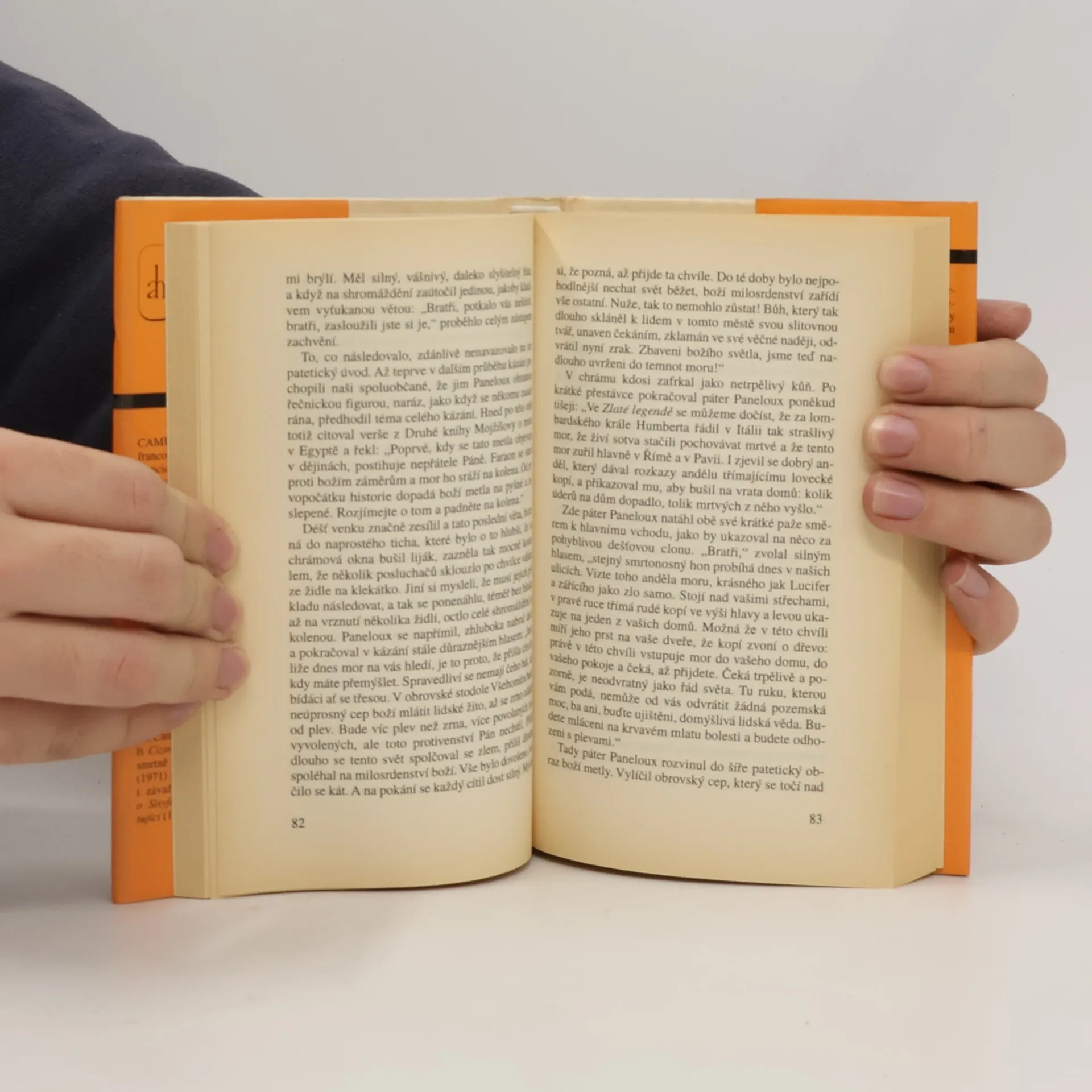 Jednoho dne najde lékař Bernard Rieux před svou ordinací mrtvou krysu. Na zdánlivě banální událost vzápětí zapomene, ale ve dnech následujících začnou krysy houfně vylézat ze svých děr a kanálů a v agonii umírají na chodníku. Brzy se příznaky podivné epidemie objeví i u lidí a obětí přibývá geometrickou řadou... O Moru (1947) si Albert Camus poznamenal do svého Zápisníku, že má ráz „mytického příběhu“. Mytický a filozofický význam má především epidemie sama; lze ji chápat jako alegorii okupačních let, ale i v mnohem existenciálnějším měřítku jako samo zkonkretizované absurdno, jemuž Bernard Rieux, typický Camusův hrdina, vzdoruje civilně a bez hrdinských gest.