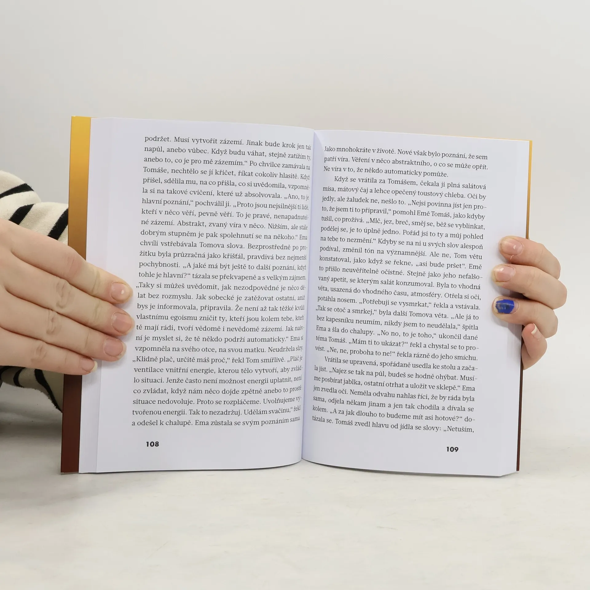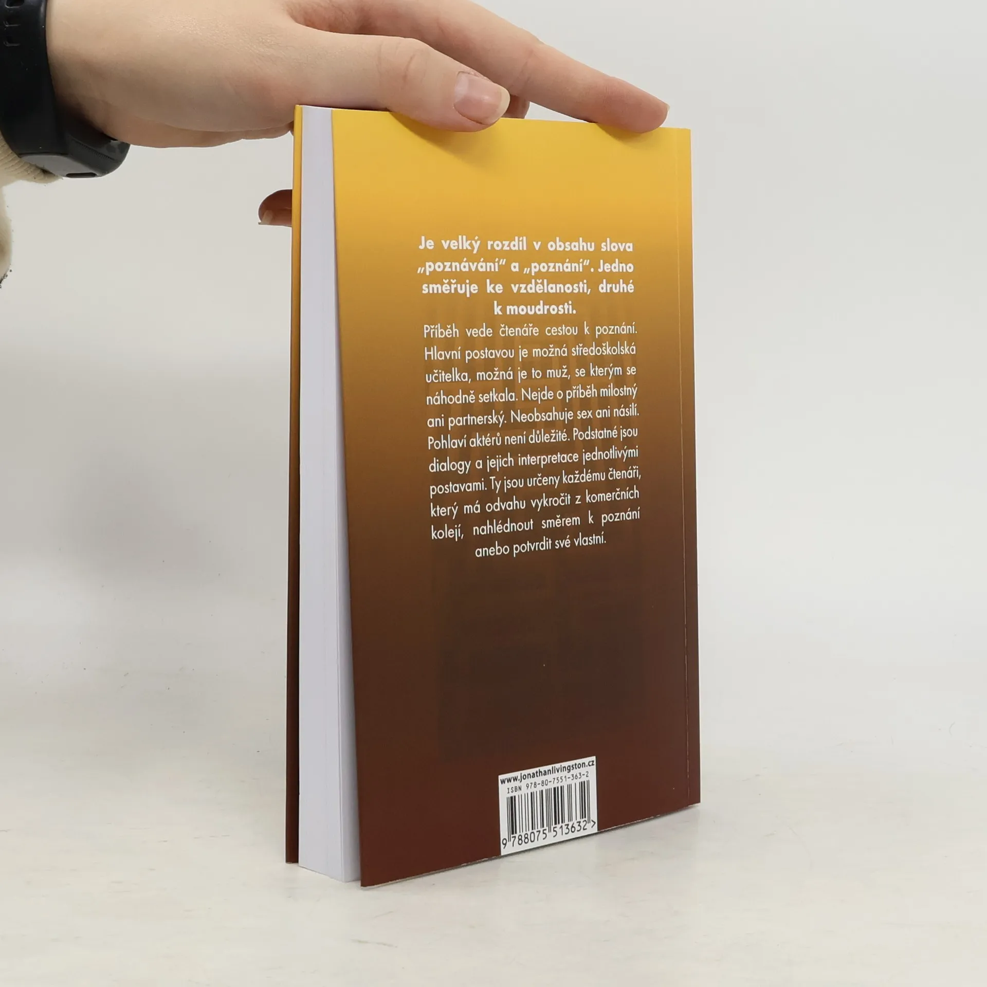 Je velký rozdíl v obsahu slova „poznávání“ a „poznání“. Jedno směřuje ke vzdělanosti, druhé k moudrosti. Příběh vede čtenáře cestou k poznání. Hlavní postavou je možná středoškolská učitelka, ale možná je to muž, se kterým se náhodně setkala. Nejde o příběh milostný ani partnerský. Neobsahuje sex ani násilí. Pohlaví aktérů není důležité. Podstatné jsou dialogy a jejich interpretace jednotlivými postavami. Ty jsou určeny každému čtenáři, který má odvahu vykročit z komerčních kolejí, nahlédnout směrem k poznání anebo potvrdit své vlastní.