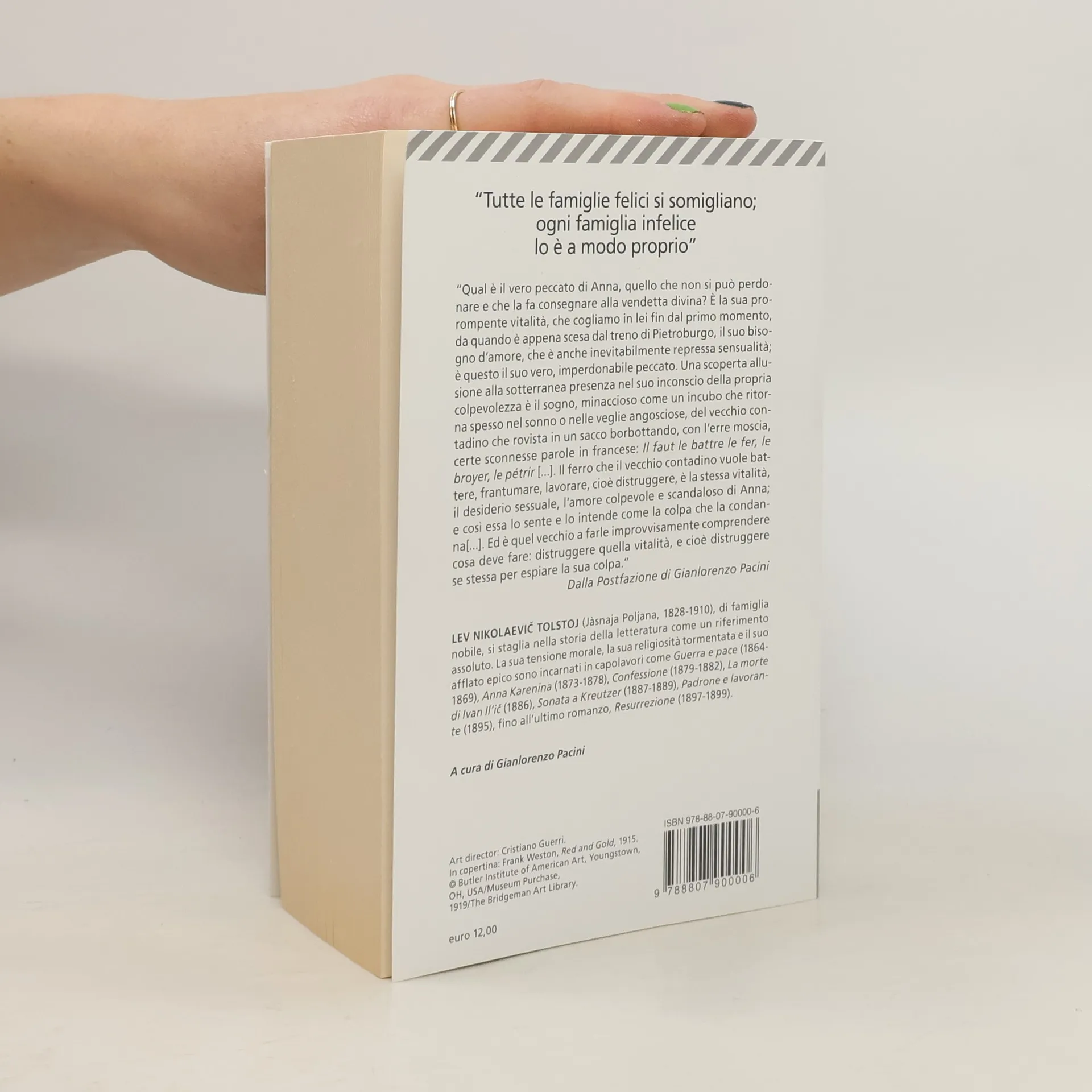 “Tutte le famiglie felici si somigliano; ogni famiglia infelice lo è a modo proprio” “Qual è il vero peccato di Anna, quello che non si può perdonare e che la fa consegnare alla vendetta divina? È la sua prorompente vitalità, che cogliamo in lei fin dal primo momento, da quando è appena scesa dal treno di Pietroburgo, il suo bisogno d’amore, che è anche inevitabilmente repressa sensualità; è questo il suo vero, imperdonabile peccato. Una scoperta allusione alla sotterranea presenza nel suo inconscio della propria colpevolezza è il sogno, minaccioso come un incubo che ritorna spesso nel sonno o nelle veglie angosciose, del vecchio contadino che rovista in un sacco borbottando, con l’erre moscia, certe sconnesse parole in francese: Il faut le battre le fer, le broyer, le pétrir [...]. Il ferro che il vecchio contadino vuole battere, frantumare, lavorare, cioè distruggere, è la stessa vitalità, il desiderio sessuale, l’amore colpevole e scandaloso di Anna; e così essa lo sente e lo intende come la colpa che la condanna[...]. Ed è quel vecchio a farle improvvisamente comprendere cosa deve fare: distruggere quella vitalità, e cioè distruggere se stessa per espiare la sua colpa.” Dalla Postfazione di Gianlorenzo Pacini
