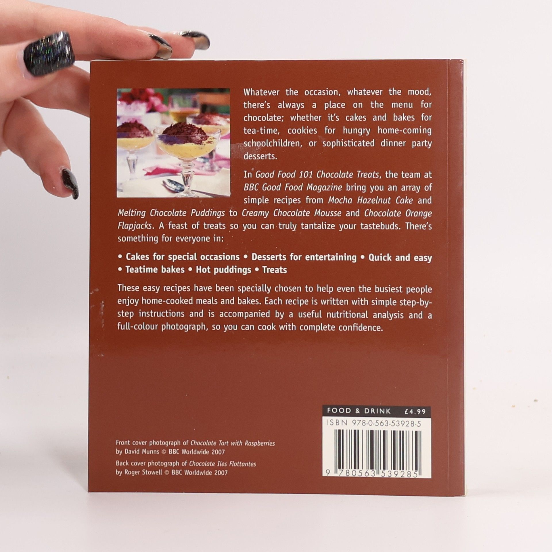 The perfect book for chocoholics everywhere. The Good Food 101 series has sold a total of 750,000 copies 101 cookery range promotions such as 3 for 2s across all 12 titles Stylish, small format featuring photography from many of the UK's top food photographers Fun recipes that are simple to follow, each with a colour photograph of the finished dish Whatever the occasion, whatever the mood, there's always a place on the menu for chocolate; whether it's cakes and bakes for tea-time, cookies for hungry home-coming schoolchildren, or sophisticated dinner party desserts. In Good Food 101 Chocolate Treats, the team at BBC Good Food Magazine brings you an array of simple recipes from Mocha Fudge Cake and Pear, Hazelnut and Chocolate Cake to Pistachio, Orange and Oat Crumbles and Cappucino Bars. A feast of treats so you can truly tantalize your tastebuds.