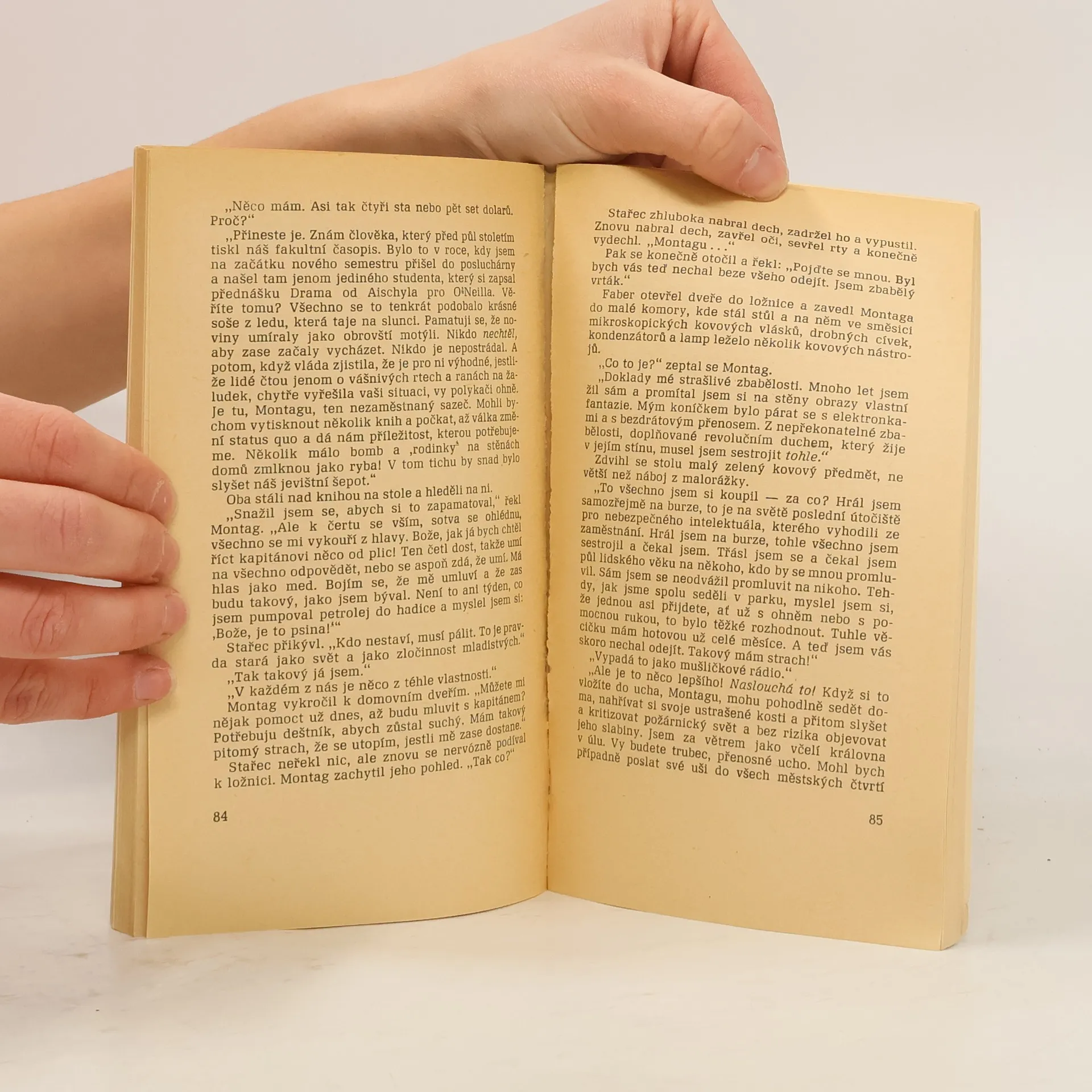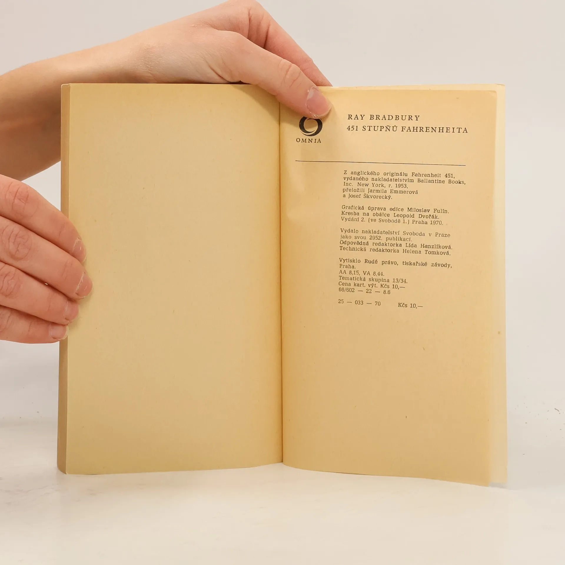 Guy Montag, hrdina románu žije ve své ohnivzdorné vile obklopen civilizací tryskových aut, raketových letadel, mechanické hudby a také ovšem policejních helikoptér a mechanických „ohařů“, kteří svým chemickým čichem neomylně sledují stopu zločince. Kdo je však tímto „zločincem“? Ten, kdo překročí základní zákon této utopistické civilizace, tj. ještě vlastní a čte knihy, kdo nemyslí tak, jak je předepsáno myslet, kdo se pokouší uvažovat samostatně. Tohoto „zločinu“ se právě dopustí Montag. A o příšerné, hrůzné štvanici, kterou na něho uspořádá policie ve svých helikoptérách, o zmechanizovaném děsu, který je mu v patách v podobě mechanického ohaře s prokainovou jehlou v čelisti, o úděsné televizní reportáži z této honičky a o konečném zániku onoho odlidštěného světa vypráví tento příběh. Je to jedno z nejlepších Bradburyho děl, v němž nastavil křivé zrcadlo fantastiky civilizaci moderního světa, jež člověku nepřinese skutečné štěstí, dusí-li v něm to nejcennější – lidskou myšlenku. Vydavatelství Svoboda v edici Omnia, kniha vydána s názvem 451° Fahrenheita (viz obálka knihy) Vydání druhé Překlad - Jarmila Emmerová, Josef Škvorecký Autor obálky - Leopold Dvořák Vazba brožovaná Počet stran 155 Doslov napsal Josef Škvorecký