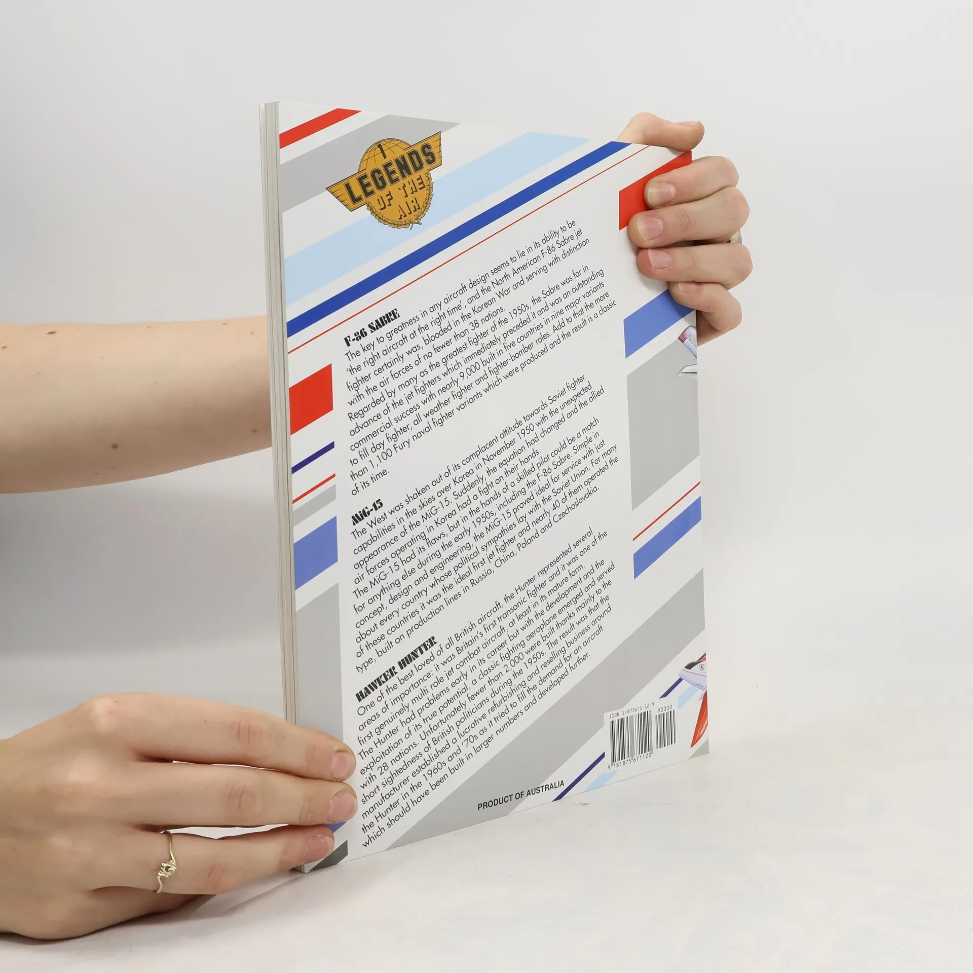 This is the first in the Legends of the Air series and as its title suggests narrates the histories of three of the classic jet fighters of the 1950s. Legends 1, like all the books in this series, is essentially three books in one and covers each phase of the development and operation of these three very different yet technically competing aircraft which emerged at a time when the Cold War was anything but cold. The North American Sabre was the best the West had in 1950 when war erupted in Korea. The USSR surprised the West by the unexpectedly good performance of the previously little known MiG-15, a fine aircraft at the time only let down by poor airmanship and restricted tactical doctrine. England's Hunter followed these two into the air and naturally exceeded the performance of both, consequently remaining in widespread service well into the early 1990s. In addition to the approximately 70,000 words of text by Stewart Wilson, Sabre, MiG-15 & Hunter is illustrated with 36 specially commissioned color sideview drawings and technical cutaways by Juanita Franzi, and features specification and production tables, maps of areas of operations, and hundreds of photographs.