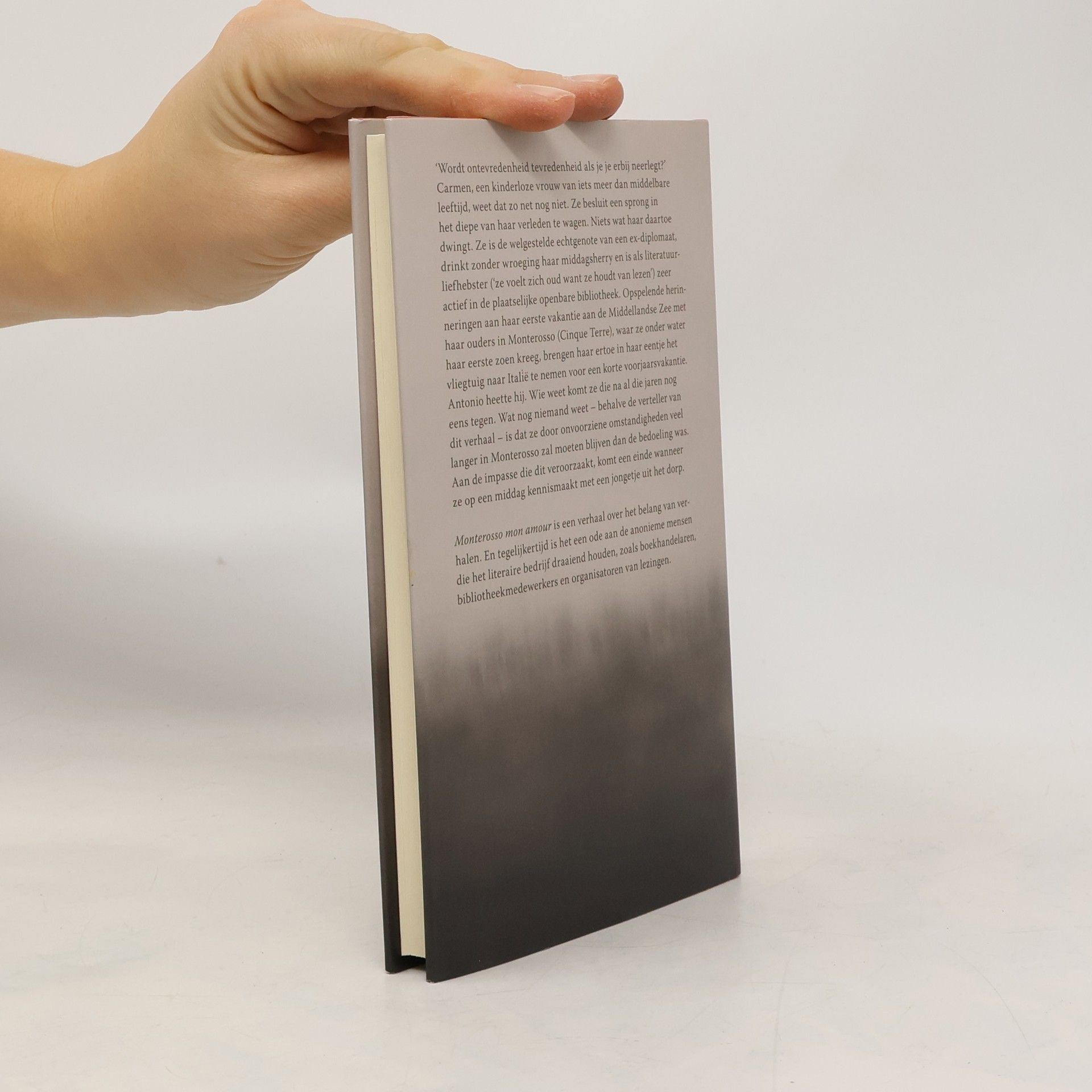 'Wordt ontevredenheid tevredenheid als je je erbij neerlegt?' Carmen, een kinderloze vrouw van iets meer dan middelbare leeftijd, weet dat zo net nog niet. Ze besluit een sprong in het diepe van haar verleden te wagen. Niets wat haar daartoe dwingt. Ze is de welgestelde echtgenote van een ex-diplomaat, drinkt zonder wroeging haar middagsherry en is als literatuurliefhebster ('ze voelt zich oud want ze houdt van lezen') zeer actief in de plaatselijke openbare bibliotheek.Opspelende herinneringen aan haar eerste vakantie aan de Middellandse zee met haar ouders in Monterosso (Cinque Terre), waar ze onder water haar eerste zoen kreeg, brengen haar ertoe in haar eentje het vliegtuig naar Italië te nemen voor een korte voorjaarsvakantie. Antonio heette hij. Wie weet komt ze die na al die jaren nog eens tegen. Wat nog niemand weet – behalve de verteller van dit verhaal – is dat ze door onvoorziene omstandigheden veel langer in Monterosso zal moeten blijven dan de bedoeling was. Aan de impasse die dit veroorzaakt, komt een einde wanneer ze op een middag kennismaakt met een jongetje uit het dorp.