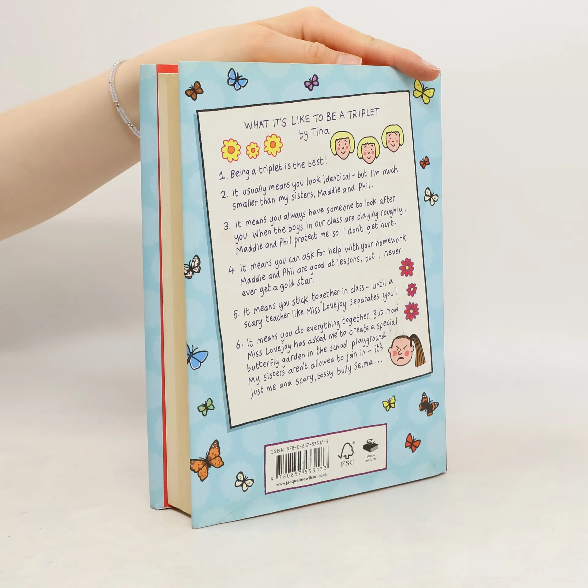 Tina is a triplet, but she's always been the odd one out. Her sisters Phil and Maddie are bigger and stronger and better at just about everything. Luckily, they look after teeny-tiny Tina wherever they go -- but when the girls start in scary, super-strict Miss Lovejoy's class, they're split up, and Tina has to fend for herself for the first time. Tina is horrified when she's paired up with angry bully Selma, who nobody wants to be friends with. But when Miss Lovejoy asks them to help her create a butterfly garden in the school playground, Tina discovers she doesn't always need her sisters -- and that there's a lot more to Selma than first meets the eye. A beautiful, heartwarming story about friendship, confidence and becoming your own person