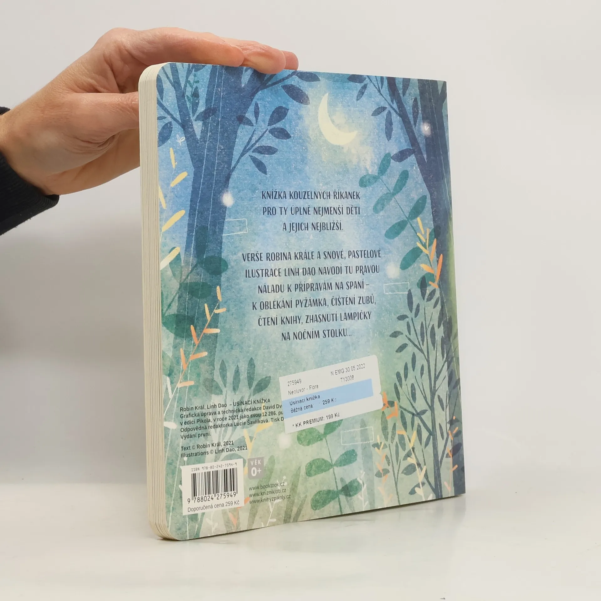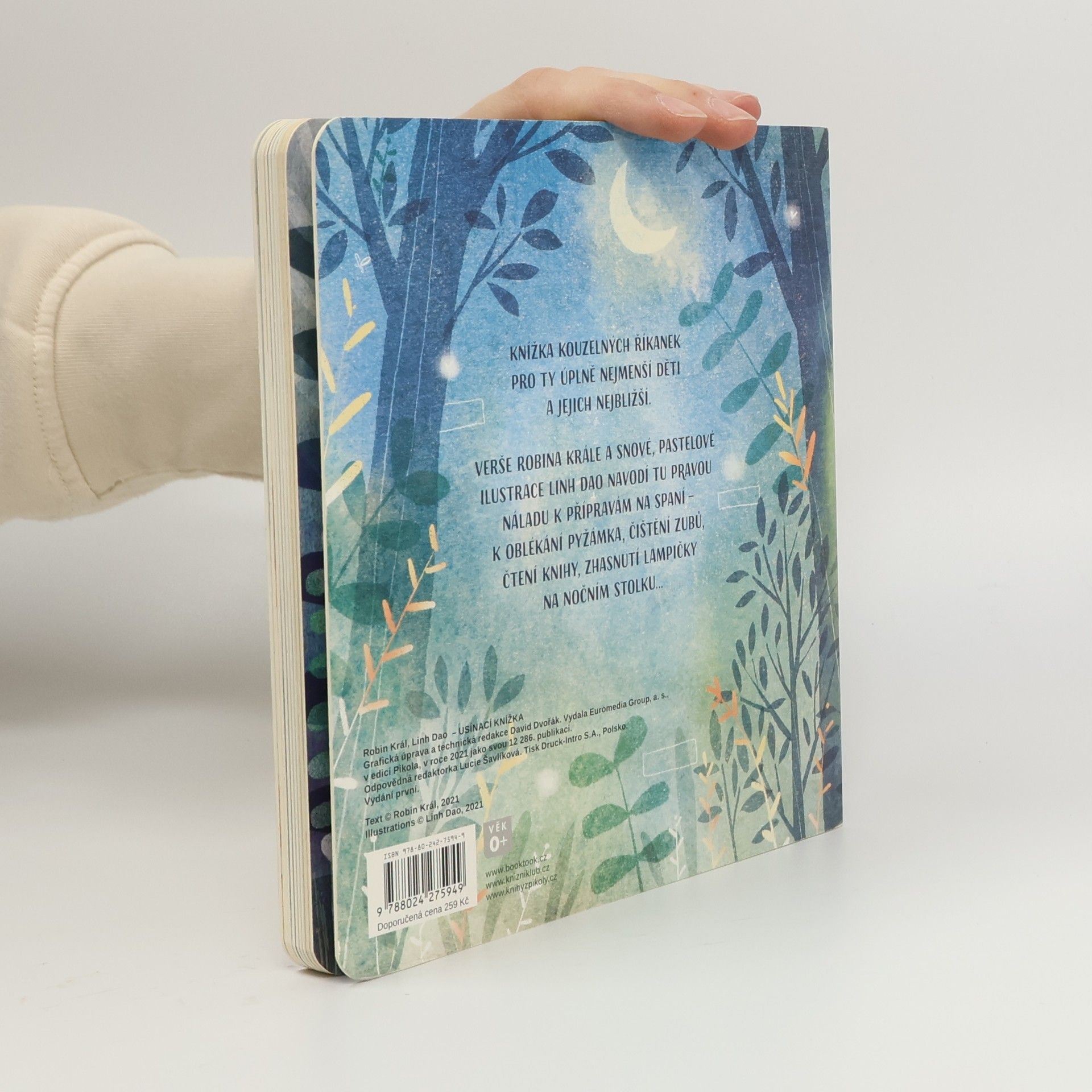 Udělejte svým dětem usínání ještě krásnější! Některé zavřou oči hned, jiným to trochu trvá. Všechny děti ale ocení, když se před spaním otevře knížka a něco hezkého se přečte. Třeba básničky, které navodí tu správnou atmosféru. Mluví se v nich o čištění zubů, navlékání do pyžama, tmě, choulení do peřin, mamince a tatínkovi… To vše v lehkých, vtipných verších doprovázených nádhernými, snovými ilustracemi výtvarnice Linh Dao. Usínací knížka by neměla chybět u žádné dětské postýlky.