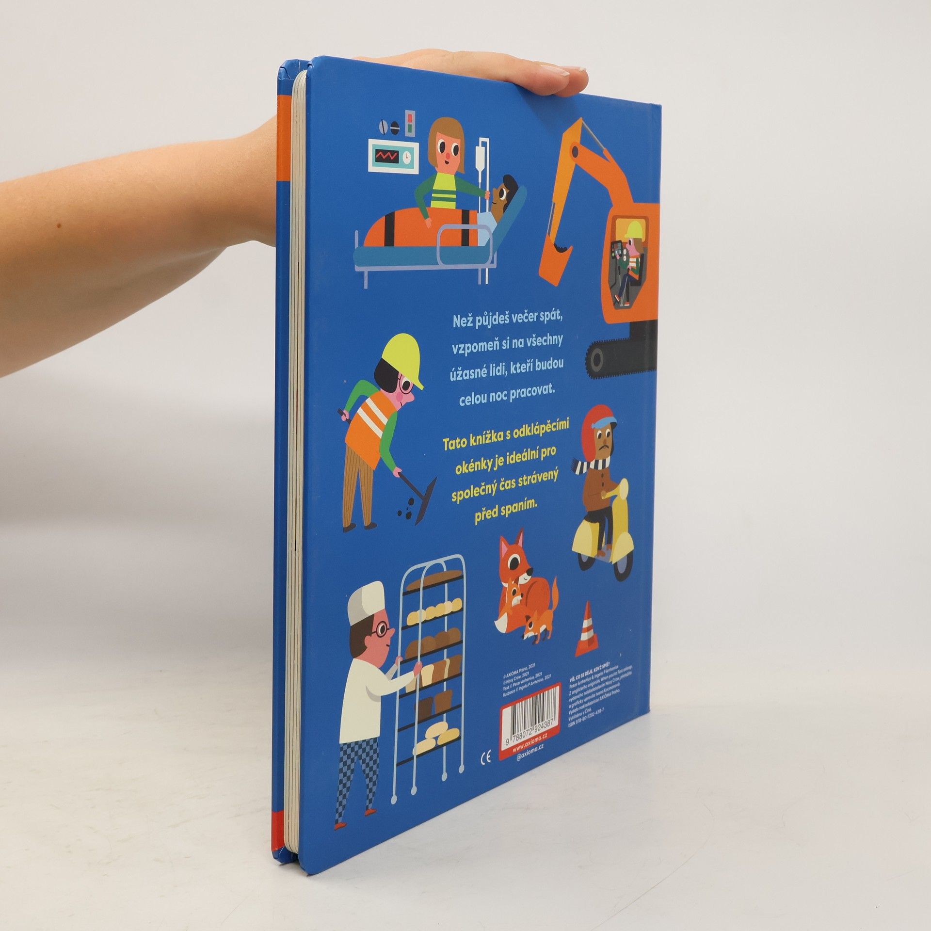 Velké knížkové leporelo s odklápěcími okénky na každé stránce. V noci pracují nejrůznější lidé, od pekařů po lékaře, od strojvedoucích po silničáře, od rybářů na moři po hlídače v umělecké galerii. Nahlédněte společně s dětmi do pece v pekárně, zjistěte, jestli rybářskélodě ulovily ryby nebo nahlédněte do rušné nemocnice. Zábavná knížka o tom, že v noci celý svět nespí, ale je plný barev, zvuků a vůní je ideální pro společně strávené chvíle před spaním. Nezaměnitelné ilustrace Ingely P. Arrhenius, oceňované ilustrátorky bestsellerů jako například leporel KUK!, která také najdete v našem nakladatelství, doplňuje veršovaný text.