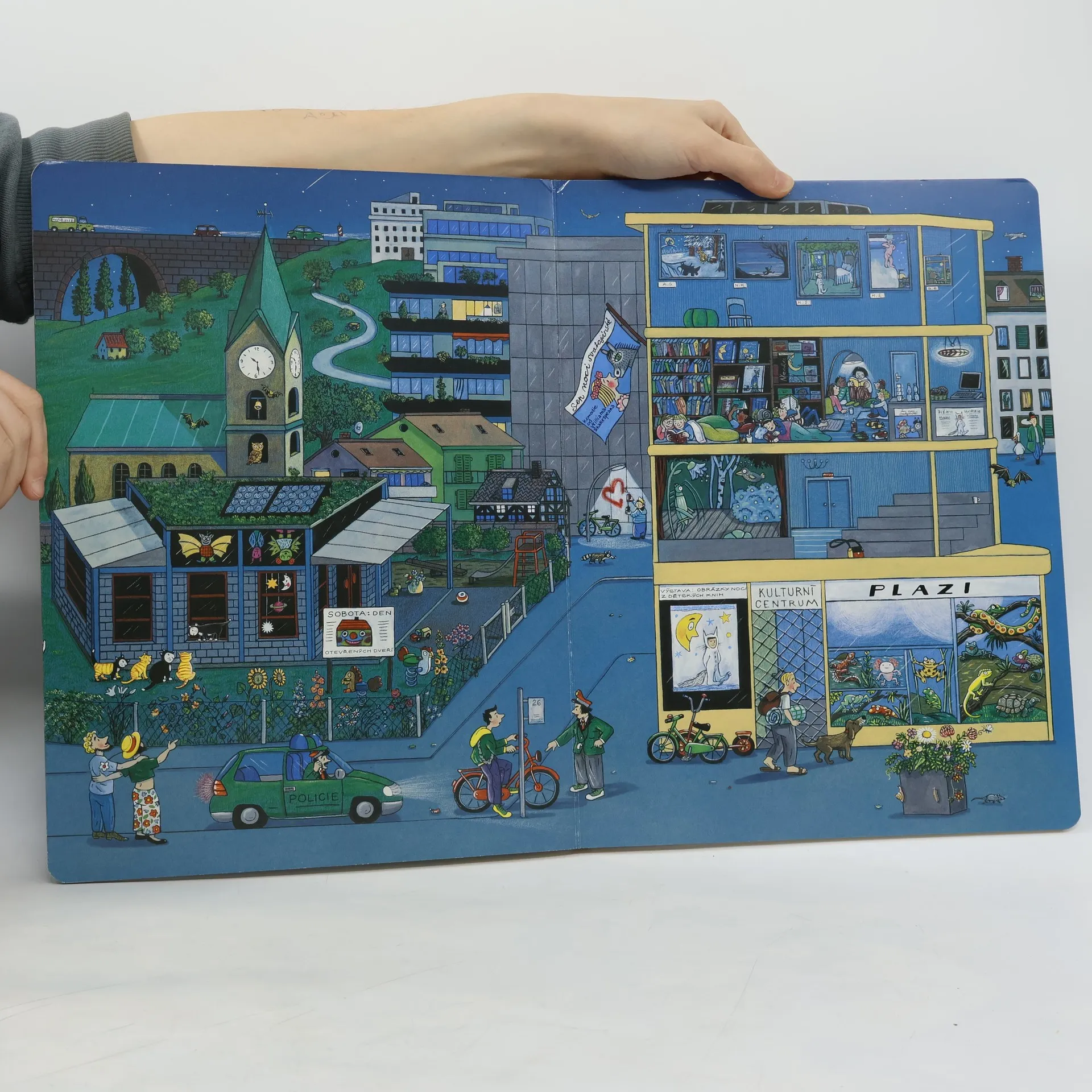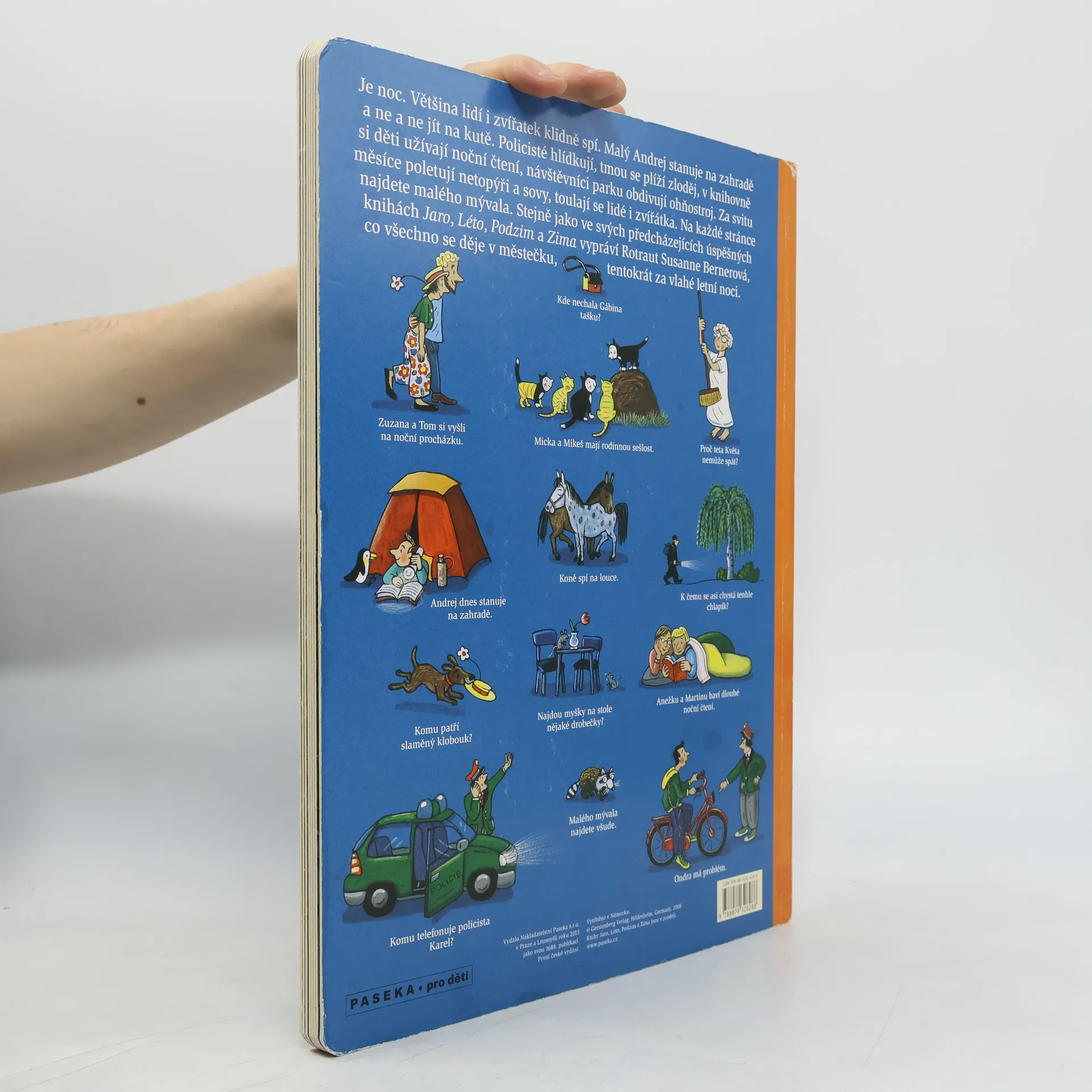Je noc. Lidé i zvířata klidně spí. Ale ne všichni. Malý Andrej stanuje na zahradě a ne a ne jít na kutě. Policisté hlídkují, v knihovně si děti užívají noční čtení, návštěvníci parku obdivují ohňostroj. Za svitu měsíce poletují netopýři a sovy, toulají se lidé i zvířátka. Na každé stránce najdete malého mývala. A tmou se plíží zloděj… Stejně jako v předcházejících úspěšných knihách Jaro, Léto, Podzim a Zima vypráví Rotraut Susanne Bernerová svými vtipnými obrázky, co všechno se děje v městečku, tentokrát za vlahé letní noci. Knížka podporuje pozorovací schopnosti a podněcuje fantazii, rozvíjí jazyk a rozšiřuje slovní zásobu.