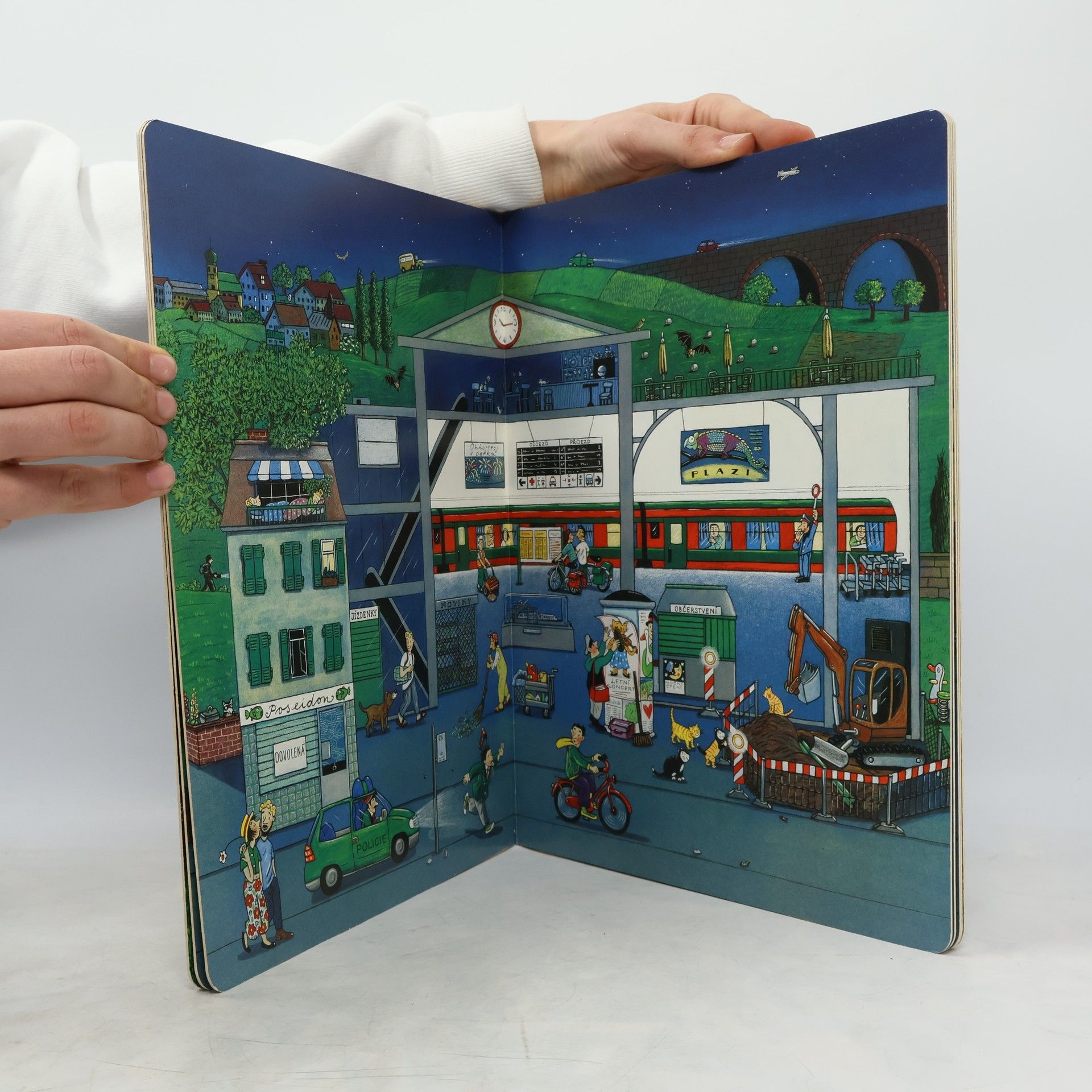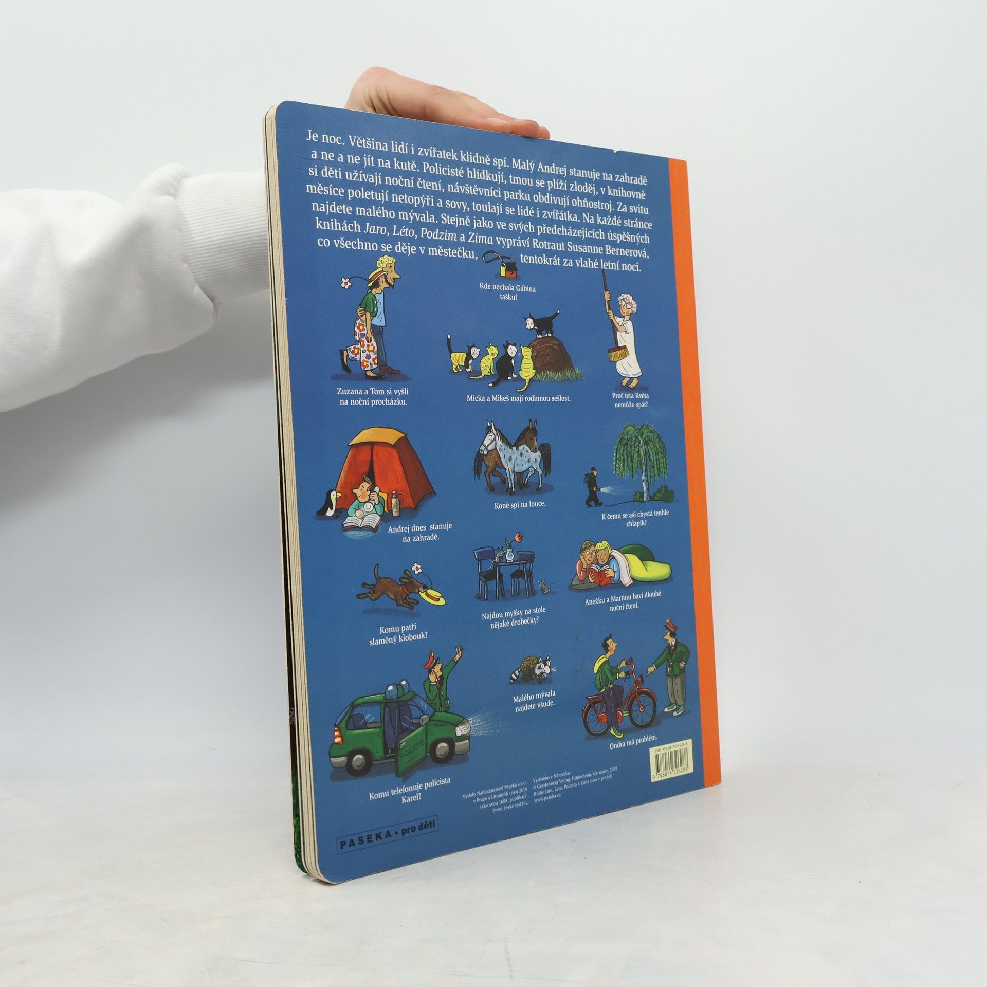 Je noc. Lidé i zvířata klidně spí. Ale ne všichni. Malý Andrej stanuje na zahradě a ne a ne jít na kutě. Policisté hlídkují, v knihovně si děti užívají noční čtení, návštěvníci parku obdivují ohňostroj. Za svitu měsíce poletují netopýři a sovy, toulají se lidé i zvířátka. Na každé stránce najdete malého mývala. A tmou se plíží zloděj… Stejně jako v předcházejících úspěšných knihách Jaro, Léto, Podzim a Zima vypráví Rotraut Susanne Bernerová svými vtipnými obrázky, co všechno se děje v městečku, tentokrát za vlahé letní noci. Knížka podporuje pozorovací schopnosti a podněcuje fantazii, rozvíjí jazyk a rozšiřuje slovní zásobu.