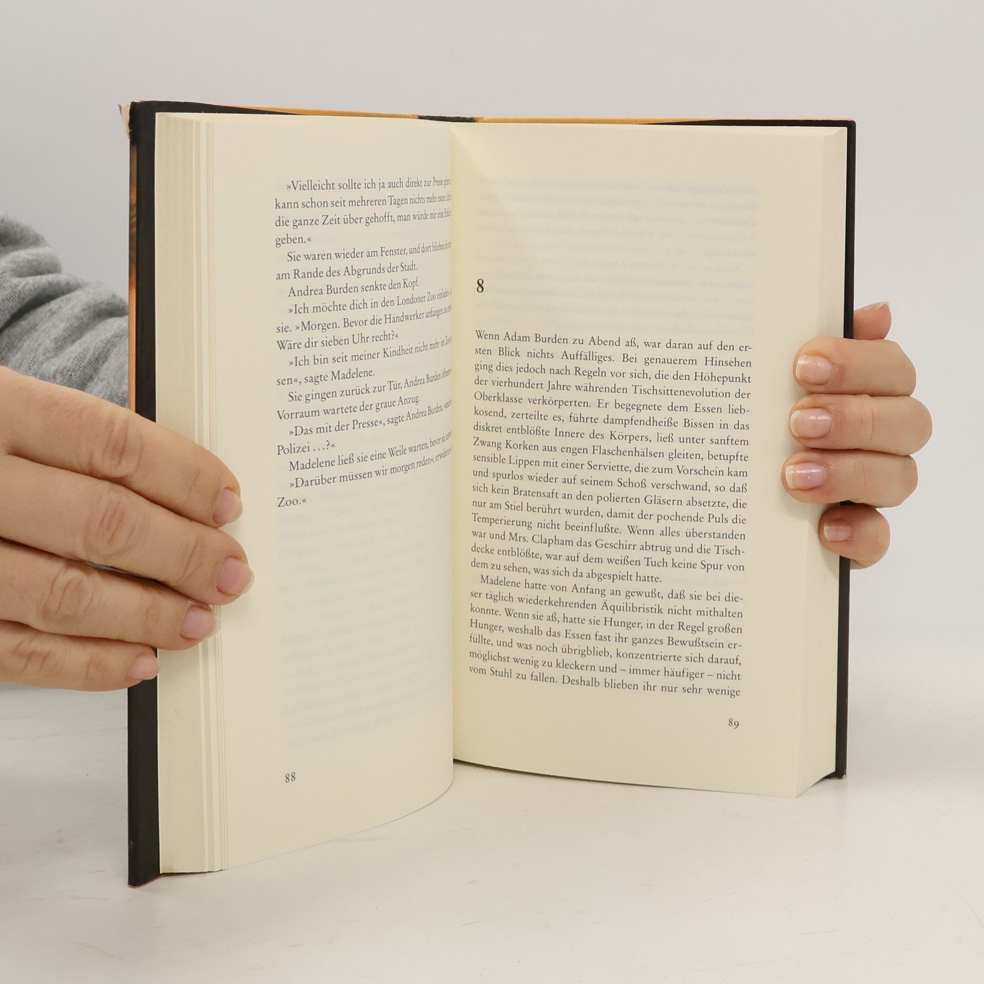 Ein Affe nähert sich London. Auf einem Segelboot übernimmt er plötzlich das Ruder und rast in krachender Fahrt mitten durch die Nobelboote des königlichen Yachtclubs. Erasmus, so der Name des hundertfünfzig Kilo schweren Helden, wird aufgegriffen und Adam Burden, dem Direktor des Londoner Instituts für Verhaltensforschung, übergeben. Dort begegnet er Adams schöner Frau, schaut ihr tief in die Augen und reicht ihr – als Geschenk – einen Pfirsich. Madelene versucht daraufhin den heimlichen Experimenten ihres Mannes auf die Spur zu kommen und beschließt, Erasmus zu retten. Es beginnt eine rasante Verfolgungsjagd, eine ungewöhnliche Liebesgeschichte und ein philosophischer Thriller höchsten Ranges. Spannend von der ersten bis zur letzten Seite, voller klugem Witz und groteskem Humor.
