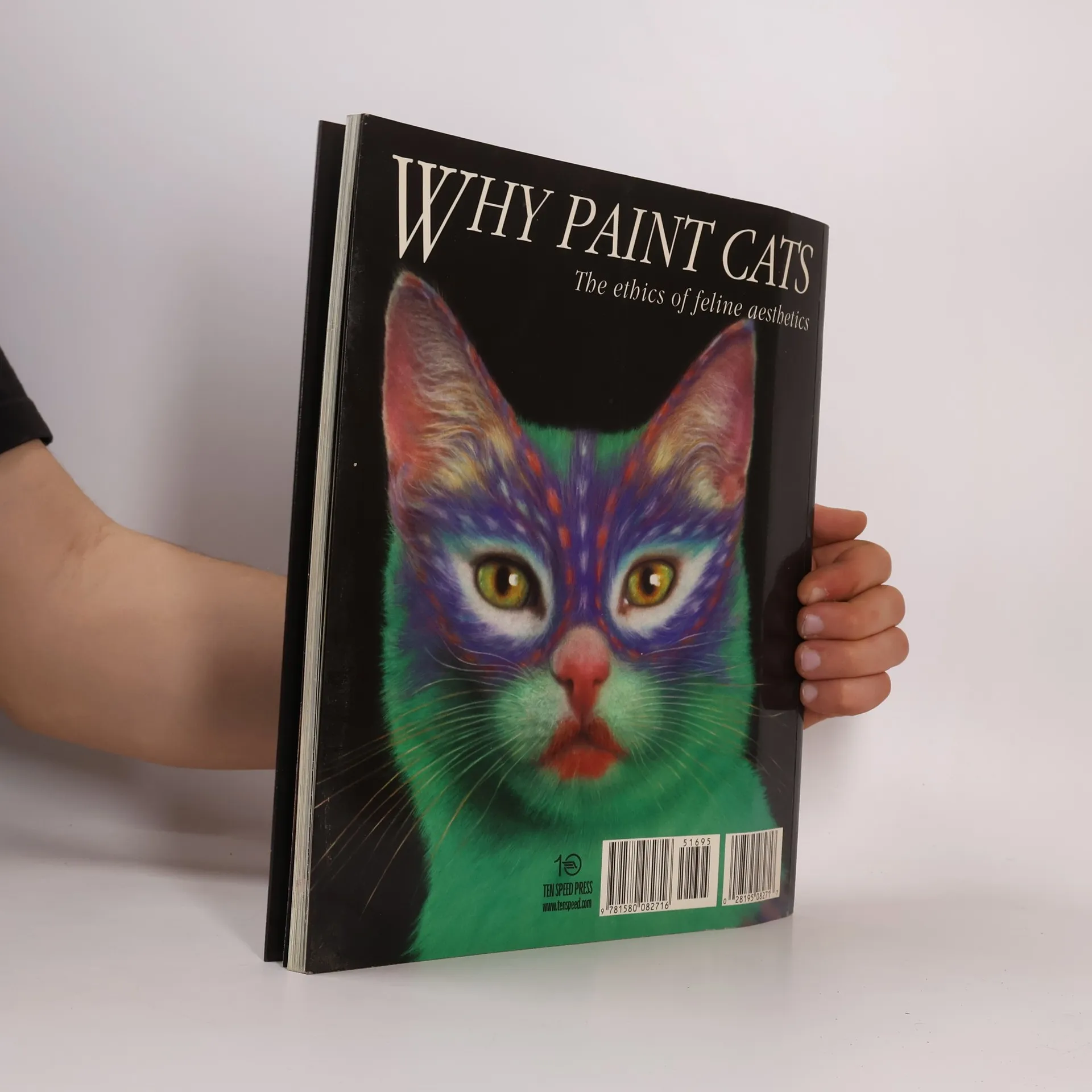 A collection of photographs depicting twenty-two various artistic styles painted on cats along with details of artistic trends and ethical questions on the rights of cat owners.